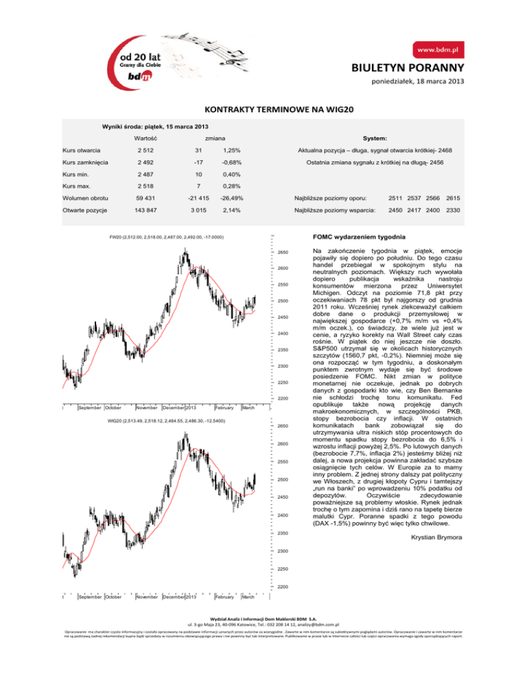 BIULETYN PORANNY poniedziałek, 18 marca 2013 KONTRAKTY TERMINOWE NA WIG20 Wyniki środa: piątek, 15 marca 2013 Wartość zmiana System: Kurs otwarcia 2 512 31 1,25% Aktualna pozycja – długa, sygnał otwarcia krótkiej- 2468 Kurs zamknięcia 2 492 -17 -0,68% Ostatnia zmiana sygnału z krótkiej na długą- 2456 Kurs min. 2 487 10 0,40% Kurs max. 2 518 7 0,28% Wolumen obrotu 59 431 -21 415 -26,49% Otwarte pozycje 143 847 3 015 2,14% Najbliższe poziomy oporu: 2511 2537 2566 2615 Najbliższe poziomy wsparcia: 2450 2417 2400 2330 FOMC wydarzeniem tygodnia FW20 (2,512.00, 2,518.00, 2,487.00, 2,492.00, -17.0000) 2650 2600 2550 2500 2450 2400 2350 2300 2250 2200 t September October November December 2013 February March A WIG20 (2,513.49, 2,518.12, 2,484.55, 2,486.30, -12.5400) 2650 2600 2550 2500 2450 2400 Na zakończenie tygodnia w piątek, emocje pojawiły się dopiero po południu. Do tego czasu handel przebiegał w spokojnym stylu na neutralnych poziomach. Większy ruch wywołała dopiero publikacja wskaźnika nastroju konsumentów mierzona przez Uniwersytet Michigen. Odczyt na poziomie 71,8 pkt przy oczekiwaniach 78 pkt był najgorszy od grudnia 2011 roku. Wcześniej rynek zlekceważył całkiem dobre dane o produkcji przemysłowej w największej gospodarce (+0,7% m/m vs +0,4% m/m oczek.), co świadczy, że wiele już jest w cenie, a ryzyko korekty na Wall Street cały czas rośnie. W piątek do niej jeszcze nie doszło. S&P500 utrzymał się w okolicach historycznych szczytów (1560,7 pkt, -0,2%). Niemniej może się ona rozpocząć w tym tygodniu, a doskonałym punktem zwrotnym wydaje się być środowe posiedzenie FOMC. Nikt zmian w polityce monetarnej nie oczekuje, jednak po dobrych danych z gospodarki kto wie, czy Ben Bernanke nie schłodzi trochę tonu komunikatu. Fed opublikuje także nową projekcję danych makroekonomicznych, w szczególności PKB, stopy bezrobocia czy inflacji. W ostatnich komunikatach bank zobowiązał się do utrzymywania ultra niskich stóp procentowych do momentu spadku stopy bezrobocia do 6,5% i wzrostu inflacji powyżej 2,5%. Po lutowych danych (bezrobocie 7,7%, inflacja 2%) jesteśmy bliżej niż dalej, a nowa projekcja powinna zakładać szybsze osiągnięcie tych celów. W Europie za to mamy inny problem. Z jednej strony dalszy pat polityczny we Włoszech, z drugiej kłopoty Cypru i tamtejszy „run na banki” po wprowadzeniu 10% podatku od depozytów. Oczywiście zdecydowanie poważniejsze są problemy włoskie. Rynek jednak trochę o tym zapomina i dziś rano na tapetę bierze malutki Cypr. Poranne spadki z tego powodu (DAX -1,5%) powinny być więc tylko chwilowe. 2350 Krystian Brymora 2300 2250 2200 t September October November December 2013 February March Wydział Analiz i Informacji Dom Maklerski BDM S.A. ul. 3‐go Maja 23, 40‐096 Katowice, Tel.: 032 208 14 12, [email protected] Opracowanie ma charakter czysto informacyjny i zostało opracowany na podstawie informacji uznanych przez autorów za wiarygodne . Zawarte w nim komentarze są subiektywnymi poglądami autorów. Opracowanie i zawarte w nim komentarze nie są podstawą żadnej rekomendacji kupna bądź sprzedaży w rozumieniu obowiązującego prawa i nie powinny być tak interpretowane. Publikowanie w prasie lub w Internecie całości lub części opracowania wymaga zgody sporządzających raport. BIULETYN PORANNY poniedziałek, 18 marca 2013 RYNEK AKCJI Wyniki sesji: piątek, 15 marca 2013 52 tygodnie Indeks Kurs otwarcia Kurs zamknięcia Zmiana [%] Kurs min. Kurs max. Zakres wahań Wartość obrotów [mln PLN] 1 964,1 Kurs max. Kurs min. WIG20 2 634,2 2 009,3 2 513,49 2 486,30 -0,50% 2 484,55 2 518,12 33,6 sWIG80 11 280,6 8 975,7 11 238,07 11 228,39 -0,03% 11 197,94 11 249,40 51,5 32,8 mWIG40 2 720,9 2 145,0 2 694,69 2 708,28 0,76% 2 693,56 2 720,89 27,3 200,2 WIG PL 48 505,5 36 478,4 47 789,70 47 522,10 -0,18% 47 522,10 47 789,70 267,6 - WIG 48 222,7 36 483,4 47 443,30 47 125,93 -0,21% 47 088,82 47 519,43 430,6 2 245,8 Spółka Cena [PLN] Mkt Cap [mln PLN] 45,00 BANK HANDLOWY BOGDANKA BORYSZEW zmiana % zmiana % względem WIG20 dzienna 1M 3M 6M dzienna 1M 3M 6M 3 735 0,0% 4,3% 1,4% -1,3% 0,5% 3,9% 4,8% -4,7% 96,50 12 609 -1,9% 8,3% -3,4% 12,2% -1,4% 7,9% 0,1% 8,8% 129,10 4 391 0,1% -4,9% -6,4% 3,8% 0,6% -5,3% -3,0% 0,4% 0,47 1 061 -4,1% -4,1% -13,0% -16,1% -3,6% -4,5% -9,5% -19,4% BRE 350,00 14 749 1,3% 5,7% 6,1% 10,9% 1,8% 5,3% 9,5% 7,6% EUROCASH 56,25 7 762 3,5% 15,9% 21,9% 50,3% 4,0% 15,4% 25,3% 47,0% ASSECOPOL GTC 8,66 2 766 -1,4% 6,7% -9,3% 13,2% -0,9% 6,2% -5,8% 9,8% JSW 96,50 11 330 0,7% -1,1% 7,3% -2,5% 1,2% -1,5% 10,8% -5,9% -12,0% KERNEL 61,60 4 908 -0,3% -10,1% -10,1% -8,6% 0,2% -10,5% -6,7% KGHM 169,60 33 920 -2,2% -9,5% -11,9% 11,3% -1,7% -9,9% -8,5% 7,9% LOTOS 43,50 5 649 -2,1% 10,4% 3,8% 38,8% -1,6% 10,0% 7,3% 35,5% PEKAO 164,20 43 098 2,0% 3,2% 1,0% 2,2% 2,5% 2,8% 4,5% -1,2% PGE 17,86 33 394 0,8% 3,7% -3,1% -4,3% 1,3% 3,2% 0,4% -7,7% PGNIG 5,92 34 928 -1,2% 3,3% 18,6% 45,1% -0,7% 2,9% 22,1% 41,7% PKNORLEN 54,75 23 417 -0,6% 7,5% 5,3% 21,8% -0,1% 7,0% 8,8% 18,5% PKOBP 35,01 43 762 -1,4% -1,0% -2,3% -4,5% -0,9% -1,4% 1,2% -7,8% PZU 415,50 35 879 -0,2% 1,4% -4,0% 14,0% 0,3% 1,0% -0,5% 10,6% SYNTHOS 6,80 8 998 1,0% 19,7% 22,5% 15,4% 1,5% 19,3% 26,0% 12,1% TAURON 4,51 7 904 -3,2% -2,2% -3,0% -11,0% -2,7% -2,6% 0,5% -14,4% TPSA 6,80 9 082 -0,9% -6,8% -44,7% -59,6% -0,4% -7,3% -41,2% -62,9% Komentarz po sesji Komentarz przed sesją: Brak konsekwencji Negatywne nastroje Mocna seria czwartkowa wraz z udanym zakończeniem sesji w Stanach dawała nam dziś rano argumenty za kontynuacją wzrostów, lub przynajmniej za stabilizacją powyżej 2500 punktów. Przez pierwsze godziny handlu WIG20 utrzymywał się koło 2510 punktów, co było zachowaniem dość pozytywnym, choć niepokój wprowadzało to, że największe obroty koncentrowały na sobie akcje KGHM, które były wyprzedawane i drugi dzień z rzędu zachowywały się gorzej od indeksu. Niestety w wyniku słabszego rozpo