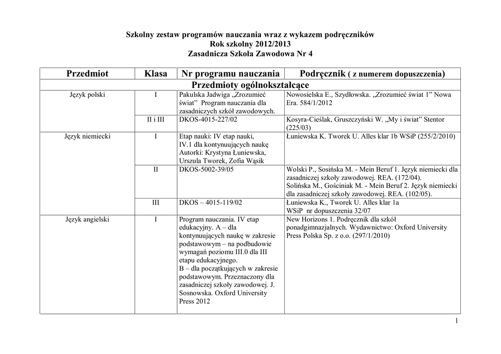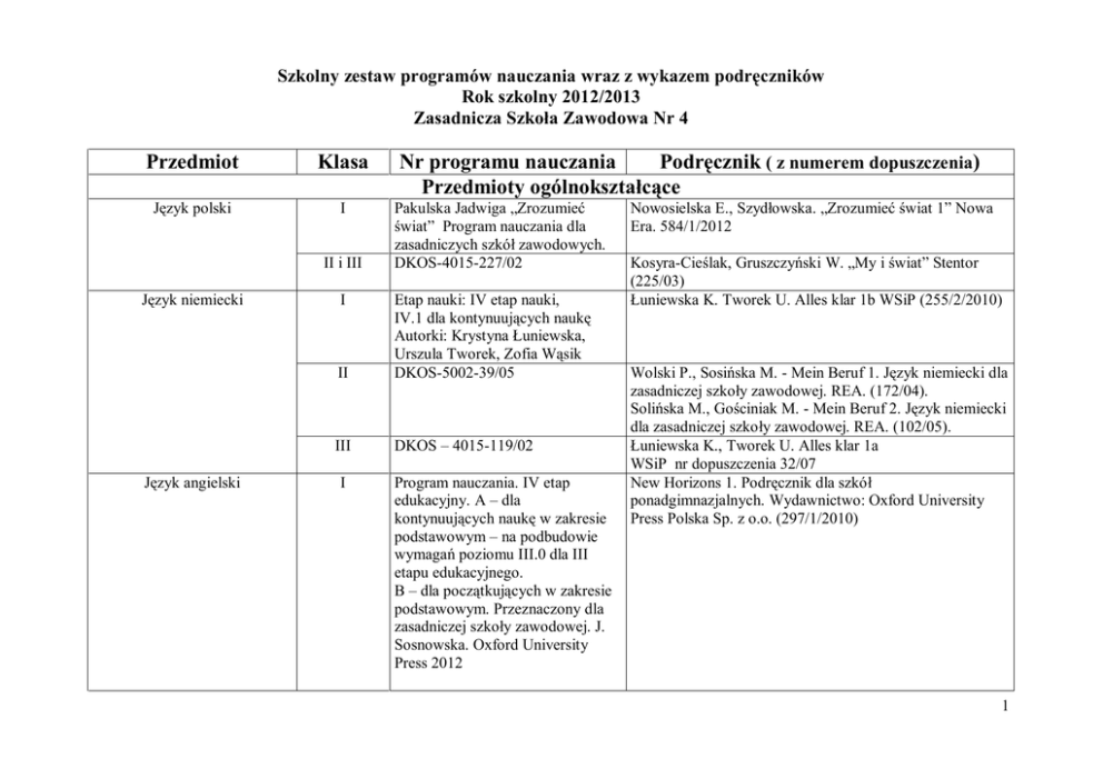 Przedmiot Klasa Nr programu nauczania Przedmioty ogólnokształcące