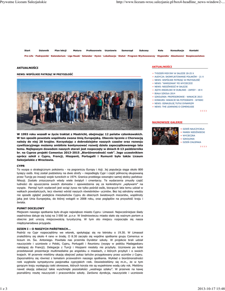 Prywatne Liceum Salezjańskie 1z3 Start Dziennik http://www.liceum-wroc.salezjanie.pl/box4-headline_news-window2-... Plan lekcji Matura Profesorowie Uczniowie Samorząd Sukcesy Koła Konsultacje Kontakt Pro Life · Podręczniki · Kalendarium · Liga Nauki · Sztandar · Hymn · Lokalizacja · Statut · Program Wychowawczy · Stypendia · Absolwenci · Bezpieczeństwo AKTUALNOŚCI NEWS: WSPÓLNIE PATRZĄC W PRZYSZŁOŚĆ AKTUALNOŚCI TYDZIEŃ MISYJNY W SALEZIE 20-25 X AUDYCJA: SKONFLIKTOWANIE POLAKÓW - 21 X NEWS: WSPÓLNIE PATRZĄC W PRZYSZŁOŚĆ NEWS: "WARSZAWA" PO WYCIECZCE NEWS: NIEDŹWIEDŹ W SALEZIE JĘZYK ANGIELSKI W DUBLINIE - ZAPISY - 18 X BIAŁA SZKOŁA 2014 SZKOLENIA: PROFESOROWIE - WAKACJE 2013 KONKURS: WAKACJE NA FOTOGRAFII - WYNIKI NEWS: ODNAJDUJĘ TUTAJ DYNAMIZM NEWS: THE LEARNING O COMENIUSIE NAJNOWSZE GALERIE DZIEŃ NAUCZYCIELA W 1993 roku wszedł w życie traktat z Mastricht, obejmując 12 państw członkowskich. W ten sposób powstała wspólnota zwana Unią Europejską. Obecnie łącznie z Chorwacją należy do niej 28 krajów. Korzystając z dobrodziejstw naszych czasów oraz rozwoju cywilizacyjnego możemy ambitnie kontynuować rozwój dzieła zapoczątkowanego lata temu. Najlepszym dowodem naszych starań jest rozpoczęty w dniach 8-13 października br. na Cyprze projekt Comenius 2013-2015 „Bioróżnorodność rzek”. Jego uczestnikiem oprócz szkół z Cypru, Francji, Hiszpanii, Portugalii i Rumunii było także Liceum Salezjańskie z Wrocławia. MAREK NIEDŹWIECKI WYCIECZKA SZKOLENIA DZIEŃ CHŁOPAKA CYPR To wyspa o strategicznym położeniu - na pograniczu Europy i Azji. Jej populacja sięga około 800 tysięcy osób. Kraj został podzielony na dwie strefy – niepodległy Cypr i część północną okupowaną przez Turcję po inwazji wojsk tureckich w 1974. Granica przebiega wewnątrz samej stolicy państwaNikozji. Zostało zniszczonych wtedy wiele świątyń i cmentarzy. Te wydarzenia zmusiły część ludności do opuszczenia swoich domostw i opowiedzenia się za konkretnymi „wpływami” na wyspie. Pamięć tych wydarzeń jest wciąż żywa nie tylko pośród osób, biorących lata temu udział w walkach powstańczych, lecz również wśród naszych rówieśników- uczniów. Bez tej odrobiny wiedzy nie sposób zgłębić podejścia mieszkańców Cypru do obecnych światowych mocarstw, wspólnoty jaką jest Unia Europejska, do której wstąpili w 2008 roku, oraz poglądów na przyszłość kraju i świata. PUNKT DOCELOWY Miejscem naszego spotkania było drugie największe miasto Cypru- Limassol. Najwcześniejsze ślady osadnictwa datuje się tutaj na 3 000 lat .p.n.e W średniowieczu miasto stało się ważnym portem a obecnie jest uroczą miejscowością turystyczną. W tym oto miejscu rozpoczęła się nasza międzynarodowa przygoda. DZIEN I – O NASZYCH PAŃSTWACH… Podróż na Cypr rozpoczęliśmy we wtorek, spotykając się na lotnisku o 19.30. W Limassol znaleźliśmy się około 4 rano w środę. O 8.30 zaczęło się wspólne spotkanie grupy Comenius w liceum im. Św. Antoniego. Powitała nas przemiła Dyrektor szkoły. W projekcie brali udział nauczyciele i uczniowie z Polski, Cypru, Portugalii i Reunionu (wyspy w pobliżu Madagaskaru należącej do Francji). Delegacje z Turcji i Hiszpanii niestety nie przybyły. Uczniowie po kolei przedstawiali prezentacje multimedialne po angielsku o miastach, z których przybyli i o swoich krajach. W przerwie mieliśmy okazję obejrzeć pokaz tańców przygotowany przez uczniów z Cypru. Zapoznaliśmy się również z tematem przewodnim naszego spotkania. Wykład o bioróżnorodności rzek wygłosiła sympatyczna pasjonatka cypryjskich rzek. Dowiedzieliśmy się m.in., że w tym gorącym kraju występują rzeki okresowe, których koryta nie są wypełnione wodą cały rok. Mieliśmy nawet okazję zobaczyć takie wyschnięte pozostałości „wodnego szlaku”. W przerwie na kawę poznaliśmy resztę nauczycieli i pracowników szkoły. Zarówno dyrekcja, nauczyciele i uczniowie 2013-10-17 15:48 Prywatne Liceum Salezjańskie http://www.liceum-wroc.salezjanie.pl/box4-headline_news-window2-... przyjęli nas bardzo serdecznie. Wieczorem zebraliśmy się wszyscy na uroczystej inauguracji naszego projektu. Wspólnemu ucztowaniu towarzyszyły długie rozmowy i żarty oraz energiczne tańce „w kółeczku”. Czas uświetniała nam muzyka wykonywana na żywo oraz śpiewy. Atmosfera była wyjątkowa. Po przyjęciu udaliśmy się na zasłużony odpoczynek. DZIEŃ II – SŁONECZNYM SZLAKIEM CZASU Czwartkowym elementem integracyjnym była wycieczka. Najpierw dojechaliśmy do zamku Kolossi –ważnego punktu strategicznego wybudowanego prawdopodobnie w 1210 roku. Ciekawostką była informacja dotycząca lokalnego alkoholu – Commandarii. Jest to bowiem najstarsza zarejestrowana marka wina na świecie. Obecna budowla pochodzi jednak z XV wieku. Produkowane tu wino było transportowane do całej Europy a w szczególności pokochano je w Austrii. Następnie udaliśmy się do miasta-królestwa Kourion (4500-3900 p.n.e). Pozostałości kompleksu wprawiają w zachwyt nawet największych ignorantów. Dom Achillesa z połowy IV wieku posiada kilka pokoi z niesamowitymi, misternie wykonanymi mozaikami. Odwiedziliśmy również dom gladiatorów z mozaiką przedstawiająca scenę walki – rzadko spotykany motyw na Cyprze. Następnie teatr, bazylikę oraz miejsce kultu Apollina. W drodze powrotnej przespacerowaliśmy się przez małą, uroczą wioskę, która najlepiej oddawała słoneczny charakter kraju. DZIEŃ III - WODNY ŚWIAT Z BLISKA Piątek był momentem ścisłej realizacji tematu naszego projektu. Wybraliśmy się nad rzekę. Podzieleni w trzy grupy poławialiśmy i identyfikowaliśmy bezkręgowce. Zapisywaliśmy wyniki pomiaru natlenienia wody, zawartości azotu czy fosforu oraz szybkości przepływu wody. Mogliśmy przyglądać się maleńkim, rzecznym mieszkańcom przy pomocy mikroskopu. Dzień tak jak wszystkie 