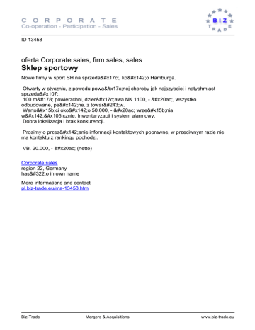 ID 13458 oferta Corporate sales, firm sales, sales Sklep sportowy Nowe firmy w sport SH na sprzedaż, koło Hamburga. Otwarty w styczniu, z powodu poważnej choroby jak najszybciej i natychmiast sprzedać. 100 m² powierzchni, dzierżawa NK 1100, - €, wszystko odbudowane, pełne. z towarów. Wartości około 50.000, - € września włącznie. Inwentaryzacji i system alarmowy. Dobra lokalizacja i brak konkurencji. Prosimy o przesłanie informacji kontaktowych poprawne, w przeciwnym razie nie ma kontaktu z rankingu pochodzi. VB. 20.000, - € (netto) Corporate sales region 22, Germany hasło in own name More informations and contact pl.biz-trade.eu/ma-13458.htm Biz-Trade Mergers & Acquisitions www.biz-trade.eu