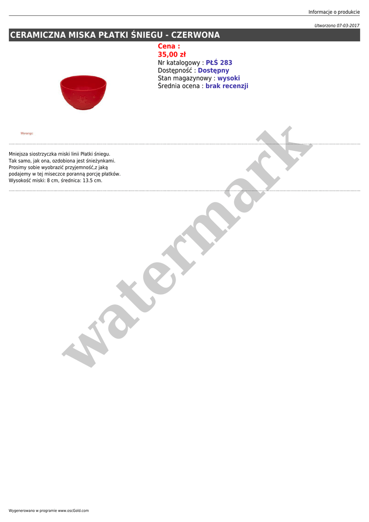 Informacje o produkcie Utworzono 07-03-2017 CERAMICZNA MISKA PŁATKI ŚNIEGU - CZERWONA Cena : 35,00 zł er m ar k Nr katalogowy : PŁŚ 283 Dostępność : Dostępny Stan magazynowy : wysoki Średnia ocena : brak recenzji w at Mniejsza siostrzyczka miski linii Płatki śniegu. Tak samo, jak ona, ozdobiona jest śnieżynkami. Prosimy sobie wyobrazić przyjemność,z jaką podajemy w tej miseczce poranną porcję płatków. Wysokość miski: 8 cm, średnica: 13.5 cm. Wygenerowano w programie www.oscGold.com