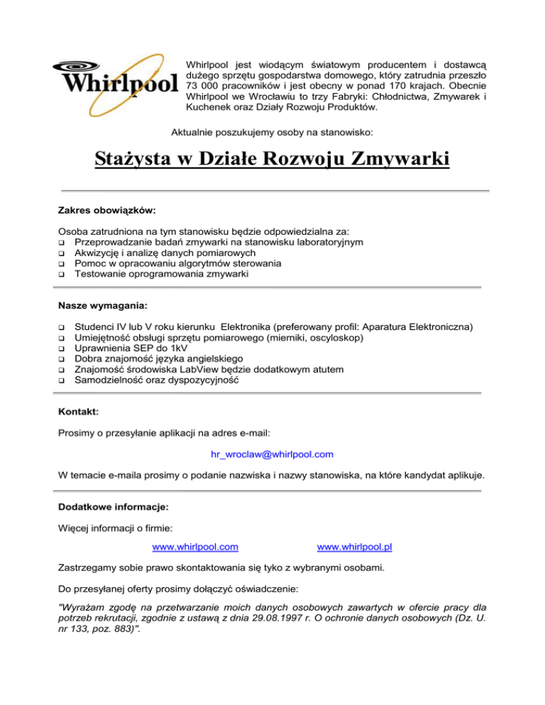 Whirlpool jest wiodącym światowym producentem i dostawcą dużego sprzętu gospodarstwa domowego, który zatrudnia przeszło 73 000 pracowników i jest obecny w ponad 170 krajach. Obecnie Whirlpool we Wrocławiu to trzy Fabryki: Chłodnictwa, Zmywarek i Kuchenek oraz Działy Rozwoju Produktów. Aktualnie poszukujemy osoby na stanowisko: Stażysta w Działe Rozwoju Zmywarki Zakres obowiązków: Osoba zatrudniona na tym stanowisku będzie odpowiedzialna za: Przeprowadzanie badań zmywarki na stanowisku laboratoryjnym Akwizycję i analizę danych pomiarowych Pomoc w opracowaniu algorytmów sterowania Testowanie oprogramowania zmywarki Nasze wymagania: Studenci IV lub V roku kierunku Elektronika (preferowany profil: Aparatura Elektroniczna) Umiejętność obsługi sprzętu pomiarowego (mierniki, oscyloskop) Uprawnienia SEP do 1kV Dobra znajomość języka angielskiego Znajomość środowiska LabView będzie dodatkowym atutem Samodzielność oraz dyspozycyjność Kontakt: Prosimy o przesyłanie aplikacji na adres e-mail: [email protected] W temacie e-maila prosimy o podanie nazwiska i nazwy stanowiska, na które kandydat aplikuje. Dodatkowe informacje: Więcej informacji o firmie: www.whirlpool.com www.whirlpool.pl Zastrzegamy sobie prawo skontaktowania się tyko z wybranymi osobami. Do przesyłanej oferty prosimy dołączyć oświadczenie: "Wyrażam zgodę na przetwarzanie moich danych osobowych zawartych w ofercie pracy dla potrzeb rekrutacji, zgodnie z ustawą z dnia 29.08.1997 r. O ochronie danych osobowych (Dz. U. nr 133, poz. 883)".
