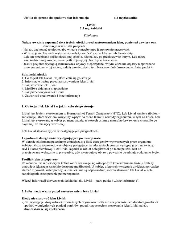 Ulotka dołączona do opakowania: informacja dla użytkownika Livial 2,5 mg, tabletki Tibolonum Należy uważnie zapoznać się z treścią ulotki przed zastosowaniem leku, ponieważ zawiera ona informacje ważne dla pacjenta. - Należy zachować tę ulotkę, aby w razie potrzeby móc ją ponownie przeczytać. - W razie jakichkolwiek wątpliwości należy zwrócić się do lekarza lub farmaceuty. - Lek ten przepisano ściśle określonej osobie. Nie należy go przekazywać innym. Lek może zaszkodzić innej osobie, nawet jeśli objawy jej choroby są takie same. - Jeśli u pacjenta wystąpią jakiekolwiek objawy niepożądane, w tym wszelkie objawy niepożądane niewymienione w tej ulotce, należy powiedzieć o tym lekarzowi lub farmaceucie. Patrz punkt 4. Spis treści ulotki: 1. Co to jest lek Livial i w jakim celu się go stosuje 2. Informacje ważne przed zastosowaniem leku Livial 3. Jak stosować lek Livial 4. Możliwe działania niepożądane 5. Jak przechowywać lek Livial 6. Zawartość opakowania i inne informacje 1. Co to jest lek Livial i w jakim celu się go stosuje Livial jest lekiem stosowanym w Hormonalnej Terapii Zastępczej (HTZ). Lek Livial zawiera tibolon – substancję, która wywiera korzystny wpływ na różne tkanki i narządy organizmu, w tym na kości. Lek Livial jest stosowany u kobiet po menopauzie, u których ostatnie naturalne krwawienie wystąpiło co najmniej 12 miesięcy wcześniej. Lek Livial stosowany jest w następujących przypadkach: Łagodzenie dolegliwości występujących po menopauzie W okresie okołomenopauzalnym zmniejsza się ilość estrogenów wytwarzanych przez organizm kobiety. Może to powodować objawy polegające na uderzeniach gorąca występujących na twarzy, szyi i klatce piersiowej. Lek Livial łagodzi u kobiet dolegliwości po menopauzie. Jest on przepisywany wyłącznie w przypadku, gdy występujące objawy poważnie utrudniają codzienne życie. Profilaktyka osteoporozy Po menopauzie u niektórych kobiet może rozwinąć się osteoporoza (zrzeszotnienie kości). Należy omówić z lekarzem wszelkie dostępne możliwości. U kobiet, u których występuje zwiększone ryzyko złamań z powodu osteoporozy, a inne leki nie są odpowiednie, można stosować lek Livial w celu zapobiegania osteoporozie po menopauzie. Więcej informacji dotyczących działania leku Livial – patrz punkt 6 „Inne informacje”. 2. Informacje ważne przed zastosowaniem leku Livial Kiedy nie stosować leku Livial: - jeśli występuje którykolwiek z poniższych czynników. Jeśli nie ma pewności, co do któregokolwiek spośród wymienionych poniżej punktów, przed rozpoczęciem stosowania leku Livial należy skontaktować się z lekarzem. 1 Kiedy nie stosować leku Livial: • Jeśli pacjentka ma uczulenie na tibolon lub którykolwiek z pozostałych składników tego leku (wymienionych w punkcie 6). • Jeśli obecnie występuje, podejrzewa się występowanie lub w przeszłości występował rak piersi. • Jeśli występują obecnie nowotwory złośliwe zależne od estrogenu lub podejrzewa się ich występowanie (np. rak błony śluzowej trzonu macicy – endometrium). • Jeśli występują krwawienia z dróg rodnych o niewyjaśnionej przyczynie. • Jeśli występuje nietypowy rozrost błony śluzowej macicy (hiperplazja endometrium), który nie jest leczony. • jeśli występuje obecnie lub występowała w przeszłości zakrzepica żylna, np. w obrębie kończyn dolnych (zakrzepica żył głębokich) lub płuc (zatorowość płucna). • Jeśli występują zaburzenia krzepliwości krwi (np. niedobór białka C, niedobór białka S lub antytrombiny). • Jeśli występują obecnie lub występowały w niedalekiej przeszłości zakrzepy w tętnicy (np. zawał serca, udar mózgu lub dusznica bolesna). • Jeśli występują obecnie lub występowały w przeszłości choroby wątroby, a czynność wątroby nie powróciła do wartości prawidłowych. • Jeśli występuje rzadka dziedziczna choroba krwi o nazwie „porfiria”. • Jeśli pacjentka jest w ciąży lub podejrzewa, że może być w ciąży. • Jeśli pacjentka karmi piersią. Jeśli którekolwiek z powyższych schorzeń wystąpi po raz pierwszy w trakcie przyjmowania leku Livial, należy natychmiast zaprzestać stosowania leku i bezzwłocznie zwrócić się do lekarza. Wywiad dotyczący stanu zdrowia i regularne wizyty kontrolne Oprócz zalet, HTZ i lek Livial niesie ze sobą również zagrożenia, które należy wziąć pod uwagę podczas podejmowania decyzji o rozpoczęciu bądź kontynuacji leczenia. Doświadczenie w leczeniu kobiet, u których wystąpiła przedwczesna menopauza (np. na skutek niewydolności jajników lub zabiegu chirurgicznego) jest ograniczone. W przypadku przedwczesnej menopauzy zagrożenia związane ze stosowaniem HTZ lub leku Livial mogą się różnić. Należy omówić tę kwestię z lekarzem. Przed rozpoczęciem stosowania HTZ lub leku Livial, lekarz powinien zebrać wywiad dotyczący stanu zdrowia pacjentki, jak również chorób występujących w rodzinie. Lekarz może zdecydować się na przeprowadzenie badania przedmiotowego, w tym badania piersi i (lub) badania ginekologicznego (w razie konieczności). Po rozpoczęciu przyjmowania leku Livial konieczne są regularne wizyty kontrolne (przynajmniej raz w roku). Podczas tych wizyt należy omówić z lekarzem korzyści i ryzyko płynące z kontynuacji przyjmowania leku Livial. Należy regularnie zgłaszać się na badania piersi według zaleceń lekarza. Ostrzeżenia i środki ostrożności Przed rozpoczęciem leczenia należy zgłosić lekarzowi występowanie w przeszłości którejkolwiek z chorób wymienionych poniżej, ponieważ podczas przyjmowania leku Livial objawy mogą wystąpić ponownie lub nasilić się. W takim przypadku należy częściej zgłaszać się na wizyty kontrolne: • mięśniaki gładkokomórkowe macicy • rozrost błony śluzowej poza jamą macicy (endometrioza) lub nadmierny rozrost b