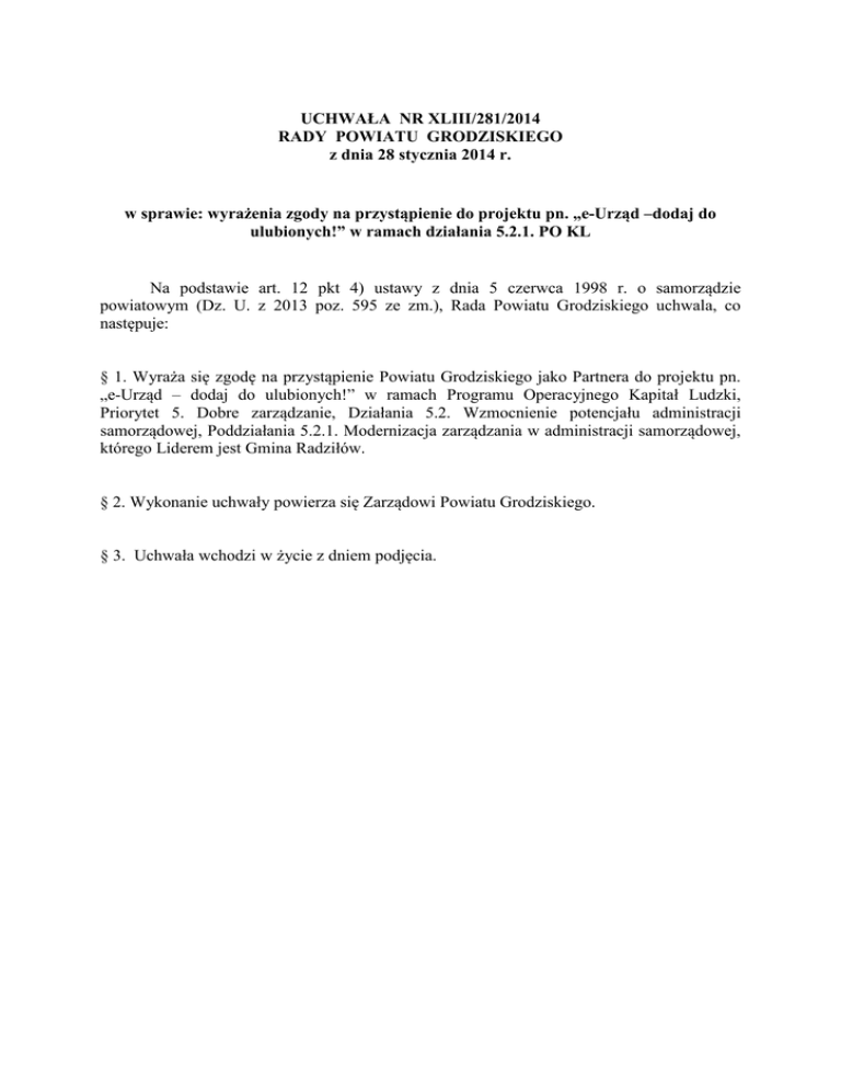 UCHWAŁA NR XLIII/281/2014 RADY POWIATU GRODZISKIEGO z dnia 28 stycznia 2014 r. w sprawie: wyrażenia zgody na przystąpienie do projektu pn. „e-Urząd –dodaj do ulubionych!” w ramach działania 5.2.1. PO KL Na podstawie art. 12 pkt 4) ustawy z dnia 5 czerwca 1998 r. o samorządzie powiatowym (Dz. U. z 2013 poz. 595 ze zm.), Rada Powiatu Grodziskiego uchwala, co następuje: § 1. Wyraża się zgodę na przystąpienie Powiatu Grodziskiego jako Partnera do projektu pn. „e-Urząd – dodaj do ulubionych!” w ramach Programu Operacyjnego Kapitał Ludzki, Priorytet 5. Dobre zarządzanie, Działania 5.2. Wzmocnienie potencjału administracji samorządowej, Poddziałania 5.2.1. Modernizacja zarządzania w administracji samorządowej, którego Liderem jest Gmina Radziłów. § 2. Wykonanie uchwały powierza się Zarządowi Powiatu Grodziskiego. § 3. Uchwała wchodzi w życie z dniem podjęcia. UZASADNIENIE DO UCHWAŁA NR XLIII/281/2014 RADY POWIATU GRODZISKIEGO z dnia 28 stycznia 2014 r. w sprawie: wyrażenia zgody na przystąpienie do projektu pn. „e-Urząd –dodaj do ulubionych!” w ramach działania 5.2.1. PO KL W ramach konkursu 2/POKL/5.2.1/2013 Lider Partnerstwa – Gmina Radziłów złożyła wniosek o dofinasowanie, który otrzymał pozytywną ocenę formalna i merytoryczną i został rekomendowany do dofinasowania. Głównym celem projektu pn. „e-Urząd –dodaj do ulubionych!” jest upowszechnienie i poprawa jakości elektronicznych usług publicznych świadczonych przez 5 jednostek samorządu terytorialnego oraz usprawnienie działania tych jednostek przez wdrożenie standardów świadczenia elektronicznych usług publicznych i elektronizację wymiany korespondencji za pomocą Elektronicznej Platformy Usług Administracji Publicznej (ePUAP) w okresie 01.2014-06.2015. Projekt będzie realizowany w partnerstwie, warunkiem podpisania umowy o dofinasowanie przez Lidera Partnerstwa – Gminę Radziłów z Instytucją Wdrażającą jest podjęcie przedmiotowej uchwały. W związku z powyższym podjęcie uchwały uznaje się za zasadne.