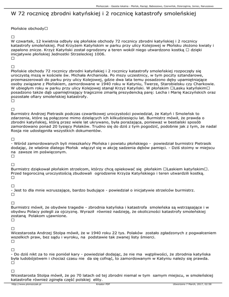 Płońszczak - Gazeta lokalna - Płońsk, Raciąż, Baboszewo, Czerwińsk, Dzierzążnia, Joniec, Naruszewo W 72 rocznicę zbrodni katyńskiej i 2 rocznicę katastrofy smoleńskiej Płońskie obchody W czwartek, 12 kwietnia odbyły się płońskie obchody 72 rocznicy zbrodni katyńskiej i 2 rocznicy katastrofy smoleńskiej. Pod Krzyżem Katyńskim w parku przy ulicy Kolejowej w Płońsku złożono kwiaty i zapalono znicze. Krzyż Katyński został ogrodzony a teren wokół niego utwardzono kostką dzięki inicjatywie płońskiej Jednostki Strzeleckiej 1006. Płońskie obchody 72 rocznicy zbrodni katyńskiej i 2 rocznicy katastrofy smoleńskiej rozpoczęły się uroczystą mszą w kościele św. Michała Archanioła. Po mszy uczestnicy, w tym poczty sztandarowe, przemaszerowali do parku przy ulicy Kolejowej, gdzie dwa lata temu posadzono dęby upamiętniające osoby związane z Płońskiem, zamordowane w 1940 roku w Katyniu, Twerze, Starobielsku czy Charkowie. W ubiegłym roku w parku przy ulicy Kolejowej stanął Krzyż Katyński. W płońskim Lasku katyńskim posadzono także dąb upamiętniający tragicznie zmarłą prezydencką parę: Lecha i Marię Kaczyńskich oraz pozostałe ofiary smoleńskiej katastrofy. Burmistrz Andrzej Pietrasik podczas czwartkowej uroczystości powiedział, że Katyń i Smoleńsk to zdarzenia, które są połączone mimo dzielących ich kilkudziesięciu lat. Burmistrz mówił, że prawda o zbrodni katyńskiej, którą przez wiele lat ukrywano, była porażająca, ponieważ w bestialski sposób zamordowano ponad 20 tysięcy Polaków. Trudno się do dziś z tym pogodzić, podobnie jak z tym, że nadal Rosja nie udostępniła wszystkich dokumentów. - Wśród zamordowanych byli mieszkańcy Płońska i powiatu płońskiego - powiedział burmistrz Pietrasik dodając, że właśnie dlatego Płońsk włączył się w akcję sadzenia dębów pamięci. - Dziś stoimy w miejscu na zawsze im poświęconym. Burmistrz dziękował płońskim strzelcom, którzy chcą opiekować się płońskim Laskiem katyńskim. Przed tegoroczną uroczystością zbudowali ogrodzenie Krzyża Katyńskiego i teren utwardzili kostką. - Jest to dla mnie wzruszające, bardzo budujące - powiedział o inicjatywie strzelców burmistrz. Burmistrz mówił, że obydwie tragedie - zbrodnia katyńska i katastrofa smoleńska są wstrząsające i w obydwu Polacy polegli za ojczyznę. Wyraził również nadzieję, że okoliczności katastrofy smoleńskiej zostaną Polakom ujawnione. Wicestarosta Andrzej Stolpa mówił, że w 1940 roku 22 tys. Polaków zostało zgładzonych z pogwałceniem wszelkich praw, bez sądu i wyroku, na podstawie tak zwanej listy śmierci. - Do dziś nikt za to nie poniósł kary - powiedział dodając, że nie ma wątpliwości, że zbrodnia katyńska była ludobójstwem i chociaż czasu nie da się cofnąć, to zamordowanym w Katyniu należy się prawda. Wicestarosta Stolpa mówił, że po 70 latach od tej zbrodni niemal w tym samym miejscu, w smoleńskiej katastrofie również zginęła część polskiej elity. http://www.plonszczak.pl Kreator PDF Utworzono 7 March, 2017, 02:58 Płońszczak - Gazeta lokalna - Płońsk, Raciąż, Baboszewo, Czerwińsk, Dzierzążnia, Joniec, Naruszewo - Niedobrze, że po dwóch latach ta sprawa nadal jest otwarta, budzi kontrowersje i dzieli polskie społeczeństwo - powiedział Stolpa. Apel poległych odczytał major Mieczysław Radomski, a modlitwę za zmarłych odmówił proboszcz parafii św. Michała Archanioła w Płońsku, ksiądz Edmund Makowski. Pod Krzyżem Katyńskim złożono kwiaty i zapalono znicze, jeden z nich został zapalony przez burmistrza Pietrasika pod dębem upamiętniającym prezydencką parę i osoby, które zginęły tragicznie w smoleńskiej katastrofie. Uroczystość uświetnił występ płońskiej Młodzieżowej Orkiestry Dętej Con Grazia. Katarzyna Olszewska foto: Katarzyna Olszewska Więcej zdjęć w Galerii http://www.plonszczak.pl Kreator PDF Utworzono 7 March, 2017, 02:58