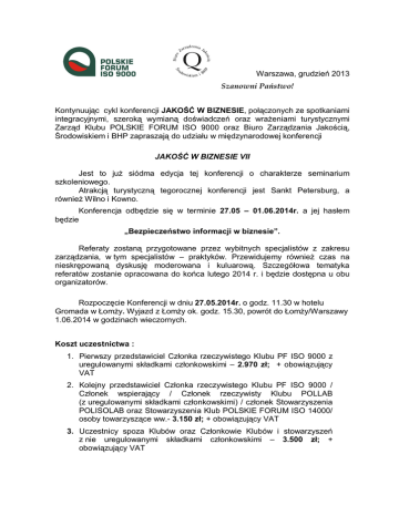 Warszawa, grudzień 2013 Szanowni Państwo! Kontynuując cykl konferencji JAKOŚĆ W BIZNESIE, połączonych ze spotkaniami integracyjnymi, szeroką wymianą doświadczeń oraz wrażeniami turystycznymi Zarząd Klubu POLSKIE FORUM ISO 9000 oraz Biuro Zarządzania Jakością, Środowiskiem i BHP zapraszają do udziału w międzynarodowej konferencji JAKOŚĆ W BIZNESIE VII Jest to już siódma edycja tej konferencji o charakterze seminarium szkoleniowego. Atrakcją turystyczną tegorocznej konferencji jest Sankt Petersburg, a również Wilno i Kowno. Konferencja odbędzie się w terminie 27.05 – 01.06.2014r. a jej hasłem będzie „Bezpieczeństwo informacji w biznesie”. Referaty zostaną przygotowane przez wybitnych specjalistów z zakresu zarządzania, w tym specjalistów – praktyków. Przewidujemy również czas na nieskrępowaną dyskusję moderowana i kuluarową. Szczegółowa tematyka referatów zostanie opracowana do końca lutego 2014 r. i będzie dostępna u obu organizatorów. Rozpoczęcie Konferencji w dniu 27.05.2014r. o godz. 11.30 w hotelu Gromada w Łomży. Wyjazd z Łomży ok. godz. 15.30, powrót do Łomży/Warszawy 1.06.2014 w godzinach wieczornych. Koszt uczestnictwa : 1. Pierwszy przedstawiciel Członka rzeczywistego Klubu PF ISO 9000 z uregulowanymi składkami członkowskimi – 2.970 zł; + obowiązujący VAT 2. Kolejny przedstawiciel Członka rzeczywistego Klubu PF ISO 9000 / Członek wspierający / Członek rzeczywisty Klubu POLLAB (z uregulowanymi składkami członkowskimi) / członek Stowarzyszenia POLISOLAB oraz Stowarzyszenia Klub POLSKIE FORUM ISO 14000/ osoby towarzyszące ww.- 3.150 zł; + obowiązujący VAT 3. Uczestnicy spoza Klubów oraz Członkowie Klubów i stowarzyszeń z nie uregulowanymi składkami członkowskimi – 3.500 zł; + obowiązujący VAT Liczba miejsc ograniczona. Decyduje kolejność zgłoszeń. Nocleg w hotelach tranzytowych oraz w hotelu w centrum Sankt Petersburga w pokojach 2 osobowych 27.05.2014 - wtorek Zbiórka uczestników i wyjazd z Warszawy (parking przy dworcu PKP Warszawa Zachodnia) o godz. 9.00. Przejazd do hotelu Gromada w Łomży ok.godz. 11,00. Konferencja w hotelu (w czasie konferencji przerwa kawowa oraz lunch). Wyjazd w dalszą drogę do Wilna. Przyjazd do Wilna. Zakwaterowanie w hotelu, obiadokolacja (dla osób chętnych wieczorny spacer z pilotem po wileńskiej starówce). Nocleg. 28.05.2014 - środa Wczesne śniadanie. Wyjazd w drogę do St. Petersburga (lunch w restauracji w okolicach Rezekne). Przyjazd do hotelu w Sankt Petersburgu, zakwaterowanie, obiadokolacja i nocleg. 29.05.2014 - czwartek Śniadanie. Zwiedzanie rozpoczniemy od objazdowej wycieczki po Sankt Petersburgu, podczas której zobaczymy m.in.: twierdzę Pietropawłowską –pierwsza budowla miasta, krążownik „Aurora”– symbol rewolucji październikowej, zabudowania Wyspy Wasilewskiej, nabrzeże Uniwersyteckie i Pałacowe, pomnik Piotra I – Miedziany Jeździec. Lunch w restauracji. Po południu rejs stateczkiem rzekami i kanałami Sankt Petersburga. Powrót do hotelu. Obiadokolacja. Spektakl w Teatrze Mariańskim. (fakultatywnie). Nocleg. 30.05.2014 - piątek Po śniadaniu przejazd do Peterhofu- dawnej letniej rezydencji Piotra Wielkiego. Zwiedzanie Parku Dolnego zwanego królem fontann i kaskad. Najwspanialsza fontanna parku Wielka Kaskada składa się z 225 rzeźb i aż 64 fontann. Główna fontanna przedstawiająca biblijnego Samsona wydobywa w górę 20-metrowy strumień wody. Lunch. Powrót do Sankt Petersburga. Dalsze zwiedzanie miasta m. in. muzeum Ermitaż we wnętrzach Pałacu Zimowego. Czas na zakupy lokalnych wyrobów i pamiątek. Powrót do hotelu, obiadokolacja, nocleg. Dla chętnych osób nocna wycieczka „Zwodzone mosty St. Petersburga”. 31.05.2014 - sobota Śniadanie. Przejazd komunikacją miejską. Spotkanie z przewodnikiem i dalsze zwiedzanie miasta m. in. Cerkiew Zbawiciela na Krwi, która powstała w miejscu udanego zamachu na cara Aleksandra II, Plac św. Izaaka, Sobór św. Izaaka, z którego złotej kopuły roztacza się najpiękniejsza panorama miasta, katedra Kazańska – monumentalna budowla wzorowana na Bazylice Św. Piotra w Watykanie. Lunch. Po południu wyjazd w drogę powrotną. Przejazd na nocleg tranzytowy w ok. Dynenburga na Łotwie. Zakwaterowanie w hotelu. Obiadokolacja, nocleg. 01.06.2014 - niedziela Śniadanie. Wyjazd w drogę powrotną. Przyjazd do Kowna. Spacer po Kownie z pilotem. Lunch w restauracji. Przyjazd do Warszawy ok. godz. 19:00. Program imprezy jest ramowy, kolejność zwiedzania może ulec zmianie. CENA ZAWIERA: - przejazd autokarem ( klimatyzacja, video, barek , wc) 5 noclegów w hotelach *** w pokojach 2-osobowych z łazienkami 5 śniadań i 5 obiadokolacji, 6 lunchy program turystyczny opiekę pilota ubezpieczenie udział w konferencji w hotelu Gromada w Łomży - rejs stateczkiem kanałami i rzekami St. Petersburga bilety wstępu do zwiedzanych obiektów, biletu komunikacji miejskiej oraz usługi lokalnego przewodnika w St. Petersburgu CENA NIE ZAWIERA: - udziału w spektaklu w Tetrze Mariańskim (ok. 120-140 EURO/os). - wizy rosyjskiej 320 zł/os. WIZA: 21 dni przed wyjazdem należy dostarczyć dokumenty niezbędne do uzyskania wizy: wypełniony (ze strony https://visa.kdmid.ru) podpisany - zgodnie z podpisem paszportowym wniosek wizowy, zdjęcie biometryczne 1szt., paszport ważny minimum pół roku od zakończenia ważności wizy, posiadający minimum 2 wolne strony. Istnieje możliwość zarezerwowania: Miejsca w autokarze z Warszawy w dniu 27.05.2014 oraz powrót do Warszawy w dniu 01.06.2014 (bezpłatnie) Pokoju 1 osobowego (dopłata 640,00 zł/osoba+ 23% VAT) Ilość pokoi 1 osobowych ograniczona. Decyduje kolejność zgłoszeń Osoby zgłaszające się indywidualnie prosimy o bezpośredni kontakt z Organizatorem Technicznym. W przypadku opłacania udziału w konferencji ze środków budżetowych istnieje możliwość wystawienia faktury bez podatku VAT Informacji szczeg
