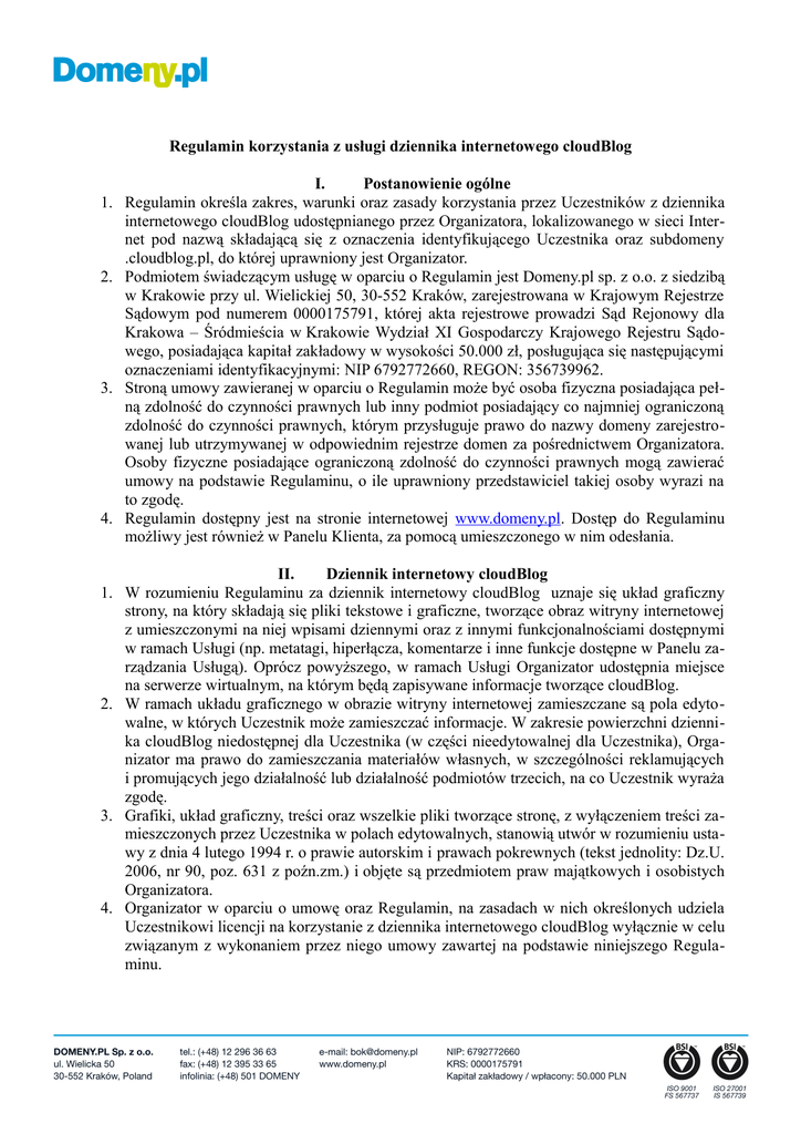 Regulamin korzystania z usługi dziennika internetowego cloudBlog I. Postanowienie ogólne 1. Regulamin określa zakres, warunki oraz zasady korzystania przez Uczestników z dziennika internetowego cloudBlog udostępnianego przez Organizatora, lokalizowanego w sieci Internet pod nazwą składającą się z oznaczenia identyfikującego Uczestnika oraz subdomeny .cloudblog.pl, do której uprawniony jest Organizator. 2. Podmiotem świadczącym usługę w oparciu o Regulamin jest Domeny.pl sp. z o.o. z siedzibą w Krakowie przy ul. Wielickiej 50, 30-552 Kraków, zarejestrowana w Krajowym Rejestrze Sądowym pod numerem 0000175791, której akta rejestrowe prowadzi Sąd Rejonowy dla Krakowa – Śródmieścia w Krakowie Wydział XI Gospodarczy Krajowego Rejestru Sądowego, posiadająca kapitał zakładowy w wysokości 50.000 zł, posługująca się następującymi oznaczeniami identyfikacyjnymi: NIP 6792772660, REGON: 356739962. 3. Stroną umowy zawieranej w oparciu o Regulamin może być osoba fizyczna posiadająca pełną zdolność do czynności prawnych lub inny podmiot posiadający co najmniej ograniczoną zdolność do czynności prawnych, którym przysługuje prawo do nazwy domeny zarejestrowanej lub utrzymywanej w odpowiednim rejestrze domen za pośrednictwem Organizatora. Osoby fizyczne posiadające ograniczoną zdolność do czynności prawnych mogą zawierać umowy na podstawie Regulaminu, o ile uprawniony przedstawiciel takiej osoby wyrazi na to zgodę. 4. Regulamin dostępny jest na stronie internetowej www.domeny.pl. Dostęp do Regulaminu możliwy jest również w Panelu Klienta, za pomocą umieszczonego w nim odesłania. 1. 2. 3. 4. II. Dziennik internetowy cloudBlog W rozumieniu Regulaminu za dziennik internetowy cloudBlog uznaje się układ graficzny strony, na który składają się pliki tekstowe i graficzne, tworzące obraz witryny internetowej z umieszczonymi na niej wpisami dziennymi oraz z innymi funkcjonalnościami dostępnymi w ramach Usługi (np. metatagi, hiperłącza, komentarze i inne funkcje dostępne w Panelu zarządzania Usługą). Oprócz powyższego, w ramach Usługi Organizator udostępnia miejsce na serwerze wirtualnym, na którym będą zapisywane informacje tworzące cloudBlog. W ramach układu graficznego w obrazie witryny internetowej zamieszczane są pola edytowalne, w których Uczestnik może zamieszczać informacje. W zakresie powierzchni dziennika cloudBlog niedostępnej dla Uczestnika (w części nieedytowalnej dla Uczestnika), Organizator ma prawo do zamieszczania materiałów własnych, w szczególności reklamujących i promujących jego działalność lub działalność podmiotów trzecich, na co Uczestnik wyraża zgodę. Grafiki, układ graficzny, treści oraz wszelkie pliki tworzące stronę, z wyłączeniem treści zamieszczonych przez Uczestnika w polach edytowalnych, stanowią utwór w rozumieniu ustawy z dnia 4 lutego 1994 r. o prawie autorskim i prawach pokrewnych (tekst jednolity: Dz.U. 2006, nr 90, poz. 631 z poźn.zm.) i objęte są przedmiotem praw majątkowych i osobistych Organizatora. Organizator w oparciu o umowę oraz Regulamin, na zasadach w nich określonych udziela Uczestnikowi licencji na korzystanie z dziennika internetowego cloudBlog wyłącznie w celu związanym z wykonaniem przez niego umowy zawartej na podstawie niniejszego Regulaminu. 5. Uczestnik nie może bez zgody Organizatora dokonywać zmian graficznych i zmian treści dziennika internetowego cloudBlog, z wyjątkiem części edytowalnych, udostępniać jej innym podmiotom odpłatnie lub nieodpłatnie, a także wykorzystywać całości lub części układu dziennika internetowego cloudBlog lub elementów go tworzących do innych celów, niż wynikający z umowy zawieranej na podstawie Regulaminu. 1. 2. 3. 4. 5. III. Warunki świadczenia Usługi Uczestnik może korzystać z Usługi dziennika internetowego cloudBlog w jego wersji podstawowej albo w wersji rozszerzonej. Uczestnik może w Panelu Klienta aktywować dziennik internetowy cloudBlog po uiszczeniu jednorazowej opłaty aktywacyjnej przewidzianej w cenniku dziennika cloudBlog. Przesyłane przez Uczestnika pliki tworzące dziennik internetowy cloudBlog oraz treść wyświetlana w jego polach edytowalnych, umieszczone zostają na serwerach Organizatora i wyłącznie za jego pośrednictwem. Uczestnik na podstawie Regulaminu uprawniony jest do korzystania z serwerów Organizatora wyłącznie w celu oraz zakresie wynikającym z umowy zawieranej na podstawie niniejszego Regulaminu. Jeżeli Uczestnik posiada aktywną domenę internetową, której obsługę administracyjną i techniczną prowadzi Organizator, wówczas Uczestnik może w tej domenie aktywować przekierowanie do dziennika internetowego cloudBlog, dostępnego w subdomenie .cloudblog.pl. IV. Odpowiedzialność 1. Organizator nie ponosi odpowiedzialności za treści zamieszczane przez Uczestnika w polach edytowalnych dziennika internetowego cloudBlog. 2. Jeżeli Uczestnik zamieszcza w polach edytowalnych dziennika internetowego cloudBlog treści o charakterze bezprawnym, Organizator – po uzyskaniu urzędowego zawiadomienia lub wiarygodnej informacji o bezprawności tych danych – uprawniony jest do zastosowania środków przewidzianych w ustawie z dnia 18 lipca 2002 r. o świadczeniu usług drogą elektroniczną (Dz.U. z 2002, nr 144, poz. 1204 z późn. zm.). 3. Jeżeli Uczestnik ponownie dopuszcza się naruszenia, o którym mowa w pkt. IV ust. 2, Organizator – po bezskutecznym wezwaniu Uczestnika do usunięcia z dziennika internetowego cloudBlog treści o charakterze bezprawnym w terminie 24 godzin – uprawniony jest do trwałego zablokowania usługi świadczonej na podstawie niniejszego Regulaminu. V. Czas trwania umowy 1. Umowa zawarta na podstawie niniejszego Regulaminu może być rozwiązana przez Uczestnika za wypowiedzeniem przesłanym Organizatorowi w formie pisemnej lub wiadomości e-mail na adres [email protected], ze skutkiem na koniec okres