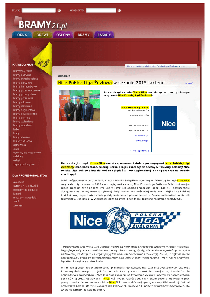 KATALOG FIRM H o m e » Aktualności » Nice Polska Liga Żużlowa w s... 2015-04-09 Nice Polska Liga Żużlowa w sezonie 2015 faktem! « wróć Po raz drugi z rzędu firma Nice została sponsorem tytularnym rozgrywek Nice Polskiej Ligi Żużlowej. NICE Polska Sp. z o.o. ul. Parzniewska 2a 05-800 Pruszków tel. 22 759 40 00 fax 22 759 40 21 [email protected] www.nice.pl » więcej o firmie Po raz drugi z rzędu firma Nice została sponsorem tytularnym rozgrywek Nice Polskiej Ligi Żużlowej. Oznacza to także, że drugi sezon z rzędu żużel będzie obecny w Telewizji Polskiej! Nice Polską Ligę Żużlową będzie można oglądać w TVP Regionalnej, TVP Sport oraz na stronie DLA PROFESJONALISTÓW sport.tvp.pl. Dzięki trójstronnemu porozumieniu między Polskim Związkiem Motorowym, Telewizją Polską i firmą Nice rozgrywki I ligi w sezonie 2015 znów będą nosiły nazwę Nice Polska Liga Żużlowa. W każdej kolejce jeden mecz na żywo pokaże TVP Sport i TVP Regionalna (niedziela, godz. 13:15) - powszechnie dostępna w naziemnej telewizji cyfrowej. Dzięki temu możliwość obejrzenia transmisji z Nice Polskiej Ligi Żużlowej będzie więc miało praktycznie każde gospodarstwo w Polsce posiadające odbiornik telewizyjny. Spotkania (w większości także na żywo) będą także dostępne na stronie sport.tvp.pl. - Ubiegłoroczna Nice Polska Liga Żużlowa okazała się najchętniej oglądaną ligą sportową w Polsce w telewizji. Negocjacje związane z przedłużeniem umowy nieco przeciągały się, ale ostatecznie jesteśmy niezwykle zadowoleni, że drugi rok z rzędu przyjdzie nam współpracować z Telewizją Polską. Dzięki naszemu zaangażowaniu doszło do profesjonalizacji rozgrywek, które zyskały wielką renomę - mówi Adam Krużyński, Dyrektor Zarządzający Nice Polska. W ramach sponsoringu tytularnego ligi planowana jest kontynuacja działań z poprzedniego roku oraz kilka zupełnie nowych projektów. W związku z tym nie zabraknie nowej edycji turniejów dla najmłodszych zawodników - Nice Cup oraz konkursu na typowanie wyników meczów za pośrednictwem serwisów społecznościowych - Nice PLŻ Typer. Oprócz tego w trakcie sezonu planowane jest przeprowadzenie konkursu na Miss Nice PLŻ oraz wybór najlepszej oprawy kibicowskiej. Już od najbliższej kolejki startuje konkurs dla kibiców zbierających kupony z programów meczowych. Do wygrania karnety na kolejny sezon. Nice Polska Liga Żużlowa będzie także odpowiednio promowana w serwisach sportowych Telewizji Polskiej, a podsumowanie każdej kolejki znajdzie się w „Sportowej Niedzieli", emitowanej w TVP INFO i TVP Sport. W sumie będzie 18 transmisji: 14 z rundy zasadniczej, po dwa spotkania półfinałowe i finałowe. W zeszłym sezonie w TVP Regionalnej przeprowadzono 17 transmisji, a średnia wyniosła aż 159 tys. widzów (udziały 1,63 proc.). Rekordowe było spotkanie GKM Grudziądz - PGE Marma Rzeszów z 29 czerwca 2014 roku: średnia wyniosła 218 tys., udziały 2,41 proc. Równoległe transmisje były przeprowadzane w TVP Sport - średnia wyniosła 74 tys. (udziały 0,75 proc.); rekord to mecz Orzeł Łódź - GKM Grudziądz - 120 tys. (1,24 proc.). Plan transmisji Nice PLŻ - kolejki 1-7 Nice Polska - należąca do grupy Nice, obecna na polskim rynku od 1996 roku, jest największym na rynku dostawcą inteligentnych i kompleksowych systemów zarządzania automatyką domową oraz producentem segmentowych bram garażowych. Obecnie Nice z obrotami na poziomie ponad 150 mln euro jest obecny na najważniejszych światowych rynkach w ponad 100 krajach na świecie, w Europie Zachodniej i Wschodniej, przez Stany Zjednoczone, Bliski Wschód oraz Afrykę. Na polskim rynku w ofercie Nice Polska dostępne są również produkty elero oraz KINGgates, a w sieciach marketów budowlanych produkty Mhouse i Moovo. źródło: Nice O portalu | FAQ i pomoc | kontakt (c) 2009 by www.bamy21.pl Wszelkie prawa zastrzeżone