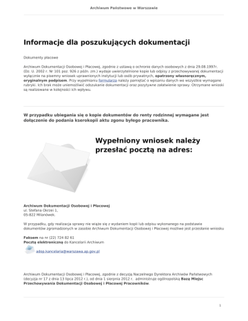 Archiwum Państwowe w Warszawie Informacje dla poszukujących dokumentacji Dokumenty płacowe Archiwum Dokumentacji Osobowej i Płacowej, zgodnie z ustawą o ochronie danych osobowych z dnia 29.08.1997r. (Dz. U. 2002 r. Nr 101 poz. 926 z późn. zm.) wydaje uwierzytelnione kopie lub odpisy z przechowywanej dokumentacji wyłącznie na pisemny wniosek uprawnionych instytucji lub osób prywatnych, opatrzony własnoręcznym, oryginalnym podpisem. Przy wypełnianiu formularza należy pamiętać o wpisaniu danych we wszystkie wymagane rubryki. Ich brak może uniemożliwić odszukanie dokumentacji oraz pozytywne załatwienie sprawy. Otrzymane wnioski są realizowane w kolejności ich wpływu. W przypadku ubiegania się o kopie dokumentów do renty rodzinnej wymagane jest dołączenie do podania kserokopii aktu zgonu byłego pracownika. Wypełniony wniosek należy przesłać pocztą na adres: Archiwum Dokumentacji Osobowej i Płacowej ul. Stefana Okrzei 1, 05-822 Milanówek. W przypadku, gdy realizacja sprawy nie wiąże się z wydaniem kopii lub odpisu wykonanego na podstawie dokumentów zgromadzonych w zasobie Archiwum Dokumentacji Osobowej i Płacowej możliwe jest przesłanie wniosku Faksem na nr (22) 724 82 61 Pocztą elektroniczną do Kancelarii Archiwum [email protected] Archiwum Dokumentacji Osobowej i Płacowej, zgodnie z decyzją Naczelnego Dyrektora Archiwów Państwowych (decyzja nr 17 z dnia 13 lipca 2012 r.), od dnia 1 sierpnia 2012 r. administruje ogólnopolską Bazą Miejsc Przechowywania Dokumentacji Osobowej i Płacowej Pracowników. 1 Archiwum Państwowe w Warszawie Wszelkich informacji dotyczących miejsc przechowywania dokumentacji osobowej i płacowej udziela Oddział Informacji i Udostępniania Zasobu: - pisemnie drogą tradycyjnej korespondencji - pocztą elektroniczną [email protected] Uwaga! Informacji tych nie udzielamy telefonicznie. 2