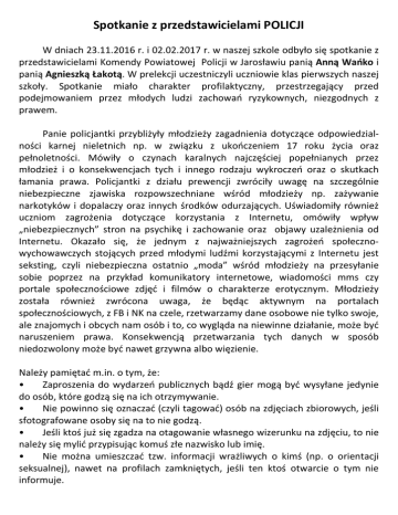 Spotkanie z przedstawicielami POLICJI W dniach 23.11.2016 r. i 02.02.2017 r. w naszej szkole odbyło się spotkanie z przedstawicielami Komendy Powiatowej Policji w Jarosławiu panią Anną Wańko i panią Agnieszką Łakotą. W prelekcji uczestniczyli uczniowie klas pierwszych naszej szkoły. Spotkanie miało charakter profilaktyczny, przestrzegający przed podejmowaniem przez młodych ludzi zachowań ryzykownych, niezgodnych z prawem. Panie policjantki przybliżyły młodzieży zagadnienia dotyczące odpowiedzialności karnej nieletnich np. w związku z ukończeniem 17 roku życia oraz pełnoletności. Mówiły o czynach karalnych najczęściej popełnianych przez młodzież i o konsekwencjach tych i innego rodzaju wykroczeń oraz o skutkach łamania prawa. Policjantki z działu prewencji zwróciły uwagę na szczególnie niebezpieczne zjawiska rozpowszechniane wśród młodzieży np. zażywanie narkotyków i dopalaczy oraz innych środków odurzających. Uświadomiły również uczniom zagrożenia dotyczące korzystania z Internetu, omówiły wpływ „niebezpiecznych” stron na psychikę i zachowanie oraz objawy uzależnienia od Internetu. Okazało się, że jednym z najważniejszych zagrożeń społecznowychowawczych stojących przed młodymi ludźmi korzystającymi z Internetu jest seksting, czyli niebezpieczna ostatnio „moda” wśród młodzieży na przesyłanie sobie poprzez na przykład komunikatory internetowe, wiadomości mms czy portale społecznościowe zdjęć i filmów o charakterze erotycznym. Młodzieży została również zwrócona uwaga, że będąc aktywnym na portalach społecznościowych, z FB i NK na czele, rzetwarzamy dane osobowe nie tylko swoje, ale znajomych i obcych nam osób i to, co wygląda na niewinne działanie, może być naruszeniem prawa. Konsekwencją przetwarzania tych danych w sposób niedozwolony może być nawet grzywna albo więzienie. Należy pamiętać m.in. o tym, że: • Zaproszenia do wydarzeń publicznych bądź gier mogą być wysyłane jedynie do osób, które godzą się na ich otrzymywanie. • Nie powinno się oznaczać (czyli tagować) osób na zdjęciach zbiorowych, jeśli sfotografowane osoby się na to nie godzą. • Jeśli ktoś już się zgadza na otagowanie własnego wizerunku na zdjęciu, to nie należy się mylić przypisując komuś złe nazwisko lub imię. • Nie można umieszczać tzw. informacji wrażliwych o kimś (np. o orientacji seksualnej), nawet na profilach zamkniętych, jeśli ten ktoś otwarcie o tym nie informuje. • Nie należy publicznie zadawać pytań nt. danych wrażliwych innego użytkownika. • Nie należy publikować kogokolwiek (za wyłączeniem osób publicznych) zdjęć, filmów, czyjegoś wizerunku jeśli osoby te nie wyrażają na to zgody. • Nie wolno obrażać i zniesławiać innych osób. • Nie wolno podszywać się pod kogoś, kradnąc w ten sposób czyjąś tożsamość. • Nie wolno zastraszać i nękać. Policjantki przestrzegały również, że obdarzenie zaufaniem osób poznanych w sieci może przynieść bardzo negatywne skutki. Na drugim spotkaniu poruszony został również temat aktów terrorystycznych na terenie szkoły. Uczniowie dowiedzieli się, jak się zachować w sytuacji wtargnięcia napastnika z bronią na teren placówki oświatowej. Spotkanie z przedstawicielami policji cieszyło się sporym zainteresowaniem. Na zakończenie dyskusji funkcjonariuszki odpowiadały na nurtujące uczniów pytania. Koordynatorzy akcji - E. Maciejowska, J. Stępień, W. Bęś