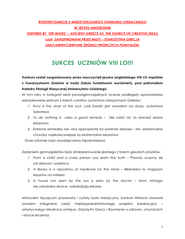 ROZSTRZYGNIECIE II MIEDZYSZKOLNEGO KONKURSU LITERACKIEGO W JĘZYKU ANGIELSKIM ‘INSPIRED BY THE MUSES’ – ANCIENT GREECE AS THE SOURCE OF CREATIVE IDEAS, czyli ZAINSPIROWANI PRZEZ MUZY – STAROŻYTNA GRECJA JAKO NIEWYCZERPANE ŹRÓDŁO TWÓRCZYCH POMYSŁÓW. SUKCES UCZNIÓW VIII LO!!! Konkurs został zorganizowany przez nauczycieli języka angielskiego VIII LO wspólnie z Towarzystwem Greków w Łodzi (także fundatorem wyróżnień), pod patronatem Katedry Filologii Klasycznej Uniwersytetu Łódzkiego. W tym roku w kategorii szkół ponadgimnazjalnych ocenie podlegały opowiadania zainspirowane jednym z trzech cytatów autorstwa starożytnych Greków: 1. Envy is the ulcer of the soul, czyli Zawiść jest wrzodem na duszy, autorstwa Sokratesa 2. To do nothing is salso a good remedy – Nie robić nic to również dobre lekarstwo 3. Extreme remedies are very appropriate for extreme disease – Na ekstremalne choroby najskuteczniejsze są ekstremalne lekarstwa Dwie ostatnie rady zawdzięczamy Hipokratesowi. Zadaniem gimnazjalistów było zinterpretowanie jednego z trzech greckich przysłów: 1. From a child and a crazy person you learn the truth – Prawdy uczymy się od dziecka I szaleńca 2. A library is a repository of medicine for the mind – Biblioteka to magazyn lekarstw na intelekt 3. A house not seen by the sun is seen by the doctor – Dom, którego nie odwiedza słońce, odwiedzają lekarze Motywem łączącym przysłowia i cytaty była medycyna. Konkurs literacki stanowił bowiem integralną część międzyprzedmiotowego projektu edukacyjno – artystycznego Medicina antiqua. Starożytni Grecy i Rzymianie o zdrowiu, chorobach i sztuce leczenia. 1 Główne nagrody w naszym tegorocznym konkursie ufundowało Studium Języków Obcych Szuster w Łodzi. Były to – za pierwsze miejsce – całoroczny i za dwa drugie miejsca – semestralne kursy dowolnie wybranego języka obcego (angielskiego, niemieckiego, hiszpańskiego, włoskiego, rosyjskiego lub chińskiego). Pierwsze miejsce ‘INSPIRED BY w II KONKURSIE LITERACKIM W JĘZYKU ANGIELSKIM THE MUSES …’ zajęła Iga Zgoła z VIII LO, uczennica mgr Iwony Niciak. Dwie drugie nagrody zostały wręczone zostały: 1. Darii Wolańskiej z Publicznego Liceum Ogólnokształcącego Politechniki Łódzkiej, uczennicy mgr Anny Czernielewskiej 2. Krzysztofowi Stasiakowi z XXI LO, uczniowi mgr Izabeli Michalak Wyróżnienia (cenne albumy o USA i Grecji, ufundowane przez American Corner i Towarzystwo Greków w Łodzi) otrzymali: 1. Marcin Stasiak z VIII LO w Łodzi, uczeń mgr Karoliny Mrozińskiej 2. Aleksandra Węgier z VIII LO w Łodzi, uczennica mgr Iwony Niciak 3. Joanna Depczyńska z XXVI LO w Łodzi, uczennica mgr Katarzyny Adamiec 4. Natalia Markowiak z Gimnazjum nr 44 w Łodzi, uczennica mgr Katarzyny Klonowskiej 5. Magdalena Krajewska z XXXI LO w Łodzi, uczennica mgr Marka Maruszewskiego 2