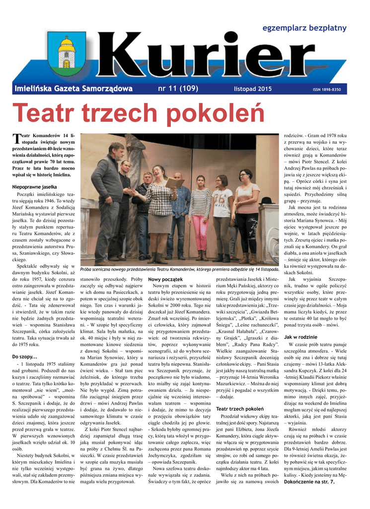 egzemplarz bezpłatny Imielińska Gazeta Samorządowa nr 11 (109) listopad 2015 ISSN 1898-8350 eatr Komanderów 14 listopada świętuje nowym przedstawianiem 40-lecie wznowienia działalności, którą zapoczątkował prawie 70 lat temu. Przez te lata bardzo mocno wpisał się w historię Imielina. Niepoprawne jasełka Początki imielińskiego teatru sięgają roku 1946. To wtedy Józef Komandera z Sodalicją Mariańską wystawiał pierwsze jasełka. Te do dzisiaj pozostały stałym punktem repertuaru Teatru Komanderów, ale z czasem zostały wzbogacone o przedstawienia autorstwa Prusa, Szaniawskiego, czy Słowackiego. Spektakle odbywały się w dawnym budynku Sokolni, aż do roku 1957, kiedy cenzura ostro zaingerowała w przedstawianie jasełek. Józef Komandera nie chciał się na to zgodzić. - Tata się zdenerwował i stwierdził, że w takim razie nie będzie żadnych przedstawień – wspomina Stanisława Szczepanik, córka założyciela teatru. Taka sytuacja trwała aż do 1975 roku. Do szopy... - 1 listopada 1975 staliśmy nad grobami. Podszedł do nas kuzyn i zaczęliśmy rozmawiać o teatrze. Tata tylko krótko komentował „nie wiem”, „można spróbować” - wspomina S. Szczepanik i dodaje, że do realizacji pierwszego przedstawienia udało się zaangażować dzieci znajomej, która jeszcze przed przerwą grała w teatrze. W pierwszych wznowionych jasełkach wzięło udział ok. 10 osób. Niestety budynek Sokolni, w którym mieszkańcy Imielina i nie tylko wcześniej występowali, stał się zakładem przemysłowym. Dla Komaderów to nie rodziców. - Gram od 1978 roku z przerwą na wojsko i na wychowanie dzieci, które teraz również grają u Komanderów – mówi Piotr Stencel. Z kolei Andrzej Pawlas na próbach pojawia się z jeszcze większą ekipą. – Oprócz córki i syna jest tutaj również mój chrześniak i sąsiedzi. Przychodzimy silną grupą – przyznaje. Jak mocna jest ta rodzinna atmosfera, może świadczyć historia Mariana Synowca. - Mój ojciec występował jeszcze po wojnie, w latach pięćdziesiątych. Zresztą ojciec i matka poznali się u Komandery. On grał diabła, a ona anioła w jasełkach – śmieje się aktor, którego córka również występowała na dePróba sceniczna nowego przedstawienia Teatru Komanderów, którego premiera odbędzie się 14 listopada. skach Sokolni. stanowiło przeszkody. Próby Nowy początek przedstawiania Jasełek i MisteJak wyjaśnia Szczepazaczęły się odbywać najpierw Nowym etapem w historii rium Męki Pańskiej, aktorzy co nik, trudno w ogóle policzyć w ich domu na Pasieczkach, a teatru było przeniesienie się na roku przygotowują jedną pre- wszystkie osoby, które przepotem w specjalnej szopie obok deski świeżo wyremontowanej mierę. Grali już między innymi winęły się przez teatr w całym niego. Ten czas i warunki ja- Sokolni w 2000 roku. Tego nie takie przedstawienia jak: „Trze- czasie jego działalności. – Moja kie wtedy panowały do dzisiaj doczekał już Józef Komandera. wiki szczęścia”, „Gwiazda Bet- mama liczyła kiedyś, że przez wspominają teatralni wetera- Zmarł rok wcześniej. Po śmier- lejemska”, „Plotka”, „Królowa te ostatnie 40 lat mogło to być ni. - W szopie był specyficzny ci człowieka, który zajmował Śniegu”, „Leśne rachuneczki”, ponad trzysta osób – mówi. klimat. Sala była malutka, na się przygotowaniem przedsta- „Krasnal Hałabała”, „Czarowok. 40 miejsc i były w niej za- wień: od tworzenia rekwizy- ny Grajek”, „Igraszki z dia- Jak w rodzinie montowane kinowe siedzenia tów, poprzez wykonywanie błem”, „Radcy Pana Radcy”. W czasie prób teatru panuje z dawnej Sokolni – wspomi- scenografii, aż do wyboru sce- Wielkie zaangażowanie Sta- szczególna atmosfera. - Wiele na Marian Synowiec, który u nariusza i reżyserii, przyszłość nisławy Szczepanik doceniają osób się zna i dobrze się tutaj Komanderów gra już ponad teatru była niepewna. Stanisła- członkowie ekipy. – Pani Stasia czujemy – mówi 13-latka Alekćwierć wieku. - Stał tam piec wa Szczepanik przyznaje, że jest jakby naszą teatralną matką sandra Kupczyk. Z kolei dla 24 żeleźniok, do którego trzeba początkowo nie było wiadomo, – przyznaje 14-letnia Weronika -letniej Klaudii Piekorz właśnie było przykładać w przerwach. kto miałby się zająć kontynu- Mazurkiewicz. – Można do niej wspomniany klimat jest dobrą Nie było wygód. Zimą potra- owaniem dzieła. – Ja niespe- przyjść i pogadać o wszystkim motywacją. - Dzięki temu, pofiło zaciągnąć śniegiem przez cjalnie się wcześniej intereso- – dodaje. mimo innych zajęć, przyjeżdrzwi – mówi Andrzej Pawlas wałam teatrem – wspomina dżając na weekend do Imielina i dodaje, że dodawało to nie- i dodaje, że mimo to decyzja Teatr trzech pokoleń mogłam uczyć się od najlepszej samowitego klimatu w czasie o przejęciu obowiązków taty Przedział wiekowy ekipy tea- aktorki, jaką jest pani Stasia odgrywania Jasełek. ciągle chodziła jej po głowie. tralnej jest dość spory. Najstarszą – wyjaśnia. Z kolei Piotr Stencel najbar- - Szkoda byłoby ogromnej pra- jest pani Elżbieta, żona Józefa Również młodsi aktorzy dziej zapamiętał długą trasę cy, którą tata włożył w przygo- Komandery, która ciągle aktyw- czują się na próbach i w czasie jaką musiał pokonywać idąc towanie całego zaplecza, więc nie włącza się w przygotowania przedstawień bardzo dobrze. na próby z Chełmu Śl. na Pa- zachęcona przez pana Romana przedstawień np. poprzez szycie Dla 9-letniej Amelii Pawlas jest sieczki. W czasie przedstawień Jochymczyka, zgodziłam się strojów, co robi od samego po- to również świetna okazja, żew szopie cała muzyka musiała – opowiada Szczepanik. czątku działania teatru. Z kolei by pobawić się w tak specyficzbyć grana na żywo, dlatego Nowa szefowa teatru dosko- najmłodszy aktor ma 4 lata. nym miejscu, jaki