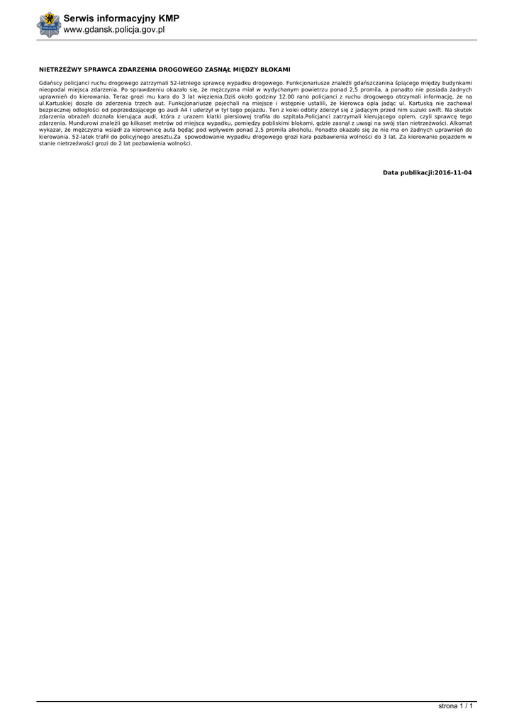 Serwis informacyjny KMP www.gdansk.policja.gov.pl NIETRZEŹWY SPRAWCA ZDARZENIA DROGOWEGO ZASNĄŁ MIĘDZY BLOKAMI Gdańscy policjanci ruchu drogowego zatrzymali 52-letniego sprawcę wypadku drogowego. Funkcjonariusze znaleźli gdańszczanina śpiącego między budynkami nieopodal miejsca zdarzenia. Po sprawdzeniu okazało się, że mężczyzna miał w wydychanym powietrzu ponad 2,5 promila, a ponadto nie posiada żadnych uprawnień do kierowania. Teraz grozi mu kara do 3 lat więzienia.Dziś około godziny 12.00 rano policjanci z ruchu drogowego otrzymali informację, że na ul.Kartuskiej doszło do zderzenia trzech aut. Funkcjonariusze pojechali na miejsce i wstępnie ustalili, że kierowca opla jadąc ul. Kartuską nie zachował bezpiecznej odległości od poprzedzającego go audi A4 i uderzył w tył tego pojazdu. Ten z kolei odbity zderzył się z jadącym przed nim suzuki swift. Na skutek zdarzenia obrażeń doznała kierująca audi, która z urazem klatki piersiowej trafiła do szpitala.Policjanci zatrzymali kierującego oplem, czyli sprawcę tego zdarzenia. Mundurowi znaleźli go kilkaset metrów od miejsca wypadku, pomiędzy pobliskimi blokami, gdzie zasnął z uwagi na swój stan nietrzeźwości. Alkomat wykazał, że mężczyzna wsiadł za kierownicę auta będąc pod wpływem ponad 2,5 promila alkoholu. Ponadto okazało się że nie ma on żadnych uprawnień do kierowania. 52-latek trafił do policyjnego aresztu.Za spowodowanie wypadku drogowego grozi kara pozbawienia wolności do 3 lat. Za kierowanie pojazdem w stanie nietrzeźwości grozi do 2 lat pozbawienia wolności. Data publikacji:2016-11-04 strona 1 / 1 Powered by TCPDF (www.tcpdf.org)