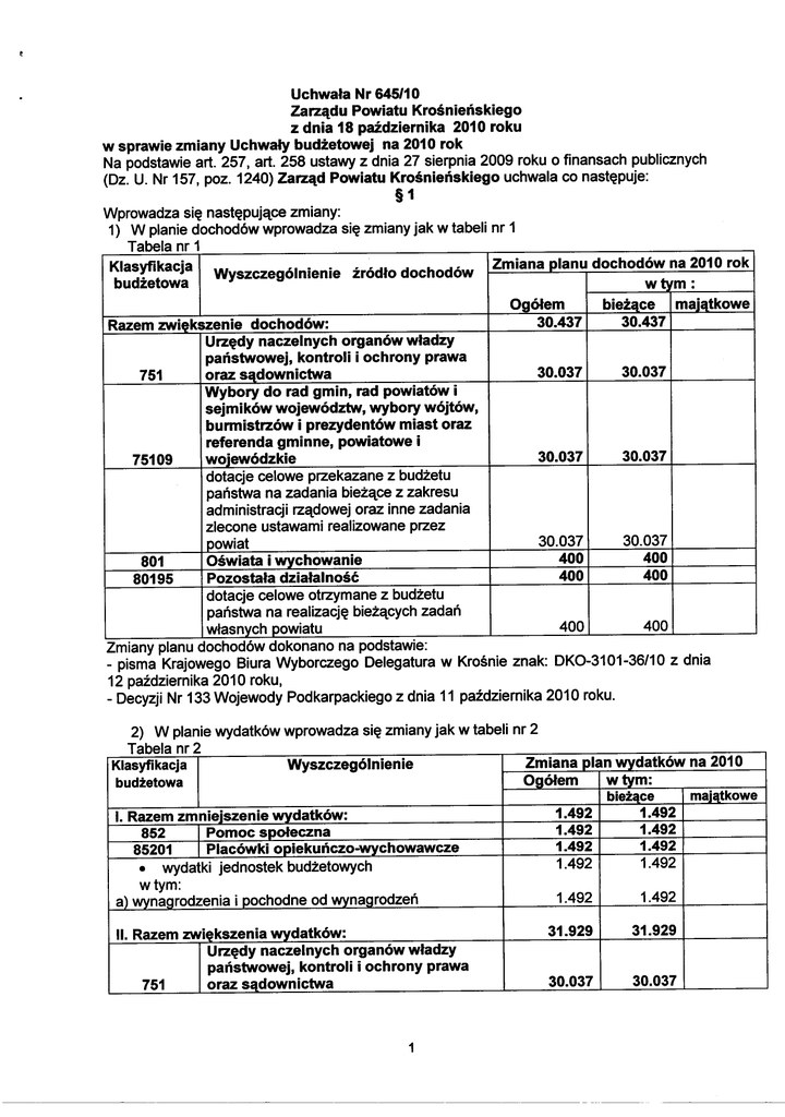 Nr 645/10 Powiatu Krośnieńskiego z dnia 18 października 201 O roku w sprawie zmiany Uchwały budżetowej na 201 O rok Na podstawie art. 257, art. 258 ustawy z dnia 27 sierpnia 2009 roku o finansach publicznych (Dz. U. Nr 157, poz. 1240) Zarząd Powiatu Krośnieńskiego uchwala co następuje: Uchwała Zarządu §1 się następujące zmiany: Wprowadza 1) W planie dochodów wprowadza się zmiany jak w tabeli nr 1 Tabela nr 1 Klasyfikacja Wyszczególn ienie źródło dochodów Zmiana planu dochodów na 201 O rok budżetowa wt1m: maiatkowe bieżące Ogółem 30.437 30.437 dochodów: Razem zwiekszenie Urzędy naczelnych organów władzy państwowej, kontroli i ochrony prawa 30.037 30.037 oraz sądownictwa 751 Wybory do rad gmin, rad powiatów i sejmików województw , wybory wójtów, burmistrzów i prezydentów miast oraz referenda gminne, powiatowe i 30.037 30.037 wojewódzkie 75109 dotacje celowe przekazane z budżetu państwa na zadania bieżące z zakresu administracji rządowej oraz inne zadania zlecone ustawami realizowane przez 30.037 30.037 powiat 400 400 Oświata i wychowanie 801 80195 400 Pozostała działalność 400 dotacje celowe otrzymane z budżetu państwa na realizację bieżących zadań 400 400 własnych powiatu Zmiany planu dochodów dokonano na podstawie: - pisma Krajowego Biura Wyborczego Delegatura w Krośnie znak: DK0-3101-36 /10 z dnia 12 października 201 O roku, - Decyzji Nr 133 Wojewody Podkarpackiego z dnia 11 października 2010 roku. 2) W planie wydatków wprowadza się zmiany jak w tabeli nr 2 Tabela nr 2 Zmiana plan wydatków na 201 O Wyszczególnienie Klasyfikacja w tym: Ogółem budżetowa maiatkowe bieżące 1.492 1.492 I. Razem zmniejszenie wydatków: 1.492 1.492 Pomoc społeczna 852 1.492 1.492 Placówki opiekuńczo-wychowawcze 85201 1.492 1.492 • wydatki jednostek budżetowych w tym: 1.492 1.492 a) wvnaorodzenia i pochodne od wvnaorodzeń li. Razem wvdatków: naczelnych organów władzy państwowej, kontroli i ochrony prawa oraz sądownictwa zwiększenia 31.929 31.929 30.037 30.037 Urzędy 751 1 Wybory do rad gmin, rad powiatów i sejmików wojewód ztw, wybory wójtów, burmistr zów i prezyde ntów miast oraz referenda gminne, powiatowe i wojewód zkie 75109 jednostek budżetowych wydatki • w tym: a) wynagrodzenia i pochodne od wynagrodzeń b) wvdatki związane z realizacia ich statutowvch zadań • świadczenia na rzecz osób fizycznych Oświata i wvchow anie 801 Pozostała działalność 80195 • wydatki jednostek budżetowych w tym: a) wynagrodzenia i pochodne od wynagrodzeń b) wvdatki związane z realizacia ich statutowvch zadań Pomoc społeczna 852 Placówk i opiekuńczo-wvchowawcze 85201 • wydatki jednostek budżetowych w tym: a) wydatki związane z realizacia ich statutowych zadań 30.037 28.567 30.037 28.567 8.236 20.331 1.470 400 400 8.236 20.331 1.470 400 400 1.492 1.492 1.492 1.492 1.492 1.492 1.492 1.492 4) Szczegółowy plan dochodó w i wydatków budżetu powiatu wynikający z Uchwały przedstawia tabela nr 3 Tabela nr 3 "tu Doc hd' o ow pow1a Dochody Wyszczególnienie § Dział Rozdz. zwiększenia zmniejszenia 1 2 5 4 3 OGOŁEM: naczelnych organów władzy państwowej, kontroli i ochrony prawa oraz sądownictwa Wybory do rad gmin, rad powiatów i sejmików wojewód ztw, wybory wójtów, burmistr zów i prezyden tów miast oraz referenda gminne, powiatow e i wojewód zkie celowe przekazane z budżetu dotacje 2110 państwa na zadania bieżące z zakresu administracji rządowej oraz inne zadania zlecone ustawami realizowane przez powiat Oświata i wvchowa nie Urzędy 751 75109 801 80195 Pozostała działalność budżetu zadań bieżących realizację 2130 dotacje celowe otrzymane z państwa na powiatu własnych 2 6 30.437 30.037 30.037 30.037 400 400 400 wrv'datków Dział . tu pow1a § Rozdz. 1.492 OGOŁEM: Urzędy 751 Wydatki zmniejszenia zwiększenia 5 4 3 2 1 Wyszczególnienie naczelnych organów władzy i ochrony prawa 6 31.929 30.037 państwowej, kontroli oraz sądownictwa 75109 3030 4110 4120 4170 4210 4300 4410 4740 4750 801 30.037 Wybory do rad gmin, rad powiatów i sejmików województw, wybory wójtów, burmistrzów i prezydentów miast oraz referenda gminne, powiatowe i wojewódzkie różne wvdatki na rzecz osób fizvcznvch składki na ubezpieczenia społeczne składki na Fundusz Pracy wvnagrodzenia bezosobowe zakup materiałów i wvposażenia zakup usług pozostałych podróże służbowe krajowe zakup materiałów papierniczych do sprzętu drukarskiego i urządzeń kserograficznych zakup akcesoriów komputerowych, w tym programów i licencji Oświata i wychowanie 1.470 1.064 172 7.000 1.959 16.346 300 996 730 400 400 Pozostała działalność 80195 400 4170 wvnagrodzenia bezosobowe 852 85201 Pomoc społeczna Placówki opiekuńczo-wychowawcze 4040 dodatkowe wvnagrodzenie roczne 4170 wvnagrodzenia bezosobowe 4440 odpis na zakładowy fundusz świadczeń socjalnych §2 Wykonanie uchwały powierza się Staroście Krośnieńskiemu. §3 Uchwała wchodzi w życie z dniem podjęcia. 3 1.492 1.492 1.492 1.492 319 1.173 1.492