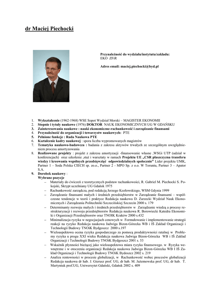 dr Maciej Piechocki Przynależność do wydziału/instytutu/zakładu: EKO ZFiR Adres email: [email protected] 1. 2. 3. 4. 5. 6. 7. 8. 9. Wykształcenie (1962-1968) WSE Sopot Wydział Morski – MAGISTER EKONOMII Stopnie i tytuły naukowe (1976) DOKTOR NAUK EKONOMICZNYCH UG W GDAŃSKU Zainteresowania naukowe : nauki ekonomiczne-rachunkowość i zarządzanie finansami Przynależność do organizacji i towarzystw naukowych: PTE Pełnione funkcje : Rada Naukowa PTE Kształcenie kadry naukowej : spora liczba wypromowanych magistrów Tematyka naukowo-badawcza : badania z zakresu aktywów trwałych ze szczególnym uwzględnieniem procesu amortyzowania Realizowane projekty : projekt z zakresu amortyzacji -finansowanie własne ,WSGi UTP (udział w konferencjach) oraz szkolenie ,staż i warsztaty w ramach Projektu UE „CSR płaszczyzna transferu wiedzy i kreowania wspólnych przedsięwzięć odpowiedzialnych społecznie” Lider projektu UMK, Partner 1 – Soda Polska CIECH sp. zo.o., Partner 2 - MPO Sp. z o.o. W Toruniu, Partner 3 – Apator S.A. Dorobek naukowy : Wybrane pozycje Materiały do ćwiczeń z teoretycznych podstaw rachunkowości, R. Gabriel M. Piechocki S. Pokojski, Skrypt uczelniany UG Gdańsk 1975 Rachunkowość zarządcza, pod redakcją Jerzego Kozłowskiego, WSM Gdynia 1999 Zarządzanie finansami małych i średnich przedsiębiorstw w Zarządzanie finansami – współczesne tendencje w teorii i praktyce Redakcja naukowa D. Zarzecki Wydział Nauk Ekonomicznych i Zarządzania Politechniki Szczecińskiej Szczecin 2000 s. 179 Determinanty rozwoju małych i średnich przedsiębiorstw w Zarządzanie wiedzą a procesy restrukturyzacji i rozwoju przedsiębiorstw Redakcja naukowa R. Borowiecki Katedra Ekonomiki i Organizacji Przedsiębiorstw oraz TNOIK Kraków 2000 s.432 Minimalizacja ryzyka w negocjacjach cenowych w Formułowanie i implementowanie strategii reakcji na ryzyko Redakcja naukowa Jadwiga Bizon-Górecka WB i IŚ Zakład Organizacji i Technologii Budowy TNOiK Bydgoszcz 2000 s.197 Wieloaspektowa ocena ryzyka gospodarczego za pomocą produktywności ratalnej w Problemy ryzyka u progu XXI wieku Redakcja naukowa Jadwiga Bizon-Górecka WB i IŚ Zakład Organizacji i Technologii Budowy TNOiK Bydgoszcz 2001 s. 53 Wskaźnik płynności bieżącej jako wieloaspektowa miara ryzyka finansowego. w Ryzyka wewnętrzne i w otoczeniu organizacji Redakcja naukowa Jadwiga Bizon-Górecka WB I IŚ Zakład Organizacji i Technologii Budowy TNOiK Bydoszcz 2002 s. 219 Analiza rentowności w procesie globalizacji, w Rachunkowość wobec procesów globalizacji Redakcja naukowa dr hab. J. Gierusz prof. UG, dr hab. M. Jażemowska prof. UG, dr hab. T. Martyniuk prof.UG, Uniwersytet Gdański, Gdańsk 2002 s. 409 Perspektywy rachunkowości małych i średnich przedsiębiorstw. w Historia, współczesność i perspektywy rachunkowości w Polsce Praca zbiorowa pod redakcją naukową prof. S. Sojaka UMK Toruń 2002, s. 489 Zbilansowana Karta dokonań ze szczególnym uwzględnieniem kapitału intelektualnego. w Strategie zarządzania ryzykiem – ryzyka uniwersalne i specyficzne Redakcja naukowa Jadwiga Bizon-Górecka TNOiK Bydgoszcz 2003, s. 105 Uwarunkowania prawne jakości informacji systemu rachunkowości. Zeszyty naukowe nr 51 Akademia Morska w Gdyni 2004, s.5 Ryzyko nieproporcjalnego rozwoju przedsiębiorstw w Ryzyko a bezpieczeństwo organizacji Redakcja naukowa Jadwiga Bizon-Górecka TNOiK Bydgoszcz 2004, s.271 Ocena jakości zarządzania finansami przedsiębiorstwa Konferencja naukowa WPSTiH Bydgoszcz 2004, s.72 Ryzyko amortyzacji w procesie inwestowania w Wpływ otoczenia na funkcjonowanie przedsiębiorstwa Redakcja naukowa Jadwiga Bizon Górecka TNOiK Bydgoszcz 2005, s.415 Wpływ kondycji finansowej przedsiębiorstw turystycznych na strategie rozwoju gospodarki regionalnej w Rola turystyki w strategii i polityce rozwoju gospodarki regionalnej Redakcja naukowa prof. W. Gaworecki WSTiH Gdańsk 2006, s.48 Konflikt pracy i kapitału – artykuł wygłoszony w ramach XX Bydgoskich Dni Społecznych, Bydgoszcz marzec 2007 – PIKCH Zarządzanie ryzykiem inwestycyjnym w Zarządzanie Przedsiębiorstw Pod redakcją naukową prof.zw.dr hab. E Urbańczyka Szczecin 2008, s, 31 Wybór strategii finansowania w procesie rozwoju przedsiębiorstwa SFiZ Siedlce w Rozwój przedsiębiorstwa – szanse i zagrożenia Redakcja naukowa J Szabłowski WSFiZ Siedlce oraz Europejskie Konsorcjum Prywatnych Szkół Wyższych Siedlce 2008 s.271 Zajęcia dydaktyczne (tytuły przedmiotów i rodzaj zajęć – wykłady, konwersatoria, seminaria): seminaria I WSG – kiedyś, seminaria II WSG w tym roku seminaria I i II stopnia ATR/UTP w sposób ciągły wykłady i ćwiczenia: rachunkowość rachunkowość finansowana rachunkowość zarządcza analiza finansowa analiza ekonomiczna MSR MSSF prawne regulacje rachunkowości organizacja księgowości w firmie finanse i rachunkowość TIR – było i komu to szkodziło? Wielokrotne monitowanie u kolejnych dziekanów i prorektora rozliczenia międzynarodowe zarządzanie finansami