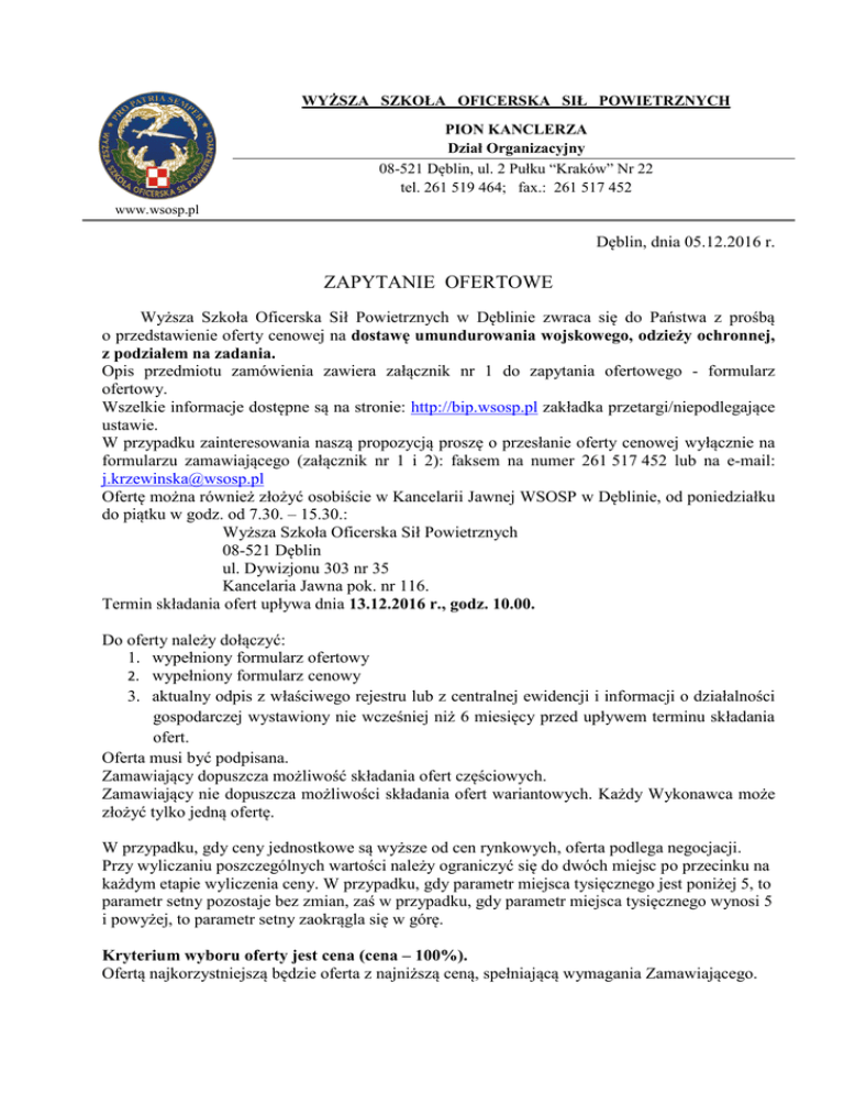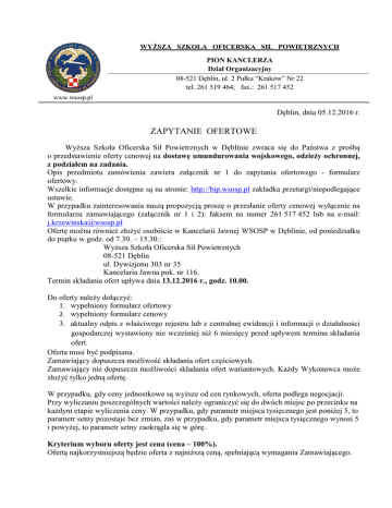 WYŻSZA SZKOŁA OFICERSKA SIŁ POWIETRZNYCH PION KANCLERZA Dział Organizacyjny 08-521 Dęblin, ul. 2 Pułku “Kraków” Nr 22 tel. 261 519 464; fax.: 261 517 452 www.wsosp.pl Dęblin, dnia 05.12.2016 r. ZAPYTANIE OFERTOWE Wyższa Szkoła Oficerska Sił Powietrznych w Dęblinie zwraca się do Państwa z prośbą o przedstawienie oferty cenowej na dostawę umundurowania wojskowego, odzieży ochronnej, z podziałem na zadania. Opis przedmiotu zamówienia zawiera załącznik nr 1 do zapytania ofertowego - formularz ofertowy. Wszelkie informacje dostępne są na stronie: http://bip.wsosp.pl zakładka przetargi/niepodlegające ustawie. W przypadku zainteresowania naszą propozycją proszę o przesłanie oferty cenowej wyłącznie na formularzu zamawiającego (załącznik nr 1 i 2): faksem na numer 261 517 452 lub na e-mail: [email protected] Ofertę można również złożyć osobiście w Kancelarii Jawnej WSOSP w Dęblinie, od poniedziałku do piątku w godz. od 7.30. – 15.30.: Wyższa Szkoła Oficerska Sił Powietrznych 08-521 Dęblin ul. Dywizjonu 303 nr 35 Kancelaria Jawna pok. nr 116. Termin składania ofert upływa dnia 13.12.2016 r., godz. 10.00. Do oferty należy dołączyć: 1. wypełniony formularz ofertowy 2. wypełniony formularz cenowy 3. aktualny odpis z właściwego rejestru lub z centralnej ewidencji i informacji o działalności gospodarczej wystawiony nie wcześniej niż 6 miesięcy przed upływem terminu składania ofert. Oferta musi być podpisana. Zamawiający dopuszcza możliwość składania ofert częściowych. Zamawiający nie dopuszcza możliwości składania ofert wariantowych. Każdy Wykonawca może złożyć tylko jedną ofertę. W przypadku, gdy ceny jednostkowe są wyższe od cen rynkowych, oferta podlega negocjacji. Przy wyliczaniu poszczególnych wartości należy ograniczyć się do dwóch miejsc po przecinku na każdym etapie wyliczenia ceny. W przypadku, gdy parametr miejsca tysięcznego jest poniżej 5, to parametr setny pozostaje bez zmian, zaś w przypadku, gdy parametr miejsca tysięcznego wynosi 5 i powyżej, to parametr setny zaokrągla się w górę. Kryterium wyboru oferty jest cena (cena – 100%). Ofertą najkorzystniejszą będzie oferta z najniższą ceną, spełniającą wymagania Zamawiającego. Termin płatności: zapłata za wykonaną usługę nastąpi przelewem na konto sprzedawcy w terminie do 21 dni od dnia wykonania zamówienia i dostarczenia zamawiającemu poprawnie wypełnionej faktury. Wykonawca może zwrócić się do Zamawiającego z pisemną prośbą o wyjaśnienie treści ogłoszenia na adres: Wyższa Szkoła Oficerska Sił Powietrznych, 08-521 Dęblin, ul. Dywizjonu 303 bud. 35 (Pałac Jabłonowskich), kancelaria jawna – pok. nr 116, fax. 261 51 74 52 lub e-mail: [email protected] Zamawiający niezwłocznie odpowie na piśmie na zadane pytanie, przesyłając treść pytania i odpowiedzi wszystkim uczestnikom postępowania oraz zamieści taką informację na stronie internetowej http://www.wsosp.pl Osobą upoważnioną do kontaktów z Wykonawcami jest: w sprawach proceduralnych: Joanna Krzewińska, tel. 261 519 464 W załączeniu 1. Formularz ofertowy/Opis przedmiotu zamówienia - załącznik nr 1 2. Formularz cenowy – załącznik nr 2 3. Wzór umowy - załącznik nr 3 KANCLERZ mgr Waldemar BIENIEK Załącznik nr 1 FORMULARZ OFERTOWY Zadanie 1 W odpowiedzi na zapytanie składamy ofertę. Szczegółowy opis przedmiotu zamówienia Przedmiotem zamówienia są mundury, odzież ochronna. Zadanie 1 1. UBRANIE OCHRONNE KPL. GORATEX WZ. 128/MON (Kurtka, Polar, Spodnie) Ubranie wykonane przez firmę SUMMIT S.A. . Zastosowana w strukturze tkaniny membrana „gore-tex” powoduje, że materiał jest odporny na działanie deszczu i wiatru, pozwala całemu ciału odprowadzać krople pary na zewnątrz, sprawdza się w ekstremalnych warunkach, utrzymuje temperaturę ciała. Kurtka posiada 2 kieszenie na dole kurtki zapinane na napy i zamki oraz 2 kieszenie na klatce piersiowej przy głównym suwaku zapinane również na zamki. Wyposażona w odpinany regulowany kaptur z daszkiem, ściągacze w pasie i na biodrach, zamek dwukierunkowy zakryty podwójną klapą, regulację szerokości rękawów, naszywki służące do przyczepienia na rzep flag, nazwiska i stopnia. Spodnie posiadają dwie kieszenie zapinane na zamek, szelki, oraz na całości długości nogawek są odpinane za pomocą suwaków i nap. Materiał zasadniczy 3LS/1 (trójwarstwowy laminat z membraną PTFE), 100% poliamid. 2. MUNDUR POLOWY LETNI WZ. 2010 Mundur polowy letni wz. 2010 , wz. 123UL/MON NT 5198-2, Tkanina US – 21/1, Bawełna 85%, Poliester 15%, Data produkcji wrzesień 2013r, gwarancja 36 m-cy. 3. MUNDUR POLOWY WZÓR 2010 Mundur polowy całoroczny wz. 2010, wz. 123 UP/MON kpl. Bluza +spodnie. Wykonany z materiału typu ripstop w składzie 50% bawełna, 50% poliester różniącego się od munduru letniego grubością. Bluza z kołnierzem typu stójka zapinanym na rzep, posiada łącznie 5 kieszeni zapinanych za pomocą rzepów. (dwie na wysokości piersi, dwie na wysokości ramion zapinane na zamek i pokryte rzepami, jedna u dołu rękawa przeznaczona na przyrządy piśmiennicze. Na wysokości piersi jest dodatkowy pagon, a w pięciu miejscach umieszczone są rzepy na emblematy i odznaczenia. Mankiety rękawów zakończone ściągaczem. W miejscu łokci znajduja się tzw. Kieszenie na ochraniacze. Spodnie posiadają możliwość regulacji obwodu w pasie. Na tyłku podwójne szycie materiału, w miejscu kolan specjalne kieszenie na ochraniacze. U dołu nogawki gumka oraz znurek ściągający. Spodnie posiadają łącznie 4 kieszenie. (dwie otwarte na wysokości bioder, dwie po bokach na wysokości ud zapinane na rzep). 4. CZAPKA ZIMOWA WOJSKOWA WZ.420/MON Czapka zimowa czarna wojskowa wz. 420/MON. Wykonana z akrylu, poliestru i bawełny. Świetnie przylega do głowy. Skutecznie chroni przed wiatrem i chłodem. 5. FURAŻERKA POLOWA WZ. 93/MON Furażerka polowa wojsk lo