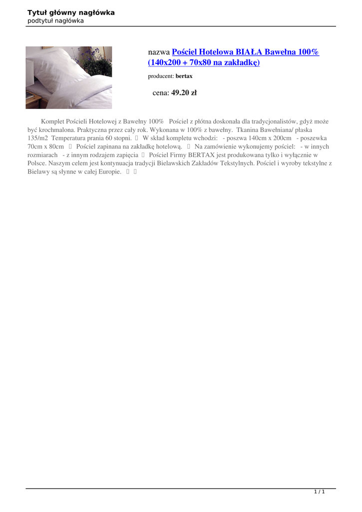 Tytuł główny nagłówka podtytuł nagłówka nazwa Pościel Hotelowa BIAŁA Bawełna 100% (140x200 + 70x80 na zakładkę) producent: bertax cena: 49.20 zł Komplet Pościeli Hotelowej z Bawełny 100% Pościel z płótna doskonała dla tradycjonalistów, gdyż może być krochmalona. Praktyczna przez cały rok. Wykonana w 100% z bawełny. Tkanina Bawełniana/ płaska 135/m2 Temperatura prania 60 stopni. W skład kompletu wchodzi: - poszwa 140cm x 200cm - poszewka 70cm x 80cm Pościel zapinana na zakładkę hotelową. Na zamówienie wykonujemy pościel: - w innych rozmiarach - z innym rodzajem zapięcia Pościel Firmy BERTAX jest produkowana tylko i wyłącznie w Polsce. Naszym celem jest kontynuacja tradycji Bielawskich Zakładów Tekstylnych. Pościel i wyroby tekstylne z Bielawy są słynne w całej Europie. 1/1