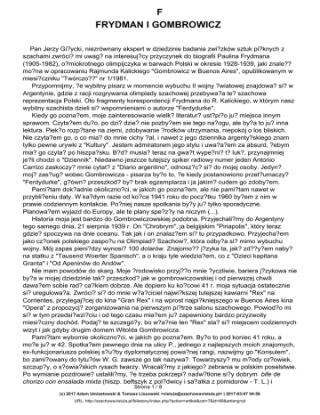 F FRYDMAN I GOMBROWICZ Pan Jerzy Gi?ycki, niezrównany ekspert w dziedzinie badania zwi?zków sztuk pi?knych z szachami zwróci? mi uwag? na interesuj?cy przyczynek do biografii Paulina Frydmana (1905-1982), o?miokrotnego olimpijczyka w barwach Polski w okresie 1928-1939, jaki znale?? mo?na w opracowaniu Rajmunda Kalickiego "Gombrowicz w Buenos Aires", opublikowanym w miesi?czniku "Twórczo??" nr 1/1981. Przypomnijmy, ?e wybitny pisarz w momencie wybuchu II wojny ?wiatowej znajdowa? si? w Argentynie, gdzie z racji rozgrywania olimpiady szachowej przebywa?a te? szachowa reprezentacja Polski. Oto fragmenty korespondencji Frydmana do R. Kalickiego, w którym nasz wybitny szachista dzieli si? wspomnieniami o autorze "Ferdydurke". Kiedy go pozna?em, moje zainteresowanie wielk? literatur? ust?pi?o ju? miejsca innym sprawom. Czyta?em du?o, po dzi? dzie? nie pozby?em sie tego na?ogu, ale by?a to ju? inna lektura. Piek?o rozp?tane na ziemi, zdobywanie ?rodków utrzymania, niepokój o los bliskich. Nie czyta?em go, o co mia? do mnie cichy ?al, i nawet z jego dziennika argenty?skiego znam tylko pewne urywki z "Kultury". Jestem admiratorem jego stylu i uwa?a?em za absurd, ?ebym mia? go czyta? po hiszpa?sku. B?d? musia? teraz na gwa?t wype?ni? t? luk?, przynajmniej je?li chodzi o "Dziennik". Niedawno jeszcze tutejszy spiker radiowy numer jeden Antonio Carrizo zaskoczy? mnie cytat? z "Diario argentino", odnosz?c? si? do mojej osoby. Jedyn? moj? zas?ug? wobec Gombrowicza - pisarza by?o to, ?e kiedy postanowiono przet?umaczy? "Ferdydurke", g?ówn? przeszkod? by? brak egzemplarza i ja jakim? cudem go zdoby?em. Pami?tam dok?adnie okoliczno?ci, w jakich go pozna?em, ale nie pami?tam nawet w przybli?eniu daty. W ka?dym razie od ko?ca 1941 roku do pocz?tku 1960 by?em z nim w prawie codziennym kontakcie. Po?niej nasze spotkania by?y ju? tylko sporadyczne. Planowa?em wyjazd do Europy, ale te plany spe?z?y na niczym (...). Historia moja jest bardzo do Gombrowiczowskiej podobna. Przyjechali?my do Argentyny tego samego dnia, 21 sierpnia 1939 r. On "Chrobrym", ja belgijskim "Piriapolis", który teraz gdzie? spoczywa na dnie oceanu. Tak jak i on znalaz?em si? tu przypadkowo. Przyjecha?em jako cz?onek polskiego zaspo?u na Olimpiad? Szachow?, która odby?a si? mimo wybuchu wojny. Mój zapas pieni?dzy wynosi? 100 dolarów. Znajomo?? j?zyka ta, jak? zd??y?em naby? na statku z "Tausend Woerter Spanisch", a o kraju tyle wiedzia?em, co z "Dzieci kapitana Granta" i "Od Apeninów do Andów". Nie mam powodów do skarg. Moje ?rodowisko przyj??o mnie ?yczliwie, bariera j?zykowa nie by?a w mojej dziedzinie tak? przeszkod? jak w gombrowiczowskiej i od pierwszej chwili dawa?em sobie rad? ca?kiem dobrze. Ale dopiero ku ko?cowi 41 r. moja sytuacja ostatecznie si? uregulowa?a. Zwróci? si? do mnie w?a?ciciel najwi?kszej tutejszej kawiarni "Rex" na Corrientes, przylegaj?cej do kina "Gran Rex" i na wprost najpi?kniejszego w Buenos Aires kina "Opera" z propozycj? zorganizowania na pierwszym pi?trze salonu szachowego. Powiod?o mi si? w tym przedsi?wzi?ciu i od tego czasu mia?em ju? zapewniony bardzo przyzwoity miesi?czny dochód. Podaj? te szczegó?y, bo w?a?nie ten "Rex" sta? si? miejscem codziennych wizyt i jak gdyby drugim domem Witolda Gombrowicza. Pami?tam wybornie okoliczno?ci, w jakich go pozna?em. By?o to pod koniec 41 roku, a mo?e ju? w 42. Spotka?em pewnego dnia na ulicy P., jednego z najlepszych moich znajomych, ex-funkcjonariusza polskiej s?u?by dyplomatycznej powa?nej rangi, nazwijmy go "Konsulem", bo zami?owany do tytu?ów W. G. zawsze go tak nazywa?. Towarzyszy? mu m?ody cz?owiek, szczup?y, o s?owia?skich rysach twarzy. Wracali?my z jakiego? zebrania w polskim poselstwie. Po wymianie pozdrowie? ustalili?my, ?e trzeba pokrzepi? nadw?tlone si?y dobrym bife de chorizo con ensalada mixta (hiszp. beftszyk z pol?dwicy i sa?atka z pomidorów - T. L.) i Strona 1 / 8 (c) 2017 Adam Umiastowski & Tomasz Lissowski <[email protected]> | 2017-03-07 04:58 URL: http://szachowavistula.pl/felietony/index.php?action=artikel&cat=7&id=89&artlang=pl F czerwonym winem. Tym trzecim biesiadnikiem by? Witold Gombrowicz. Nie pami?tam tematu rozmowy, na pewno by?y to sprawy aktualne, bo o czym mo?na by?o mówi? w tym czasie, ale pami?tam, ?e W. G. by? bardzo pow?ci?gliwy w wypowiedziach, zamy?lony i jakby w melancholijnym nastroju. Ale w krótki czas potem zjawi? si? w "Reksie". Okaza?o si?, ?e by? amatorem szachów. Chocia? szachy nazywaj? niektórzy "gr? naukow?", wi?cej maj? one adeptów w?ród pisarzy i artystów ni? w?ród naukowców. Rousseau, Musset, Turgieniew i To?stoj to najwa?niejsze przyk?ady. Gombrowiczowi przypad?o do gustu ?rodowisko, znalaz? grono kompanów swojej, niezbyt du?ej, si?y, z którymi stacza? boje, przeplataj?c posuni?cia ?artobliw? paplanin?, która nie zawsze sz?a w smak jego przeciwnikom. (...) Ci, którzy pami?taj? lipiec 1939 roku, wiedz?, ?e chocia? ?wiat my?la? jeszcze, ?e wojn? da si? za?egna?, my w Polsce nie mieli?my ?adnych z?udze?. "Pan sobie tam t? wojn? przeczeka" - powiedzia? do mnie Antoni S?onimski, gdy dowiedzia? si? o moim wyje?dzie. (...) Dzi?kuj? za ksi??k? Gawlikowskiego (chodzi o "Olimpiady Szachowe" - T. L.). Wybieram si? do autora z listem, bo mam dla niego pewne sprostowania i dodatkowe informacje z "mojego" okresu. Odby?a si? tu, jak Panu wiadomo, niedawno olimpiada szachowa. Wyszed?em z mojej pustelniczej celi i sp?dzi?em sporo mi?ego czasu w?ród polskiej reprezentacji, ale ten nag?y powrót do mojego tak dawnego ?ycia to by? dla mnie, ?atwo si? domy?li?, nie lada wstrz?s. Lakoniczne potwierdzenie faktu spotkania polskich olimpijczyków dwóch jak?e odleg?ych w czasie gereracji znajdujemy w sprawozdaniu z olimpiady argenty?skiej Anno Domini 1978. Wieczorem zwiedzamy zorganizowan? w Buenos Aires polsk? Wystaw? Techniczn?. Przy??czaj? si? do nas arcymistrz M. Najdorf oraz mistrz mi?dzynarodowy Paulin Frydman ostatni ?yj?cy cz?onek "z?otej ekipy" z Hamburga. Na wystawie - serdeczne powitanie ze s