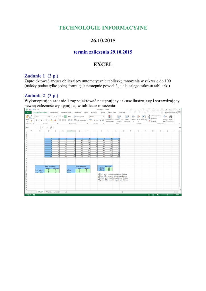 TECHNOLOGIE INFORMACYJNE 26.10.2015 termin zaliczenia 29.10.2015 EXCEL Zadanie 1 (3 p.) Zaprojektować arkusz obliczający automatycznie tabliczkę mnożenia w zakresie do 100 (należy podać tylko jedną formułę, a następnie powielić ją dla całego zakresu tabliczki). Zadanie 2 (3 p.) Wykor zystując zadanie 1 zapr ojektować następujący ar kusz ilustr ujący i spr awdzający pewną zależność występującą w tabliczce mnożenia: Wskazówka: Do wykonania zadania może pr zydać się funkcja INDEKS, for matowanie war unkowe, a w nim funkcje: ORAZ, LUB, WIERSZ, NR.KOLUMNY. Zadanie 3 (3 p.) Otwórz plik Jeziora_świata.xls. Przedstaw dane na wykresie z dwiema różnie skalowanymi osiami wartości. Dodaj tabelę danych do wykresu. Zadanie 4 (3 p.) Otwórz plik kwiaciarnia.xls, a następnie: a) zlicz utarg dla każdego roku, b) policz utarg każdej z kwiaciarni w latach 2012-2014, c) sprawdź, który artykuł przynosi największy zysk. Wskazówka: DANE->suma częściowa. Zadanie 5 (3 p.) Utwórz makro jak w poniższym przykładzie, które po naciśnięciu przycisku automatycznie obliczy nową pensję po podwyżce o X procent i wpisze ją w poprzednie miejsce. Wartość, o którą podnoszona jest pensja powinna zostać pobrana z pewnej ustalonej komórki.