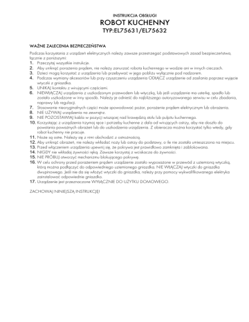 INSTRUKCJA OBSŁUGI ROBOT KUCHENNY TYP:EL75631/EL75632 WAŻNE ZALECENIA BEZPIECZEŃSTWA Podczas korzystania z urządzeń elektrycznych należy zawsze przestrzegać podstawowych zasad bezpieczeństwa, łącznie z poniższymi: 1. Przeczytaj wszystkie instrukcje. 2. Aby uniknąć porażenia prądem, nie należy zanurzać robota kuchennego w wodzie ani w innych cieczach. 3. Dzieci mogą korzystać z urządzenia lub przebywać w jego pobliżu wyłącznie pod nadzorem. 4. Podczas wymiany akcesoriów lub przy czyszczeniu urządzenia ODŁĄCZ urządzenie od zasilania poprzez wyjęcie wtyczki z gniazdka. 5. UNIKAJ kontaktu z wirującymi częściami. 6. NIEWŁĄCZAJ urządzenia z uszkodzonym przewodem lub wtyczką, lub jeśli urządzenie ma usterkę, spadło lub zostało uszkodzone w inny sposób. Należy je odnieść do najbliższego autoryzowanego serwisu w celu zbadania, naprawy lub regulacji. 7. Stosowanie nieoryginalnych części może spowodować pożar, porażenie prądem elektrycznym lub obrażenia. 8. NIE UŻYWAJ urządzenia na zewnątrz. 9. NIE POZOSTAWIAJ kabla w pozycji wiszącej nad krawędzią stołu lub pulpitu kuchennego. 10. Korzystając z urządzenia trzymaj ręce i potrzeby kuchenne z dala od wirujących ostrzy, aby nie doszło do powstania poważnych obrażeń lub do uszkodzenia urządzenia. Z obieracza można korzystać tylko wtedy, gdy robot kuchenny nie pracuje. 11. Noże są ostre. Należy się z nimi obchodzić z ostrożnością. 12. Aby uniknąć obrażeń, nie należy wkładać noży lub ostrzy do podstawy, o ile nie została umieszczona na miejscu. 13. Przed włączeniem urządzenia upewnij się, że pokrywa jest prawidłowo zamknięta i zablokowana. 14. NIGDY nie wkładaj żywności ręką. Zawsze korzystaj z wciskacza do żywności. 15. NIE PRÓBUJ otworzyć mechanizmu blokującego pokrywę. 16. W celu ochrony przed porażeniem prądem urządzenie zostało wyposażone w przewód z uziemioną wtyczką, którą można podłączyć do odpowiedniego uziemionego gniazdka. NIE WŁĄCZAJ wtyczki do gniazdka dwupinowego. Jeśli nie da się włożyć wtyczki do gniazdka, należy przy pomocy wykwalifikowanego elektryka zainstalować odpowiednie gniazdko. 17. Urządzenie jest przeznaczone WYŁĄCZNIE DO UŻYTKU DOMOWEGO. ZACHOWAJ NINIEJSZĄ INSTRUKCJĘ! CZĘŚCI I DZIAŁANIE PRZYGOTOWANIE ROBOTA KUCHENNEGO DO PRACY Przed użyciem robota kuchennego należy umyć wszystkie części oprócz podstawy w ciepłej wodzie ze środkiem myjącym. Opłukać je i wysuszyć. Poszczególne elementy można również myć w zmywarce na górnej półce. Nie umieszczać części do koszyka na naczynia ani w jego pobliżu. UWAGA: Noże są ostre, obchodź się z nimi ostrożnie. UWAGA: NIE WKŁADAJ podstawy z silnikiem robota do wody ani do innych cieczy. UWAGA: NIE KRUSZ lodu przy pomocy robota kuchennego, mógłby uszkodzić dzbanek i stępić nóż do krojenia. Urządzenie nie ubija śmietany ani białek jaj, nie mieli kawy, przypraw ani innych produktów o wysokiej zawartości oleju, nie kroi w plasterki i nie trze jaj gotowanych na twardo, marshmallow i miękkich serów. WAŻNE: Dla Twojego bezpieczeństwa urządzenie zostało wyposażone w blokadę. Robot nie będzie działać, dopóki dzbanek nie zostanie dobrze osadzony na podstawie a pokrywa dobrze zabezpieczona na dzbanku. Nie uruchamiaj urządzenia bez umieszczenia dzbanka, pokrywy dzbanka i pokrywy zasobnika żywności na właściwych miejscach. ZŁOŻENIE ROBOTA KUCHENNEGO MONTAŻ 1. Upewnij się, że przełącznik jest w pozycji WYŁ (OFF) a przewód zasilający został odłączony. 2. Przed rozpoczęciem pracy upewnij się, że podstawa robota jest na płaskiej, suchej, czystej i stabilnej powierzchni. 3. Zmontuj robota osadzając dzbanek na podstawę tak, aby uchwyt dzbanka był zgodny z rysunkiem Odblokuj na podstawie. Dzbanek zablokuj na podstawie obracając ją w kierunku odwrotnym do chodu zegara, dopóki dzbanek nie wskoczy na miejsce. Po zablokowaniu dzbanek jego uchwyt będzie wskazywał środek i przód (patrz rys. 1). ZŁOŻENIE ROBOTA KUCHENNEGO MONTAŻ ciąg dalszy UWAGA: Dzbanek jest blokowany na podstawie tylko w jednej pozycji. Urządzenie nie będzie pracować, jeśli dzbanek nie zostanie osadzony w podstawie. 4. Na dzbanek umieść pokrywę. Wyrównaj strzałkę na pokrywie z rysunkiem Odblokuj na dzbanku (patrz Rys. 2, 2a i 2b). Obracaj pokrywą w lewo do przodu, do momentu wskoczenia na miejsce. UWAGA: Pokrywa jest blokowana w dzbanku tylko w jednej pozycji. Urządzenie nie będzie działać, jeśli pokrywa nie zostanie zablokowana na dzbanku lub jeśli duży wciskacz nie zostanie włożony do owalnego zasobnika żywności. 5. Zestaw wciskaczy składa się z dużego i małego wciskacza. Wyrównaj wystającą krawędź na tylnej stronie dużego wciskacza z rowkiem do wyłącznika blokady startu. Duży wciskacz wsuń do owalnego zasobnika żywności. Potem nasuń mały wciskacz do okrągłego zasobnika w dużym wciskaczu. Patrz rys.3 i 3a. ZŁOŻENIE ROBOTA KUCHENNEGO MONTAŻ NOŻA Nałóż ostrze noża na tarczę redukcji napędu zgodnie z rysunkiem. Obracaj nożem w kierunku ruchu wskazówek zegara, do zatrzaśnięcia na miejscu PRACA Z ROBOTEM KUCHENNYM MANIPULACJA PULSE: Robot rozpocznie pracę po przekręceniu pokrętła w lewo na PULSE i przytrzymaniu. Po puszczeniu pokrętła powróci do pozycji OFF (WYŁ). Funkcja PULSE jest odpowiednia do krótkiej pracy, na przykład do mielenia orzechów, surowego mięsa lub warzyw. Funkcja umożliwia większą kontrolę konsystencji przetwarzanej żywności. ON: Obracając pokrętłem w prawo do pozycji ON (WŁ), uruchamia się stałą pracę urządzenia. Ten tryb pracy jest odpowiedni dla mniej podatnych produktów, które wymagają dłużej manipulacji. Po zakończeniu pracy, przekręć pokrętło do pozycji OFF (WYŁ). KROJENIE: 1. Zablokuj dzbanek w podstawie zgodnie z rozdziałem Montaż. 2. Nóż tnący osadź na środkowy trzpień (patrz rys. 4). UWAGA: Noże są 