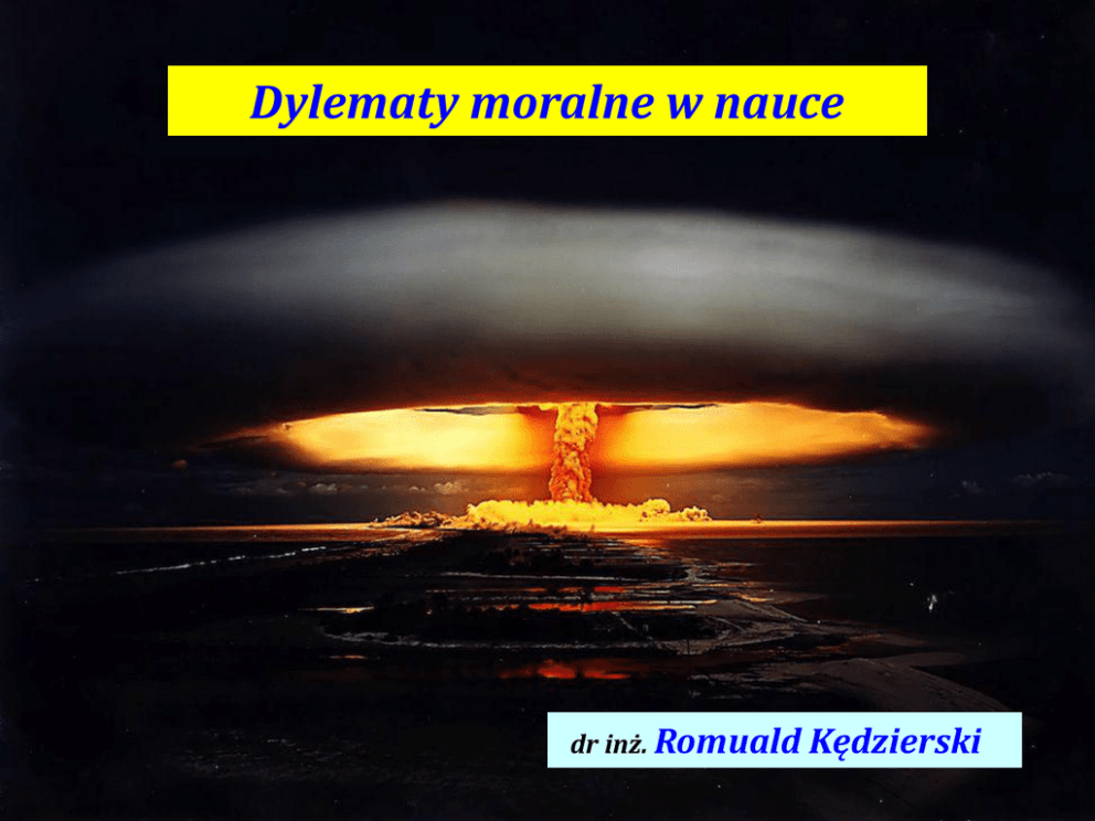 Dylematy moralne w nauce dr inż. Romuald Kędzierski Czym jest dylemat? słowo pochodzenia greckiego Oznacza konieczność wyboru pomiędzy dwoma (lub więcej) możliwościami, które wydają się jednakowo dobre lub jednakowo złe . Czy znaczenie tego słowa może być uważany za równoznaczne ze znaczeniem słów: problem, kłopot ? Nie! Problem, kłopot – to trudna sytuacja, która wymaga znalezienia rozwiązania. Z dylematem mamy do czynienia tylko sytuacjach, w których konieczne jest dokonanie wyboru pomiędzy możliwymi rozwiązaniami. Czym jest dylemat moralny? To znalezienie się w sytuacji, w której nie ma jednego dobrego – pod względem moralnym - wyboru. Na przykład: Czy konieczność obrony ojczyzny uzasadnia konstruowanie i użycie nowych rodzajów broni w celu skuteczniejszego zabijania wrogów? (Archimedes) Czy praca – za wynagrodzeniem – nad stworzeniem nowych rodzajów broni może być uważana za etyczną? (Leonardo da Vinci) Czy możliwość skrócenia drugiej wojny światowej usprawiedliwia użycie broni jądrowej przeciwko ludności cywilnej? Pracując w grupach dwuosobowych zapiszcie argumenty „za” i „nie” . Stawiając „krzyżyk” dokonajcie wyboru odpowiadającego sposobowi rozwiązania dylematu. Wasz wybór Lp. Dylemat Argumenty "za" Argumenty na "nie" TAK 1. Przeprowadzenie aborcji w przypadku ciąży będącej następstwem gwałtu, stwierdzenia ciężkiego uszkodzenia płodu itp. 2. Wykorzystanie zwierząt podczas badań mających na celu wyprodukowanie nowych leków przez koncerny farmaceutyczne. 3. Finansowanie badań kosmosu kosztem zmniejszenia wydatków na działania użyteczne dla zwykłego człowieka, np. zmniejszenie zanieczyszczenia środowiska 4. Prowadzenie badań prenatalnych 5. Klonowanie zwierząt w celu uzyskania wiedzy umożliwiającej sklonowanie ludzi NIE Komputer to logiczne ogniwo w rozwoju ludzkości: inteligencja bez moralności! John Osborne