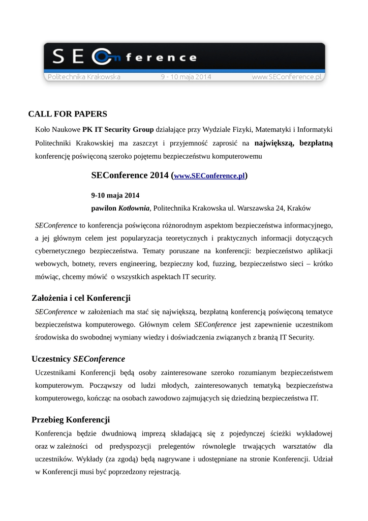 CALL FOR PAPERS Koło Naukowe PK IT Security Group działające przy Wydziale Fizyki, Matematyki i Informatyki Politechniki Krakowskiej ma zaszczyt i przyjemność zaprosić na największą, bezpłatną konferencję poświęconą szeroko pojętemu bezpieczeństwu komputerowemu SEConference 2014 (www.SEConference.pl) 9-10 maja 2014 pawilon Kotłownia, Politechnika Krakowska ul. Warszawska 24, Kraków SEConference to konferencja poświęcona różnorodnym aspektom bezpieczeństwa informacyjnego, a jej głównym celem jest popularyzacja teoretycznych i praktycznych informacji dotyczących cybernetycznego bezpieczeństwa. Tematy poruszane na konferencji: bezpieczeństwo aplikacji webowych, botnety, revers engineering, bezpieczny kod, fuzzing, bezpieczeństwo sieci – krótko mówiąc, chcemy mówić o wszystkich aspektach IT security. Założenia i cel Konferencji SEConference w założeniach ma stać się największą, bezpłatną konferencją poświęconą tematyce bezpieczeństwa komputerowego. Głównym celem SEConference jest zapewnienie uczestnikom środowiska do swobodnej wymiany wiedzy i doświadczenia związanych z branżą IT Security. Uczestnicy SEConference Uczestnikami Konferencji będą osoby zainteresowane szeroko rozumianym bezpieczeństwem komputerowym. Począwszy od ludzi młodych, zainteresowanych tematyką bezpieczeństwa komputerowego, kończąc na osobach zawodowo zajmujących się dziedziną bezpieczeństwa IT. Przebieg Konferencji Konferencja będzie dwudniową imprezą składającą się z pojedynczej ścieżki wykładowej oraz w zależności od predyspozycji prelegentów równolegle trwających warsztatów dla uczestników. Wykłady (za zgodą) będą nagrywane i udostępniane na stronie Konferencji. Udział w Konferencji musi być poprzedzony rejestracją. Zgłaszanie referatów Zapraszamy do nadsyłania zgłoszeń prelekcji na adres mailowy: Tomasz Strojny [email protected] W mailu prosimy zamieścić poniższe informacje: 1. tytuł/stopień naukowy* 2. imię i nazwisko 3. instytucja* 4. krótka biografia, kwalifikacje* 5. temat prelekcji i/lub warsztatu 6. krótki opis prezentacji i/lub warsztatu 7. dane kontaktowe (numer telefonu*, adres e-mail) 8. czy jesteś zainteresowany/a noclegiem * - opcjonalnie Notka biograficzna, temat prezentacji i opis zostaną opublikowane na stronie Konferencji oraz w materiałach konferencyjnych. Organizatorzy Koło Naukowe PK IT Security Group (http://pkitsec.fmi.pk.edu.pl) działające pod patronatem Politechniki Krakowskiej