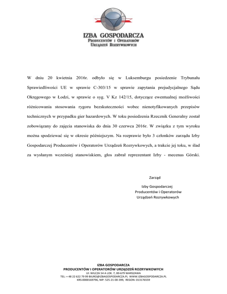 W dniu 20 kwietnia 2016r. odbyło się w Luksemburgu posiedzenie Trybunału Sprawiedliwości UE w sprawie C-303/15 w sprawie zapytania prejudycjalnego Sądu Okręgowego w Łodzi, w sprawie o syg. V Kz 142/15, dotyczące ewentualnej możliwości różnicowania stosowania rygoru bezskuteczności wobec nienotyfikowanych przepisów technicznych w przypadku gier hazardowych. W toku posiedzenia Rzecznik Generalny został zobowiązany do zajęcia stanowiska do dnia 30 czerwca 2016r. W związku z tym wyroku można spodziewać się w okresie późniejszym. Na rozprawie było 3 członków zarządu Izby Gospodarczej Producentów i Operatorów Urządzeń Rozrywkowych, a trakcie jej toku, w ślad za wysłanym wcześniej stanowiskiem, głos zabrał reprezentant Izby - mecenas Górski. Zarząd Izby Gospodarczej Producentów i Operatorów Urządzeń Rozrywkowych IZBA GOSPODARCZA PRODUCENTÓW I OPERATORÓW URZĄDZEŃ ROZRYWKOWYCH Ul: WILCZA 54 A LOK. 7, 00-679 WARSZAWA TEL: + 48 22 622 79 99 [email protected] WWW.IZBAGOSPODARCZA.PL KRS:0000169796, NIP: 525-21-00-399, REGON: 013176559
