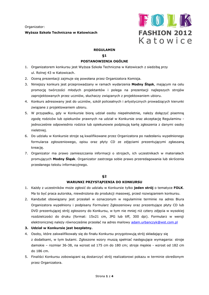 Organizator: Wyższa Szkoła Techniczna w Katowicach REGULAMIN §1 POSTANOWIENIA OGÓLNE 1. Organizatorem konkursu jest Wyższa Szkoła Techniczna w Katowicach z siedzibą przy ul. Rolnej 43 w Katowicach. 2. Oceną prezentacji zajmuje się powołana przez Organizatora Komisja. 3. Niniejszy konkurs jest przeprowadzany w ramach wydarzenia Modny Śląsk, mającym na celu promocję twórczości młodych projektantów i polega na prezentacji najlepszych strojów zaprojektowanych przez uczniów, słuchaczy związanych z projektowaniem ubioru. 4. Konkurs adresowany jest do uczniów, szkół policealnych i artystycznych prowadzących kierunki związane z projektowaniem ubioru. 5. W przypadku, gdy w Konkursie biorą udział osoby niepełnoletnie, należy dołączyć pisemną zgodę rodziców lub opiekunów prawnych na udział w Konkursie oraz akceptację Regulaminu jednocześnie odpowiednio rodzice lub opiekunowie podpisują kartę zgłoszenia z danymi osoby nieletniej. 6. Do udziału w Konkursie stroje są kwalifikowane przez Organizatora po nadesłaniu wypełnionego formularza zgłoszeniowego, opisu oraz płyty CD ze zdjęciami prezentującymi zgłaszaną kreację. 7. Organizator ma prawo zamieszczania informacji o strojach, ich uczestnikach w materiałach promujących Modny Śląsk. Organizator zastrzega sobie prawo przeredagowania lub skrócenia przesłanego tekstu informacyjnego. §2 WARUNKI PRZYSTĄPIENIA DO KONKURSU 1. Każdy z uczestników może zgłosić do udziału w Konkursie tylko jeden strój o tematyce FOLK. Ma to być praca autorska, niewdrożona do produkcji masowej, przed rozwiązaniem konkursu. 2. Kandydat obowiązany jest przesłań w oznaczonym w regulaminie terminie na adres Biura Organizatora wypełniony i podpisany Formularz Zgłoszeniowy oraz prezentujące płyty CD lub DVD prezentującej strój zgłoszony do Konkursu, w tym nie mniej niż cztery zdjęcia w wysokiej rozdzielczości do druku (format: 15x21 cm, JPG lub tiff, 300 dpi). Formularz w wersji elektronicznej należy równocześnie przesłać na adres mailowy [email protected] 3. Udział w Konkursie jest bezpłatny. 4. Osoby, które zakwalifikowały się do finału Konkursu przygotowują strój składający się z dodatkami, w tym butami. Zgłoszone wzory muszą spełniać następujące wymagania: stroje damskie – rozmiar 36-38, na wzrost od 175 cm do 180 cm; stroje męskie - wzrost od 182 cm do 186 cm. 5. Finaliści Konkursu zobowiązani są dostarczyć strój realizatorowi pokazu w terminie określonym przez Organizatora. Strona 1 z 4 6. W Konkursie nie mogą brać udziału osoby powołane do składu Jury oraz ich najbliższa rodzina. Za członków najbliższej rodziny Jury uznaje się ich wstępnych, zstępnych rodzeństwo, małżonków i osoby przysposobione. §3 ETAPY KONKURSU 1. Przesłanie do dnia 30.06.2012 (decyduje data stempla pocztowego) podpisanego zgłoszenia (w przypadku osób niepełnoletnich zgłoszenia podpisanego przez rodzica lub opiekuna pranego) z załączonymi zdjęciami na adres : Wyższa Szkoła Techniczna w Katowicach ul. Rolna 43, 40-555 Katowice z dopiskiem FOLK FASHION lub pocztą elektroniczną na adres: [email protected] 2. Do dnia 20.07.2012 Komisja Selekcyjna z nadesłanych zdjęć przedstawiających projekty wybiera nie więcej niż 24 najlepszych, informując autorów o zakwalifikowaniu się do grupy finalistów. 3. W dniu 24.08.2012 – w Katowicach odbędzie się uroczysta Gala Finałowa Konkursu. 4. Kandydaci obowiązani są dostarczyć pracę Organizatorowi nie później niż na 1 dzień przed wyznaczonym dniem pokazu. §4 KOMISJA I WYRÓŻNIENIA 1. Organizator powoła zespół oceniający, zwany w niniejszym Regulaminie Komisją, w skład którego wejdą: przedstawiciele Organizatora, styliści, kreatorzy mody, przedstawiciele mediów, komentatorzy działów mody. Komisja wyłoni ze swego grona Przewodniczącego i jego zastępcę. 2. Komisja pracuje niejawnie i jej decyzje są ostateczne. Członkowie Komisji zobowiązują się do utrzymania tajemnicy obrad do momentu ogłoszenia wyników. 3. Po obejrzeniu pokazów Komisja przyzna jedno główne wyróżnienie dla najlepszej kolekcji. 4. Komisja ogłosi werdykt i wręczy wyróżnienia projektantowi podczas gali. §5 NAGRODY 1. Jury Konkursu przyznaje nagrody za: I miejsce: Laptop, zwolnienie z opłaty wpisowej, zwolnienie z 1 rata czesnego, kontrakt z Firmą Usługową „Pięknografia” z siedzibą przy ulicy Wolności 291/9, 41-800 Zabrze obejmujący: a) Pokrycie kosztów materiałów oraz kosztów uszycia kolekcji, zaprojektowanej przez wybranego projektanta. b) Pokrycie kosztów profesjonalnej sesji zdjęciowej, fryzur, makijażu, stylizacji, pracy modeli/modelek w tym kosztów kampanii reklamowej. Strona 2 z 4 2. Gotowa kolekcja zostanie wystawiona również na sprzedaż w butiku oraz w butiku online, dzięki czemu trafi bezpośrednio do odbiorcy. Firma Usługowa „Pięknografia” z siedzibą przy ulicy Wolności 291/9, 41-800 Zabrze zorganizuje promocję danej kolekcji oraz sprzedaż i wysyłkę. Projektant otrzymuje 20% od sprzedaży kolekcji. W przypadku wdrożenia któregoś z projektów do produkcji projektant otrzymuje 20% od każdej sprzedanej rzeczy. Nagroda dotyczy kolekcji wiosna-lato 2013. Zadaniem projektanta będzie zaprojektowanie kolekcji casualowej damskiej lub męskiej do 5 sylwetek, oraz przygotowania projektów do uszycia w tym opis kolekcji, rysunki, rysunki techniczne i konstrukcje. II miejsce: Aparat fotograficzny, zwolnienie z 1 raty czesnego, III miejsce: Album książkowy, zwolnienie z opłaty wpisowej, 3. Kontrakt w Konkursie realizowany będzie na podstawie umowy z osobami trzecimi Organizator nie ponosi odpowiedzialności za realizację obowiązków osób trzecich wynikających z zawartych przez takie osoby z uczestnik kontraktów ani za ewentualne wady nagród. 4. Przyjęcia na studia laureatów Konkursu a) Miejsca będą przydzielone zgodnie z życzeniami wyrażonymi przez laureatów, w pr