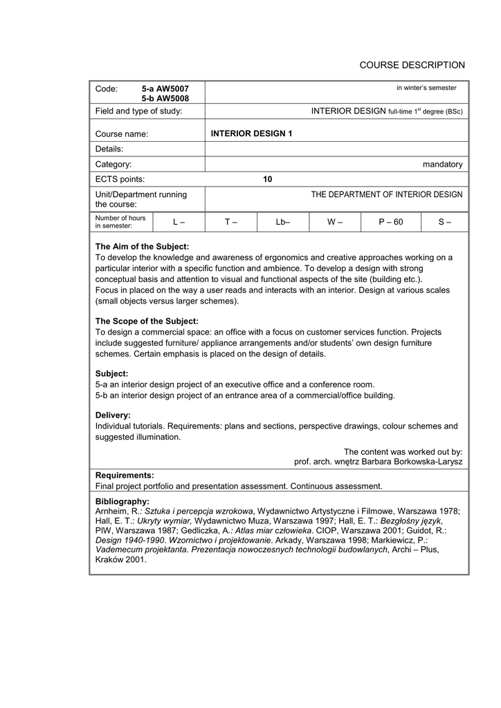 COURSE DESCRIPTION Code: in winter’s semester 5-a AW5007 5-b AW5008 INTERIOR DESIGN full-time 1st degree (BSc) Field and type of study: INTERIOR DESIGN 1 Course name: Details: Category: mandatory 10 ECTS points: Unit/Department running the course: Number of hours in semester: L– THE DEPARTMENT OF INTERIOR DESIGN T– Lb– W– P – 60 S– The Aim of the Subject: To develop the knowledge and awareness of ergonomics and creative approaches working on a particular interior with a specific function and ambience. To develop a design with strong conceptual basis and attention to visual and functional aspects of the site (building etc.). Focus in placed on the way a user reads and interacts with an interior. Design at various scales (small objects versus larger schemes). The Scope of the Subject: To design a commercial space: an office with a focus on customer services function. Projects include suggested furniture/ appliance arrangements and/or students’ own design furniture schemes. Certain emphasis is placed on the design of details. Subject: 5-a an interior design project of an executive office and a conference room. 5-b an interior design project of an entrance area of a commercial/office building. Delivery: Individual tutorials. Requirements: plans and sections, perspective drawings, colour schemes and suggested illumination. The content was worked out by: prof. arch. wnętrz Barbara Borkowska-Larysz Requirements: Final project portfolio and presentation assessment. Continuous assessment. Bibliography: Arnheim, R.: Sztuka i percepcja wzrokowa, Wydawnictwo Artystyczne i Filmowe, Warszawa 1978; Hall, E. T.: Ukryty wymiar, Wydawnictwo Muza, Warszawa 1997; Hall, E. T.: Bezgłośny język, PIW, Warszawa 1987; Gedliczka, A.: Atlas miar człowieka. CIOP, Warszawa 2001; Guidot, R.: Design 1940-1990. Wzornictwo i projektowanie. Arkady, Warszawa 1998; Markiewicz, P.: Vademecum projektanta. Prezentacja nowoczesnych technologii budowlanych, Archi – Plus, Kraków 2001. COURSE DESCRIPTION Code: in winter’s semester AW5012 INTERIOR DESIGN full-time 1st degree (BSc) Field and type of study: PRODUCT DESIGN Course name: Details: Category: elective 4 ECTS points: Unit/Department running the course: Number of hours in semester: L– THE DEPARTMENT Of INTERIOR DESIGN T– Lb – W– P – 30 S– The Aim of the Subject: To acquaint students with the spatial and ergonomic relations of spaces and objects placed within these. To explain and exemplify various basic technologies and materials which can be used in product design. The Scope of the Subject: The theoretical part of the module aims at comparative and contrastive comparisons between historical and more contemporary styles. The practical part of the module encourages students to experiment with various styles and technologies, and focuses on practice in workshops. Subject: Short design tasks. Small size product design projects. Delivery: Individual tutorials. The content was worked out by: prof. arch. wnętrz Barbara Borkowska-Larysz Requirements: Final portfolio hand-in and a scaled model. Bibliography: Gedliczka, A.: Atlas miar człowieka. CIOP, Warszawa 2001. Guidot, R.: Design 1940-1990. Wzornictwo i projektowanie. Arkady, Warszawa 1998. Huml I., Polska sztuka stosowana XX wieku, WaiF 1978. Tialve, E.: Projektowanie form wyrobów przemysłowych, Arkady, Warszawa 1984. COURSE DESCRIPTION Code: in winter’s semester AW5072 INTERIOR DESIGN full-time 1st degree (BSc) Field and type of study: GRAPHIC DESIGN 1 Course name: Details: Category: elective 4 ECTS points: Unit/Department running the course: Number of hours in semester: L– THE UNIT FOR VISUAL ARTS THE DEPARTMENT Of INTERIOR DESIGN T– Lb – W– P – 30 S– The Aim of the Subject: To teach students rules of visual communication and presentation through the use of various techniques. Different methods are used to create and combine symbols (logos), images and/or words (typography) to create a visual representation of ideas and messages. The Scope of the Subject: Students learn to operate in various modes/techniques: contrast of forms, dynamic versus static, white/black balance, surface. Subject: Specific topics presented in depth, as listed above. Delivery: Tutorials. The content was worked out by: dr Waldemar Regucki Requirements: Portfolio of drawings/works Bibliography: Piotr Rypson, Obraz słowa – historia poezji wizualnej; Aleš Krejča, Techniki sztuk graficznych; Danuta Wróblewska, Polska grafika współczesna, Polska grafika lat dziewięćdziesiątych ; Janina Wiercińska, Sztuka i ksiąŜka; Maciej Bóbr, Mistrzowie grafiki europejskiej; czasopisma: Graphis, 2+3D grafika plus produkt, Projekt. COURSE DESCRIPTION Code: in winter’s semester 2-a AW5002 2-b AW5003 INTERIOR DESIGN full-time 1st degree (BSc) Field and type of study: ARCHITECTURAL DESIGN Course name: Details: Category: elective 8 ECTS points: Unit/Department running the course: Number of hours in semester L– THE DEPARTMENT OF ARCHITECTURAL DESIGN THE HOUSING DESIGN STUDIO T– Lb – W– P – 45 S– The Aim of the Subject: To acquaint with ergonomics, aspects of design and architecture, the basics of methodology of architecture. The Scope of the Subject: Ideological, structural and spatial development of residential areas. Various rules and regulations are taken into account, depending on the location of residential buildings/complexes. Developing residential spaces within the context and local architectures. Subject: 2 a - project of a residential building with a services annex in a city centre 2 b - project of a residential building with garage spaces in a suburban area Delivery: Final project presentation: plans, sections, elevations of the developed solutions. Scaled model. 3d perspectival drawings. The content was worked out by: dr hab. inŜ. arch. GraŜyna Dąbrowska-Milewska Requirements: Final project portfolio and presentation assessment. Bibliography: Christopher Alexander: The Pattern Lan