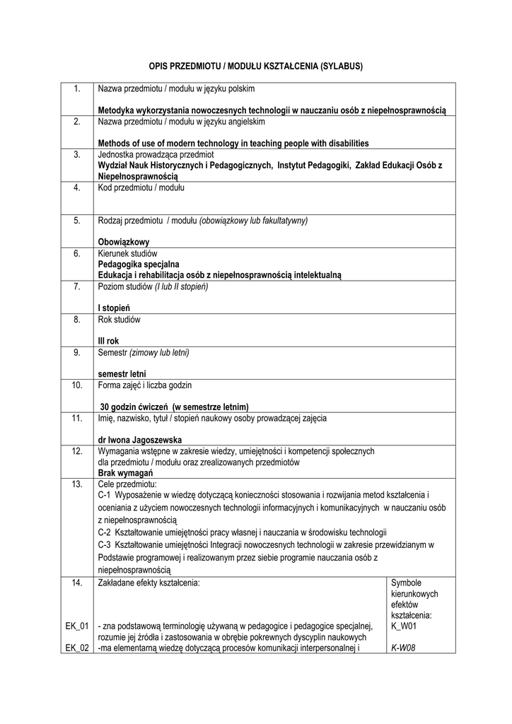 OPIS PRZEDMIOTU / MODUŁU KSZTAŁCENIA (SYLABUS) 1. Nazwa przedmiotu / modułu w języku polskim 2. Metodyka wykorzystania nowoczesnych technologii w nauczaniu osób z niepełnosprawnością Nazwa przedmiotu / modułu w języku angielskim 4. Methods of use of modern technology in teaching people with disabilities Jednostka prowadząca przedmiot Wydział Nauk Historycznych i Pedagogicznych, Instytut Pedagogiki, Zakład Edukacji Osób z Niepełnosprawnością Kod przedmiotu / modułu 5. Rodzaj przedmiotu / modułu (obowiązkowy lub fakultatywny) 3. 7. Obowiązkowy Kierunek studiów Pedagogika specjalna Edukacja i rehabilitacja osób z niepełnosprawnością intelektualną Poziom studiów (I lub II stopień) 8. I stopień Rok studiów 9. III rok Semestr (zimowy lub letni) 10. semestr letni Forma zajęć i liczba godzin 11. 30 godzin ćwiczeń (w semestrze letnim) Imię, nazwisko, tytuł / stopień naukowy osoby prowadzącej zajęcia 6. dr Iwona Jagoszewska 12. Wymagania wstępne w zakresie wiedzy, umiejętności i kompetencji społecznych dla przedmiotu / modułu oraz zrealizowanych przedmiotów Brak wymagań 13. Cele przedmiotu: C-1 Wyposażenie w wiedzę dotyczącą konieczności stosowania i rozwijania metod kształcenia i oceniania z użyciem nowoczesnych technologii informacyjnych i komunikacyjnych w nauczaniu osób z niepełnosprawnością C-2 Kształtowanie umiejętności pracy własnej i nauczania w środowisku technologii C-3 Kształtowanie umiejętności Integracji nowoczesnych technologii w zakresie przewidzianym w Podstawie programowej i realizowanym przez siebie programie nauczania osób z niepełnosprawnością 14. Zakładane efekty kształcenia: Symbole kierunkowych efektów kształcenia: EK_01 - zna podstawową terminologię używaną w pedagogice i pedagogice specjalnej, K_W01 rozumie jej źródła i zastosowania w obrębie pokrewnych dyscyplin naukowych EK_02 -ma elementarną wiedzę dotyczącą procesów komunikacji interpersonalnej i K-W08 EK_03 EK_04 EK_05 EK_06 EK_07 EK_08 EK_09 EK_10 EK_11 EK_12 15. 16. społecznej oraz ich prawidłowości i zakłóceń, zna specyfikę komunikowania się osób z różnymi formami i stopniami niepełnosprawności -posiada elementarną wiedzę o planowaniu i projektowaniu oraz strategiach K_W18 konstruowania procesu kształcenia ogólnego i specjalnego oraz upowszechniania wiedzy pedagogicznej ukierunkowaną na zastosowanie praktyczne szczególnie w działaniach na rzecz osób z niepełnosprawnością i niedostosowanych społecznie. -ma elementarną wiedzę o metodyce wykonywania typowych zadań, normach, KW_21 procedurach stosowanych w różnych obszarach działalności pedagogiki specjalnej -potrafi dokonać obserwacji i interpretacji zjawisk społecznych; analizuje ich K_U02 powiązania z różnymi obszarami pedagogiki specjalnej -ma rozwinięte umiejętności w zakresie komunikacji interpersonalnej, potrafi K_U06 używać języka specjalistycznego i porozumiewać się w sposób precyzyjny i spójny przy użyciu różnych kanałów i technik komunikacyjnych ze specjalistami w zakresie pedagogiki specjalnej, jak i z odbiorcami spoza grona specjalistów -potrafi animować prace nad rozwojem uczestników procesów edukacyjnych, K_U07 rehabilitacyjnych, wychowawczych i resocjalizacyjnych oraz wspierać ich samodzielność w zdobywaniu wiedzy, a także inspirować do działań na rzecz uczenia się przez całe życie -potrafi pracować w zespole pełniąc różne role; umie przyjmować i wyznaczać K_U08 zadania, ma elementarne umiejętności organizacyjne pozwalające na realizację celów związanych z projektowaniem i podejmowaniem działań profesjonalnych -potrafi wykorzystywać podstawową wiedzę teoretyczną z zakresu pedagogiki K_U10 specjalnej oraz powiązanych z nią dyscyplin w celu analizowania i interpretowania problemów rehabilitacyjnych, edukacyjnych, terapeutycznych, resocjalizacyjnych, wychowawczych, opiekuńczych, pomocowych -potrafi zaprogramować, ocenić przydatność typowych metod, procedur i dobrych K_U12 praktyk do realizacji zadań związanych z różnymi sferami działalności rehabilitacyjnej, edukacyjnej, terapeutycznej i resocjalizacyjnej oraz przeprowadzić zaprojektowane zajęcia -ma świadomość poziomu swojej wiedzy i umiejętności, rozumie potrzebę ciągłego K_K01 dokształcania się zawodowego i rozwoju osobistego, dokonuje samooceny własnych kompetencji i doskonali umiejętności, wyznacza kierunki własnego rozwoju i kształcenia -jest przygotowany do aktywnego uczestnictwa w grupach, organizacjach i K_K06 instytucjach realizujących działania z zakresu pedagogiki specjalnej i zdolny do porozumiewania się z osobami będącymi i niebędącymi specjalistami w danej dziedzinie Treści programowe: Sposoby i nowe możliwości zdobywania wiedzy poprzez wykorzystanie nowoczesnych technologii w nauczaniu osób z niepełnosprawnością. Praca w grupie – narzędzia wspomagające pracę i komunikację w grupie. Formułowanie problemów, etapy rozwiązywania problemu, ich ocena, szukanie najlepszych rozwiązań. Metoda projektu. Różnorodny sposób prezentacji informacji Zajęcia warsztatowe wspierające umiejętność studentów w stosowaniu i rozwijaniu swoich metody kształcenia w edukacji osób z niepełnosprawnościami ucząc w środowisku technologii informacyjnych. Wykorzystanie komputera z infrastrukturą – sieć/Internet, programy komputerowe w tym edukacyjne, platformy edukacyjne. Identyfikacja elementów kształcenia, w których możliwe jest wykorzystanie nowoczesnych technologii w nauczaniu osób z niepełnosprawnością, zarówno jako element danej dziedziny, jak i pomoc edukacyjna. Analiza programów pod kątem wykorzystania nowoczesnej technologii. Opracowanie przykładowych scenariuszy i konspektów zajęć z ich wykorzystaniem – praca w grupach. Zalecana literatura (podręczniki) Komputer dla ucznia – Podręcznik nauczyciela, OEIiZK, Warszawa 2008 17. 18. 19. A. Clarke , Multim