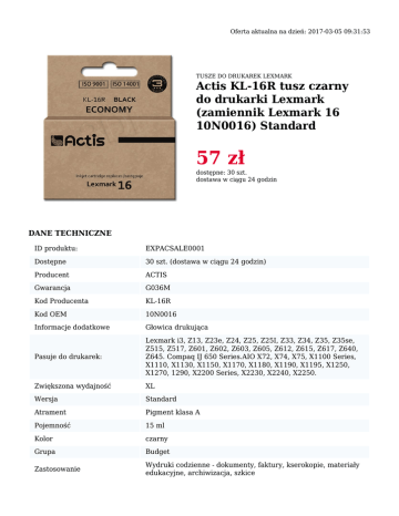 Oferta aktualna na dzień: 2017-03-05 09:31:53 TUSZE DO DRUKAREK LEXMARK Actis KL-16R tusz czarny do drukarki Lexmark (zamiennik Lexmark 16 10N0016) Standard 57 zł dostępne: 30 szt. dostawa w ciągu 24 godzin DANE TECHNICZNE ID produktu: EXPACSALE0001 Dostępne 30 szt. (dostawa w ciągu 24 godzin) Producent ACTIS Gwarancja G036M Kod Producenta KL-16R Kod OEM 10N0016 Informacje dodatkowe Głowica drukująca Pasuje do drukarek: Lexmark i3, Z13, Z23e, Z24, Z25, Z25I, Z33, Z34, Z35, Z35se, Z515, Z517, Z601, Z602, Z603, Z605, Z612, Z615, Z617, Z640, Z645. Compaq IJ 650 Series.AIO X72, X74, X75, X1100 Series, X1110, X1130, X1150, X1170, X1180, X1190, X1195, X1250, X1270, 1290, X2200 Series, X2230, X2240, X2250. Zwiększona wydajność XL Wersja Standard Atrament Pigment klasa A Pojemność 15 ml Kolor czarny Grupa Budget Zastosowanie Wydruki codzienne - dokumenty, faktury, kserokopie, materiały edukacyjne, archiwizacja, szkice Opakowanie Folia z wieszakiem www http://www.najtanszedrukowanie.pl www Orientacyjna waga brutto 56 g Orientacyjna waga brutto opak. zbior. 3405 g Ilość w opakowaniu zbiorczym - orientacyjnie 64 szt. Podane ceny są cenami brutto. ** Mimo dołożenia wszelkich starań nie gwarantujemy, że publikowane dane techniczne nie zawierają uchybień lub błędów. Ewentualne błędne opisy nie mogą być podstawą do roszczeń, dlatego w przypadku jakichkolwiek wątpliwości prosimy przed podjęciem decyzji o zakupie o kontakt z handlowcem. * GALERIA