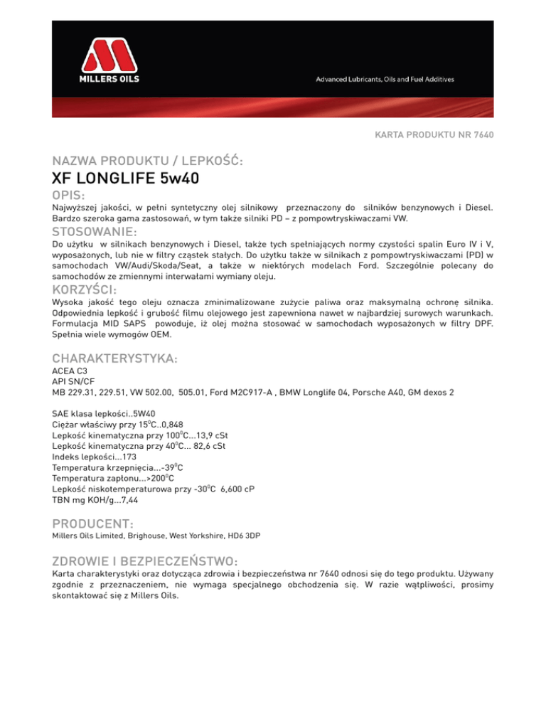KARTA PRODUKTU NR 7640 NAZWA PRODUKTU / LEPKOŚĆ: XF LONGLIFE 5w40 OPIS: Najwyższej jakości, w pełni syntetyczny olej silnikowy przeznaczony do silników benzynowych i Diesel. Bardzo szeroka gama zastosowań, w tym także silniki PD – z pompowtryskiwaczami VW. STOSOWANIE: Do użytku w silnikach benzynowych i Diesel, także tych spełniających normy czystości spalin Euro IV i V, wyposażonych, lub nie w filtry cząstek stałych. Do użytku także w silnikach z pompowtryskiwaczami (PD) w samochodach VW/Audi/Skoda/Seat, a także w niektórych modelach Ford. Szczególnie polecany do samochodów ze zmiennymi interwałami wymiany oleju. KORZYŚCI: Wysoka jakość tego oleju oznacza zminimalizowane zużycie paliwa oraz maksymalną ochronę silnika. Odpowiednia lepkość i grubość filmu olejowego jest zapewniona nawet w najbardziej surowych warunkach. Formulacja MID SAPS powoduje, iż olej można stosować w samochodach wyposażonych w filtry DPF. Spełnia wiele wymogów OEM. CHARAKTERYSTYKA: ACEA C3 API SN/CF MB 229.31, 229.51, VW 502.00, 505.01, Ford M2C917-A , BMW Longlife 04, Porsche A40, GM dexos 2 SAE klasa lepkości..5W40 Ciężar właściwy przy 150C..0,848 Lepkość kinematyczna przy 1000C...13,9 cSt Lepkość kinematyczna przy 400C... 82,6 cSt Indeks lepkości...173 Temperatura krzepnięcia...-390C Temperatura zapłonu...>2000C Lepkość niskotemperaturowa przy -300C 6,600 cP TBN mg KOH/g...7,44 PRODUCENT: Millers Oils Limited, Brighouse, West Yorkshire, HD6 3DP ZDROWIE I BEZPIECZEŃSTWO: Karta charakterystyki oraz dotycząca zdrowia i bezpieczeństwa nr 7640 odnosi się do tego produktu. Używany zgodnie z przeznaczeniem, nie wymaga specjalnego obchodzenia się. W razie wątpliwości, prosimy skontaktować się z Millers Oils.