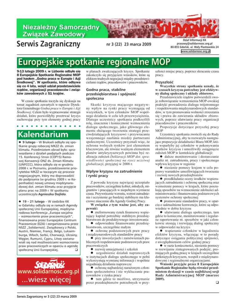 Serwis Zagraniczny Dział Informacji KK [email protected] 80-855 Gdańsk, ul. Wały Piastowskie 24 www.solidarnosc.org.pl nr 3 (22) 23 marca 2009 Europejskie spotkanie regionalne MOP 9-13 lutego 2009 r. w Lizbonie odbyło się 8 Europejskie Spotkanie Regionalne MOP pod hasłem „Godna praca w Europie i Azji Środkowej”. W spotkaniu, które odbywa się co 4 lata, wzięli udział przedstawiciele rządów, organizacji pracodawców i związków zawodowych z 51 krajów. W czasie spotkania toczyła się dyskusja na temat zagadnień zawartych w raporcie Dyrektora Generalnego Godna praca w Europie i Azji Środkowej. Celem było wypracowanie strategii działań, które pozwoliłyby przetrwać kryzys zachowując przy tym elementy godnej pracy Kalendarium 9 lutego – W Brukseli odbyło się spotkanie grupy roboczej MKZZ ds. zmian klimatu. Przedmiotem obrad było: sprawozdanie z działań podjętych podczas 15. Konferencji Stron (COP15) Ramowej Konwencji ONZ ds. Zmian Klimatu (UNFCCC), która odbyła się w grudniu 2008 r. w Poznaniu, przedstawienie priorytetów MKZZ w toczącym się procesie negocjacyjnym, który ma doprowadzić do podpisania (w grudniu 2009 r. w Kopenhadze) nowej umowy międzynarodowej dot. zmian klimatu oraz przyjęcie planu prac na 2009 r. W spotkaniu uczestniczyła Agnieszka Dojlido. 19 – 21 lutego – W siedzibie KK w Gdańsku odbyła się w ramach Agendy społecznej Unii Europejskiej, międzynarodowa konferencja „Europa socjalna – wzmocnienie praw pracowniczych”, finansowana przez Europejskie Centrum Pracownicze (EZA) i zorganizowana przez NSZZ „Solidarność. Związkowcy z Polski, Austrii, Niemiec, Francji, Belgii, Luksemburga, Włoch, Serbii, Chorwacji, Ukrainy, Węgier, Rumunii, Cypru, Litwy zastanawiali się nad możliwościami wzmocnienia praw pracowniczych w oparciu o agendę społeczną Unii Europejskiej. www.solidarnosc.org.pl ...wiesz więcej Serwis Zagraniczny nr 3 (22) 23 marca 2009 w planach zwalczających kryzys. Spotkanie zakończyło się przyjęciem wniosków, które są efektem trudnych negocjacji między przedstawicielami rządów, pracodawców i pracowników. Godna praca, stabilne przedsiębiorstwa i spójność społeczna Skutki kryzysu mającego negatywny wpływ na rynki pracy wymagają od wszystkich, w tym członków MOP wspólnego działania w celu ich przezwyciężenia. Dlatego uczestnicy spotkania podkreślili rolę, znaczenie i konieczność wzmocnienia dialogu społecznego, jako głównego elementu służącego tworzeniu strategii przeciwdziałających kryzysowi i przywracaniu wzajemnego zaufania miedzy partnerami społecznymi. Uczestnicy przyznali więc, że ochrona wolnych rynków jest elementem kluczowym, ale równie ważnym elementem planów antykryzysowych powinna być realizacja założeń Deklaracji MOP dot. sprawiedliwości społecznej na rzecz uczciwej globalizacji, przyjętej w 2008 r. Wpływ kryzysu na zatrudnienie i rynki pracy Z powodu kryzysu najwięcej ucierpiało pracowników, szczególnie kobiet, młodych, migrantów i pracujących w niepełnym wymiarze czasu. Przywrócenie wzrostu, wzrost zatrudnienia i uczynienie go bardziej stabilnym ma kluczowe znaczenie dla Agendy Godnej Pracy. W związku z tym ważne jest, aby zapewnić: zreformowany rynek finansowy wspierający kapitał potrzebny stabilnym przedsiębiorstwom do produktywnego inwestowania odpowiednie finansowanie przedsiębiorstwom, szczególnie małym ochronę podstawowych praw pracy i międzynarodowych standardów pracy przy inwestycjach i zamówieniach publicznych respektowanie podstawowych praw pracowniczych rozwój umiejętności i szkoleń uzgodnienie działań naprawczych w instytucjach dialogu społecznego w pełni wykorzystują wymianę informacji i wspólnie uzgadniają działania naprawcze ochronę najbardziej narażonym członkom społeczeństwa i nie wykluczanie pracowników z rynku pracy tam gdzie to możliwe, utrzymanie przez przedsiębiorców potrzebnych w przy- szłości miejsc pracy, poprzez skracanie czasu pracy. Przyszłość Wszystkie strony spotkania uznały, że w czasach kryzysu potrzebny jest efektywny dialog społeczny i układy zbiorowe. Przedstawiciele rządów potwierdzili swoje zobowiązanie wzmocnienia MOP-owskiej praktyki prowadzenia dialogu trójstronnego i respektowania międzynarodowych standardów, w tym promowania wolności zrzeszania się i prawa do zawierania układów zbiorowych, poprzez ułatwianie pracy organizacji pracodawców i pracowników. Propozycje dotyczące przyszłej pracy MOP Uczestnicy spotkania zwrócili się do Rady Administracyjnej, aby ta rozważyła następujące propozycje działalności Biura MOP, które wsparłyby jej członków w pokonywaniu skutków kryzysu i umożliwiły osiągnięcie założeń MOP w kontekście globalizacji: dalsze monitorowanie i dostarczanie analiz nt. zatrudnienia, pracy i społecznego wpływu kryzysu w regionie niesienie pomocy krajom w celu poprawy warunków umożliwiających tworzenie i rozwój nowych przedsiębiorstw przedkładanie oceny środków wspierających zatrudnienie i ochronę społeczną oraz wzmożenie pomocy w krajach, które poszukują sposobów na wzmocnienie zdolności administrowania i finansowania podstawowych systemów ochrony społecznej promowanie standardów pracy, w oparciu o uaktualnione konwencje, które są odpowiednie w dobie kryzysu ułatwianie dialogu społecznego, tam gdzie to konieczne, monitorowanie i regularne raportowanie nt. sposobów w jaki członkowie stosują i rozwijają dialog społeczny w odpowiedzi na kryzys wspieranie członków w łagodzeniu efektów kryzysu, włączając w to porady dotyczące osiągania politycznej spójności, z uwzględnieniem celów godnej pracy w razie konieczności, niesienie pomocy w rozwijaniu zintegrowanych podejść, promujących godną pracę w krajach szczególnie dotkniętych kryzysem, wespół z międzynarodowymi i regionalnymi organizacjami. Wnioski przyjęte przez 8 Europejskie Spotkanie Regionalne 