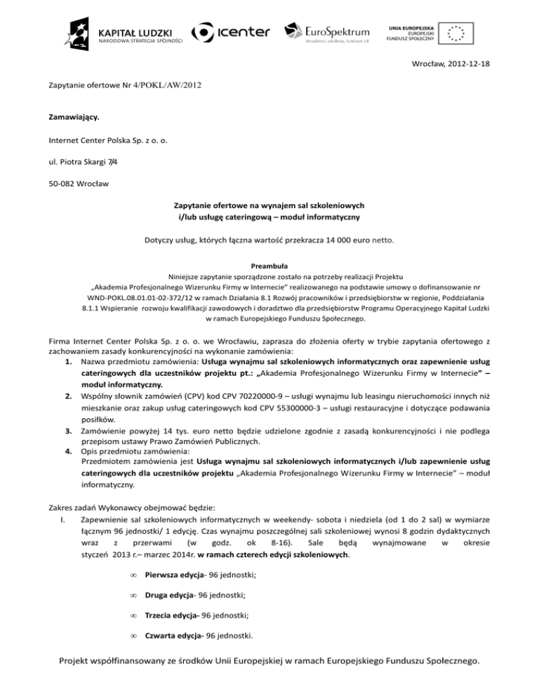 Wrocław, 2012-12-18 Zapytanie ofertowe Nr 4/POKL/AW/2012 Zamawiający. Internet Center Polska Sp. z o. o. ul. Piotra Skargi 7/4 50-082 Wrocław Zapytanie ofertowe na wynajem sal szkoleniowych i/lub usługę cateringową – moduł informatyczny Dotyczy usług, których łączna wartość przekracza 14 000 euro netto. Preambuła Niniejsze zapytanie sporządzone zostało na potrzeby realizacji Projektu „Akademia Profesjonalnego Wizerunku Firmy w Internecie” realizowanego na podstawie umowy o dofinansowanie nr WND-POKL.08.01.01-02-372/12 w ramach Działania 8.1 Rozwój pracowników i przedsiębiorstw w regionie, Poddziałania 8.1.1 Wspieranie rozwoju kwalifikacji zawodowych i doradztwo dla przedsiębiorstw Programu Operacyjnego Kapitał Ludzki w ramach Europejskiego Funduszu Społecznego. Firma Internet Center Polska Sp. z o. o. we Wrocławiu, zaprasza do złożenia oferty w trybie zapytania ofertowego z zachowaniem zasady konkurencyjności na wykonanie zamówienia: 1. Nazwa przedmiotu zamówienia: Usługa wynajmu sal szkoleniowych informatycznych oraz zapewnienie usług cateringowych dla uczestników projektu pt.: „Akademia Profesjonalnego Wizerunku Firmy w Internecie” – moduł informatyczny. 2. Wspólny słownik zamówień (CPV) kod CPV 70220000-9 – usługi wynajmu lub leasingu nieruchomości innych niż mieszkanie oraz zakup usług cateringowych kod CPV 55300000-3 – usługi restauracyjne i dotyczące podawania posiłków. 3. Zamówienie powyżej 14 tys. euro netto będzie udzielone zgodnie z zasadą konkurencyjności i nie podlega przepisom ustawy Prawo Zamówień Publicznych. 4. Opis przedmiotu zamówienia: Przedmiotem zamówienia jest Usługa wynajmu sal szkoleniowych informatycznych i/lub zapewnienie usług cateringowych dla uczestników projektu „Akademia Profesjonalnego Wizerunku Firmy w Internecie” – moduł informatyczny. Zakres zadań Wykonawcy obejmować będzie: I. Zapewnienie sal szkoleniowych informatycznych w weekendy- sobota i niedziela (od 1 do 2 sal) w wymiarze łącznym 96 jednostki/ 1 edycję. Czas wynajmu poszczególnej sali szkoleniowej wynosi 8 godzin dydaktycznych wraz z przerwami (w godz. ok 8-16). Sale będą wynajmowane w okresie styczeń 2013 r.– marzec 2014r. w ramach czterech edycji szkoleniowych. • Pierwsza edycja- 96 jednostki; • Druga edycja- 96 jednostki; • Trzecia edycja- 96 jednostki; • Czwarta edycja- 96 jednostki. Projekt współfinansowany ze środków Unii Europejskiej w ramach Europejskiego Funduszu Społecznego. Łącznie- 384 jednostek. Za jednostkę przyjmuje się wynajem jednej sali na jedną godzinę dydaktyczną wraz z przerwami. Szczegółowy harmonogram dotyczący terminów szkoleń w ramach 1 edycji stanowi załącznik nr 1. Harmonogramy dla kolejnych edycji będą przedstawiane przed rozpoczęciem zajęć w poszczególnych edycjach. Zleceniodawca zastrzega sobie możliwość późniejszych zmian w harmonogramie (po konsultacji z Wynajmującym). Niezbędne wymagania sal szkoleniowych • powierzchnia nie mniejsza niż 40 m2, gwarantująca optymalne warunki prowadzenia zajęć szkoleniowych w grupach 12 -osobowych + wykładowca (pomieszczenia z zapewnionym zapleczem do przeprowadzenia szkolenia, zgodnie z wymaganiami polskiego prawa, tj. odpowiednie warunki sanitarne, bezpieczeństwa, akustyczne i jakościowe. Sale winny posiadać odpowiednią ilość stołów i krzeseł - miękkich, z oparciem, przystosowanych do wzrostu dorosłego człowieka); • zapewniona obsługa techniczna w trakcie zajęć; • zapewniony dostęp do źródeł prądu; • stałe łącze o minimalnej przepustowości 4Mb/s; • min 13 stanowisk komputerowych: komputer z procesorem Pamięć RAM min. 4 GB, HDD wolnego dysku min 250, Monitor 19” • zapewnienie odpowiedniego oświetlenia: dostęp światła dziennego oraz całodobowe oświetlenie umożliwiające swobodne i bezpieczne dla wzroku czytanie, a zarazem możliwość zaciemnienia sali podczas prezentacji multimedialnej; • świeżo przeinstalowane systemy operacyjne przed każdą z kolejnych edycji szkoleniowych, • temperatura pomieszczeń: 20-24 stopnie Celsjusza z możliwością wentylacji; • zapewnione miejsce na umieszczenie serwisu kawowego dla uczestników szkoleń na korytarzu w pobliżu sal lub w innej wydzielonej sali; • zapewnione miejsce dla uczestników szkoleń na spożywanie obiadu (bez konieczności opuszczania budynku); • dostępność w godzinach określonych w opisie powyżej; • lokalizacja w centrum Wrocławia lub jego bezpośrednim pobliżu, w odległości nie większej niż 200 metrów od przystanku komunikacji miejskiej. min. Intel Core 2 duo, Pożądane wymagania sal szkoleniowych: • dostępne miejsce na przechowywanie odzieży wierzchniej i/lub bagażu; • położenie w miejscu, gdzie hałas komunikacyjny nie zakłóca prowadzenia zajęć; • II. w pobliżu sal, w dni szkoleniowe, powinny znajdować się bezpłatne miejsca parkingowe dla trenerów, obsługi, oraz uczestników. Zapewnienie usługi cateringowej dla uczestników projektu obejmującej: • 144 porcji obiadowych w ramach pierwszej edycji szkoleniowej; • 144 porcji obiadowych w ramach drugiej edycji; • 144 porcji obiadowych w ramach trzeciej edycji. • 144 porcji obiadowych w ramach czwartej edycji. Łącznie-576 porcji obiadowych dla uczestników szkoleń realizowanych w ramach projektu. W poszczególne dni szkoleniowe ilość posiłków będzie wynosiła od 12 do 24 i będzie ona zbieżna z ilością wynajmowanych sal (1 sala = 12 osób). Projekt współfinansowany ze środków Unii Europejskiej w ramach Europejskiego Funduszu Społecznego. • 144 jednostkowych serwisów kawowych dla uczestników szkoleń w ramach pierwszej edycji szkoleniowej; • 144 jednostkowych serwisów kawowych dla uczestników szkoleń w ramach drugiej edycji szkoleniowej; • 144 jednostkowych serwisów kawowych dla uczestników szkoleń w ramach trzeciej edycji szkoleniowej; • 144 jednostkowych se