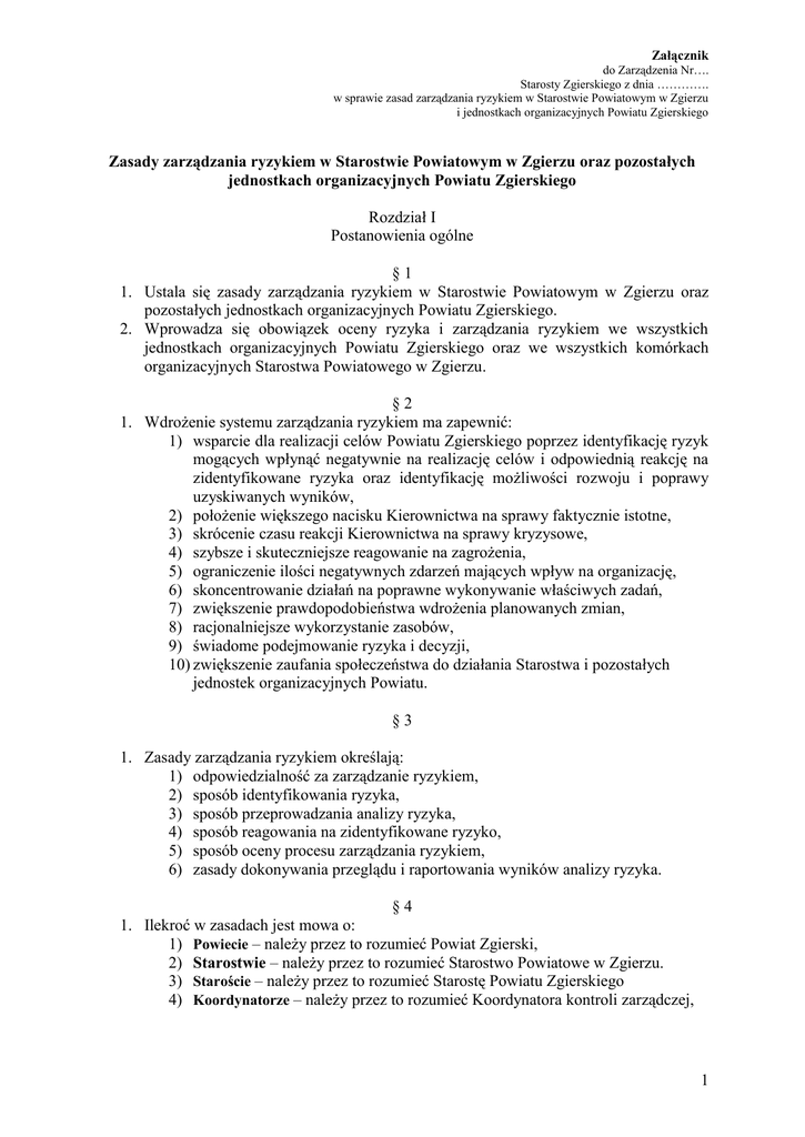 Załącznik do Zarządzenia Nr…. Starosty Zgierskiego z dnia …………. w sprawie zasad zarządzania ryzykiem w Starostwie Powiatowym w Zgierzu i jednostkach organizacyjnych Powiatu Zgierskiego Zasady zarządzania ryzykiem w Starostwie Powiatowym w Zgierzu oraz pozostałych jednostkach organizacyjnych Powiatu Zgierskiego Rozdział I Postanowienia ogólne §1 1. Ustala się zasady zarządzania ryzykiem w Starostwie Powiatowym w Zgierzu oraz pozostałych jednostkach organizacyjnych Powiatu Zgierskiego. 2. Wprowadza się obowiązek oceny ryzyka i zarządzania ryzykiem we wszystkich jednostkach organizacyjnych Powiatu Zgierskiego oraz we wszystkich komórkach organizacyjnych Starostwa Powiatowego w Zgierzu. §2 1. Wdrożenie systemu zarządzania ryzykiem ma zapewnić: 1) wsparcie dla realizacji celów Powiatu Zgierskiego poprzez identyfikację ryzyk mogących wpłynąć negatywnie na realizację celów i odpowiednią reakcję na zidentyfikowane ryzyka oraz identyfikację możliwości rozwoju i poprawy uzyskiwanych wyników, 2) położenie większego nacisku Kierownictwa na sprawy faktycznie istotne, 3) skrócenie czasu reakcji Kierownictwa na sprawy kryzysowe, 4) szybsze i skuteczniejsze reagowanie na zagrożenia, 5) ograniczenie ilości negatywnych zdarzeń mających wpływ na organizację, 6) skoncentrowanie działań na poprawne wykonywanie właściwych zadań, 7) zwiększenie prawdopodobieństwa wdrożenia planowanych zmian, 8) racjonalniejsze wykorzystanie zasobów, 9) świadome podejmowanie ryzyka i decyzji, 10) zwiększenie zaufania społeczeństwa do działania Starostwa i pozostałych jednostek organizacyjnych Powiatu. §3 1. Zasady zarządzania ryzykiem określają: 1) odpowiedzialność za zarządzanie ryzykiem, 2) sposób identyfikowania ryzyka, 3) sposób przeprowadzania analizy ryzyka, 4) sposób reagowania na zidentyfikowane ryzyko, 5) sposób oceny procesu zarządzania ryzykiem, 6) zasady dokonywania przeglądu i raportowania wyników analizy ryzyka. §4 1. Ilekroć w zasadach jest mowa o: 1) Powiecie – należy przez to rozumieć Powiat Zgierski, 2) Starostwie – należy przez to rozumieć Starostwo Powiatowe w Zgierzu. 3) Staroście – należy przez to rozumieć Starostę Powiatu Zgierskiego 4) Koordynatorze – należy przez to rozumieć Koordynatora kontroli zarządczej, 1 Załącznik do Zarządzenia Nr…. Starosty Zgierskiego z dnia …………. w sprawie zasad zarządzania ryzykiem w Starostwie Powiatowym w Zgierzu i jednostkach organizacyjnych Powiatu Zgierskiego 5) Kierowniku komórki organizacyjnej – należy przez to rozumieć Naczelników Wydziałów, Samodzielne Stanowiska, Koordynatorów Biur i Zespołów, 6) Kierowniku jednostki organizacyjnej – należy przez to rozumieć Dyrektorów jednostek organizacyjnych Powiatu Zgierskiego, 7) Audytorze wewnętrznym – należy przez to rozumieć koordynatora Biura Audytu wewnętrznego i Kontroli, zatrudnionego w Starostwie Powiatowym w Zgierzu, 8) Biurze Audytu wewnętrznego i Kontroli – należy przez to rozumieć komórkę organizacyjną Starostwa Powiatowego w Zgierzu, wypełniająca zadania z zakresu audytu wewnętrznego i kontroli instytucjonalnej, w stosunku do jednostek organizacyjnych Powiatu Zgierskiego, 9) Pracownikach – należy przez to rozumieć odpowiednio pracowników komórek organizacyjnych Starostwa i jednostek organizacyjnych Powiatu, 10) ryzyku – należy przez to rozumieć zdarzenie zagrażające realizacji zadań i osiąganiu celów jednostki/komórki organizacyjnej. 11) czynnikach ryzyka – należy przez to rozumieć zdarzenia, działania, zaniechania działania i inne okoliczności sprzyjające wystąpieniu ryzyka, 12) zarządzaniu ryzykiem – należy przez to rozumieć wykonywanie czynności w oparciu o przyjętą metodologię, dzięki której Kierownicy jednostek, komórek organizacyjnych określają, analizują i kontrolują ryzyko działalności, Rozdział II Odpowiedzialność za zarządzanie ryzykiem §5 1. Odpowiedzialność za prawidłowe wdrożenie systemu zarządzania ryzykiem w Starostwie ponosi Starosta. 2. Odpowiedzialność za prawidłowe wdrożenie systemu zarządzania ryzykiem w pozostałych jednostkach organizacyjnych Powiatu ponosi Kierownik jednostki organizacyjnej. 3. Koordynator kontroli zarządczej: 1) sprawuje nadzór nad procesem zarządzania ryzykiem w ramach systemu kontroli zarządczej I i II poziomu, 2) inicjuje działania niezbędne do prawidłowej organizacji systemu zarządzania ryzykiem i prawidłowego funkcjonowania procesu zarządzania ryzykiem na I i II poziomie systemu kontroli zarządczej, 3) weryfikuje zadania, cele, mierniki i ryzyka określone przez Kierowników jednostek organizacyjnych i komórek organizacyjnych. 4. Koordynator kontroli zarządczej przedkłada Staroście zweryfikowaną listę zadań, celów, mierników i ryzyk do zatwierdzenia, jak również bierze udział w procesie identyfikacji, analizy i oceny ryzyka dla Powiatu. 5. Kierownicy komórek odpowiedzialni za: organizacyjnych i jednostek organizacyjnych są 2 Załącznik do Zarządzenia Nr…. Starosty Zgierskiego z dnia …………. w sprawie zasad zarządzania ryzykiem w Starostwie Powiatowym w Zgierzu i jednostkach organizacyjnych Powiatu Zgierskiego 1) utworzenie listy zadań, celów w zarządzanej komórce oraz udokumentowanie listy zadań, celów zgodnie ze wzorem zamieszczonym w załączniku Nr 1 Część A, 2) dokumentowanie procesu identyfikacji i oceny ryzyka w komórce organizacyjnej oraz przeprowadzenie analizy zidentyfikowanego ryzyka zgodnie ze wzorem stanowiącym załącznik Nr 1 Część A 3) dokumentowanie procesu realizacji celów i zadań, zgodnie z załącznikiem Nr 1 cześć B 4) przekazanie wypełnionego załącznika Nr 1 część A i B do Biura Audytu wewnętrznego i Kontroli, 5) opracowywanie i inicjowanie wdrażania mechanizmów kontrolnych w jednostkach/komórkach organizacyjnych, 6) określanie istotności ryzyka i wdrażanie odpowiednich mechaniz