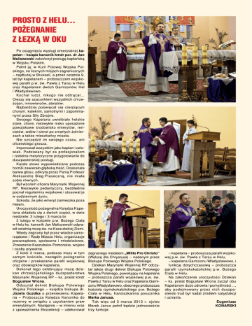 Prosto z Helu… pożegnanie z łezką w oku Po osiągnięciu wysługi emerytalnej kapelan – ksiądz kanonik kmdr por. dr Jan Maliszewski zakończył posługę kapłańską w Wojsku Polskim. Pełnił ją: w Kurii Polowej Wojska Polskiego, na licznych misjach zagranicznych – najdłużej w Brukseli, a przez ostatnie 9. lat był kapelanem – proboszczem wojskowej parafii p.w. św. Pawła z Tarsu w Helu oraz Kapelanem dwóch Garnizonów: Hel i Władysławowo. Kochał ludzi, nikogo nie odtrącał… Cieszy się szacunkiem wszystkich chrześcijan, innowierców, ateistów. Najbardziej poświęcał się cierpiącym chorym, kalekimi, samotnymi i zapomnianymi przez Siły Zbrojne. Swojego Kapelana uwielbiało helskie stare, chore, niezwykle nisko uposażone powojskowe środowisko emerytów, rencistów, wdów i sierot po zmarłych żołnierzach a także mieszkańcy miasta. Nie szczędził im swojego czasu, ani oficerskiego grosza. Imponował wszystkim jako kapłan i człowiek. Podziwiany był za profesjonalizm i rzetelne merytoryczne przygotowanie do duszpasterskiej posługi. Każde słowo wypowiedziane podczas homilii zawierało głęboką treść. Doskonała barwa głosu, odkryta przez Panią Profesor Aleksandrę Bieg-Piaseczną, nie miała sobie równych. Był wzorem oficera Marynarki Wojennej RP. Niezwykle pedantyczny, bezbłędnie poznał regulaminy wojskowe i stosował je w codziennym życiu. Szkoda, że jako emeryt zamieszka poza Helem. Uroczystość pożegnalna Księdza Kapelana składała się z dwóch części, w dwie niedziele: 3 lutego i 3 marca br. 3 lutego w kościele p.w. Bożego Ciała w Helu ks. kanonik Jan Maliszewski odprawił ostatnią mszę św. na Kaszubskiej Ziemi. Wtedy żegnany był przez władze samorządowe i Radę Miasta Helu, organizacje pozarządowe, społeczne i młodzieżowe, Zrzeszenie Kaszubsko-Pomorskie, wojsko i osoby prywatne. Z kolei 3 marca, podczas mszy w tym samym kościele, nastąpiło pożegnanie oficjalne i przekazanie parafii wojskowej oraz obowiązków kapelana. Dokonał tego celebrujący mszę dziekan chrześcijańskiego duszpasterstwa Marynarki Wojennej RP – ks. prałat kmdr Bogusław Wrona. Odczytał dekret Biskupa Polowego Wojska Polskiego – księdza biskupa dr. Józefa Guzdka o przeniesieniu Kapelana – Proboszcza Księdza Kanonika do rezerwy w związku z uzyskaniem praw emerytalnych. Następnie – w imieniu oraz z upoważnienia Ekscelencji – udekorował żegnanego medalem „Milito Pro Christo” (Walczę dla Chrystusa) – nadanym przez Biskupa Polowego Wojska Polskiego. Dziekan Marynarki Wojennej RP odczytał także drugi dekret Biskupa Polowego Wojska Polskiego, powołujący na kapelana – proboszcza parafii wojskowej p.w. św. Pawła z Tarsu w Helu oraz Kapelana Garnizonu Władysławowo, obecnego proboszcza kościoła rzymskokatolickiego p.w. Bożego Ciała w Helu, franciszkanina porucznika Marka Janusa. Tak więc od 3 marca 2013 r. ojciec Marek Janus pełnił będzie jednocześnie trzy funkcje: – kapelana – proboszcza parafii wojskowej p.w. św. Pawła z Tarsu w Helu, – kapelana Garnizonu Władysławowo, i funkcję dotychczasową – proboszcza parafii rzymskokatolickiej p.w. Bożego Ciała w Helu. Na zakończenie uroczystości Dziekan – ks. prałat Bogusław Wrona życzył obu Kapelanom dużo zdrowia i pomyślności…, aby podejmowany przez nich duszpasterski trud był nadal źródłem satysfakcji i uznania. Eugeniusz KONARSKI