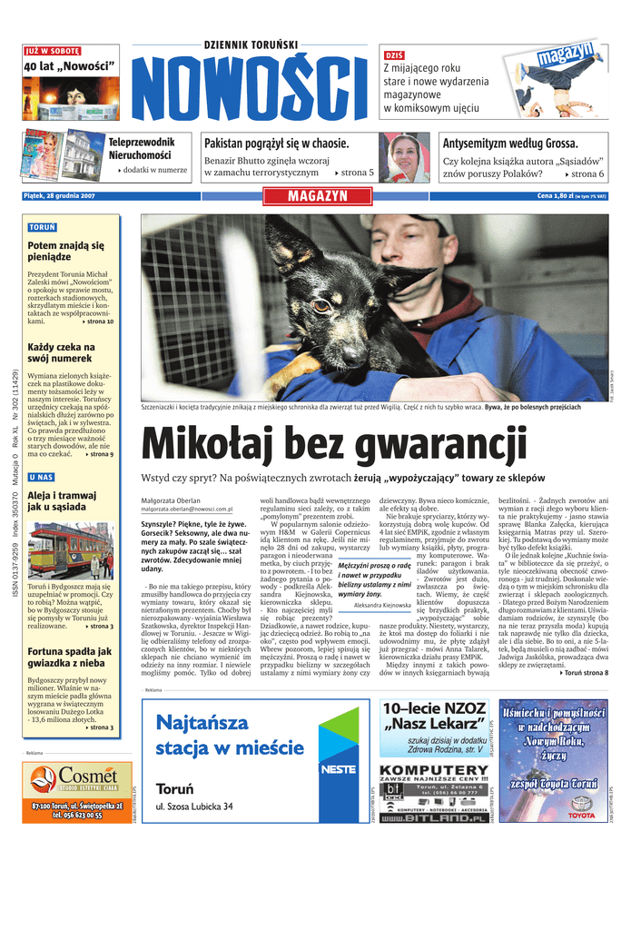 Konkurs skrzypcowy DZIENNIK TORUŃSKI ����������������� ����������������������������������������������������������������������������������������������� 40 lat „Nowości” ��������������� ���������� ���������������� ��������� Teleprzewodnik Nieruchomości ������������������� dodatki w numerze ���������� ��������������� �������� Benazir Bhutto zginęła wczoraj w zamachu terrorystycznym strona 5 ���� �� ���� Grossa. Antysemityzm według � ����� ������ „Sąsiadów” Czy kolejna książka autora znów poruszy Polaków? �������� ������ �������� ������� ��� �������� ����������� � ����������� ��������� ����������� Piątek, 28 grudnia 2007 ������ Pakistan pogrążył się w chaosie. ����� ������� ���� �������� ��� zieści lat to, muszę przyrzmi dumnie i od dzisiaj, nie nnego wyjścia, uwierzyłem e życie zaczyna się po cztere. ę, że dojrzały Nowości” dziej toruńoruńskich zawdzięCzytelktórych szeregi iły nam, rwanie udziesięspotykać ami na naszych łamach. ując historyczne, pożółkłe plarze „Nowości”, zestae z tymi coraz bardziej zesnymi, nie sposób oprzeć żeniu, że bez względu na ności byliśmy, jesteśmy i w to, że będziemy gazetą, ierwszym i najważniejszym orem od początku istnienia był Czytelnik. asadzie, pomimo czasów ch i burzliwych, toruński, a ż włocławski, grudziądzki dnicki dziennik zawsze ię być wierny i wierność ta nnie i niezmiennie do dziś a nam chwalić się okrągłą ą, której wiele gazet może ściom” jedynie pozazdrościć. yłoby „Nowości”, gdyby nie iennikarzy, reporterów, orterów, redaktorów, także nych, i wszystkich, którzy ałe lata dbali o markę toruńzety z niebieską winietą na zej stronie. y nie oni wraz ze swymi mi Czytelnikami, nie miałewątpliwego zaszczytu przy ego jubileuszu podziękować zystkim, którzy mają swój udział w „nowościowej” fedźcie, jak dotychczas, z nami astępne czterdzieści lat i eden dzień dłużej. mą i poważaniem ����������������� Z mijającego roku stare i nowe wydarzenia magazynowe w komiksowym ujęciu ������ ������ ���������������������������� �������������������������� ������������������������� ���������������������� DZIŚ ����� ������ ����������� ��� �������� JUŻ W SOBOTĘ �� ������ MAGAZYN �� ������ ���� ��������� ���� strona 6 ������� ���� •• Cena 1,80 zł (w tym 7% VAT) www.express.bydgoski.pl �� �� �������� �� �������� ���� �������� ���������� •• ��� ����������������� ��������� ���� ������ TORUŃ Potem znajdą się pieniądze Prezydent Torunia Michał Zaleski mówi „Nowościom” o spokoju w sprawie mostu, rozterkach stadionowych, skrzydlatym mieście i kontaktach ze współpracownistrona 10 kami. Fot. Jacek Smarz Wymiana zielonych książeczek na plastikowe dokumenty tożsamości leży w naszym interesie. Toruńscy urzędnicy czekają na spóźnialskich dłużej zarówno po świętach, jak i w sylwestra. Co prawda przedłużono o trzy miesiące ważność starych dowodów, ale nie strona 9 ma co czekać. Szczeniaczki i kocięta tradycyjnie znikają z miejskiego schroniska dla zwierząt tuż przed Wigilią. Część z nich tu szybko wraca. Bywa, że po bolesnych przejściach Mikołaj bez gwarancji Wstyd czy spryt? Na poświątecznych zwrotach żerują „wypożyczający” towary ze sklepów U NAS Aleja i tramwaj jak u sąsiada Małgorzata Oberlan [email protected] Szynszyle? Piękne, tyle że żywe. Gorsecik? Seksowny, ale dwa numery za mały. Po szale świątecznych zakupów zaczął się... szał zwrotów. Zdecydowanie mniej udany. Toruń i Bydgoszcz mają się uzupełniać w promocji. Czy to robią? Można wątpić, bo w Bydgoszczy stosuje się pomysły w Toruniu już strona 3 realizowane. - Bo nie ma takiego przepisu, który zmusiłby handlowca do przyjęcia czy wymiany towaru, który okazał się nietrafionym prezentem. Choćby był nierozpakowany - wyjaśnia Wiesława Szatkowska, dyrektor Inspekcji Handlowej w Toruniu. - Jeszcze w Wigilię odbieraliśmy telefony od zrozpaczonych klientów, bo w niektórych sklepach nie chciano wymienić im odzieży na inny rozmiar. I niewiele mogliśmy pomóc. Tylko od dobrej Fortuna spadła jak gwiazdka z nieba Bydgoszczy przybył nowy milioner. Właśnie w naszym mieście padła główna wygrana w świątecznym losowaniu Dużego Lotka - 13,6 miliona złotych. woli handlowca bądź wewnętrznego dziewczyny. Bywa nieco komicznie, regulaminu sieci zależy, co z takim ale efekty są dobre. Nie brakuje spryciarzy, którzy wy„pomylonym” prezentem zrobi. W popularnym salonie odzieżo- korzystują dobrą wolę kupców. Od wym H&M w Galerii Copernicus 4 lat sieć EMPiK, zgodnie z własnym idą klientom na rękę. Jeśli nie mi- regulaminem, przyj