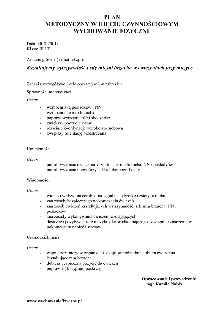plan metodyczny w ujęciu czynnościowym wychowanie fizyczne
