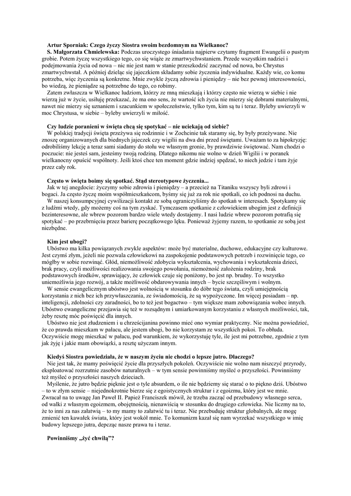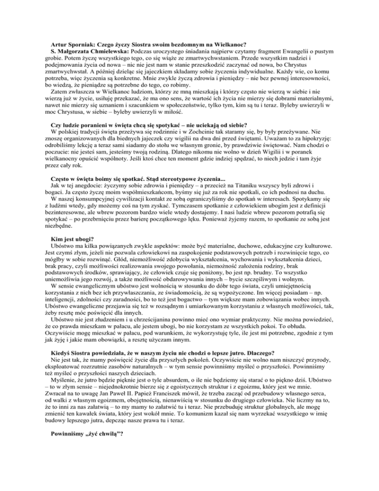 Artur Sporniak: Czego życzy Siostra swoim bezdomnym na Wielkanoc? S. Małgorzata Chmielewska: Podczas uroczystego śniadania najpierw czytamy fragment Ewangelii o pustym grobie. Potem życzę wszystkiego tego, co się wiąże ze zmartwychwstaniem. Przede wszystkim nadziei i podejmowania życia od nowa – nic nie jest nam w stanie przeszkodzić zaczynać od nowa, bo Chrystus zmartwychwstał. A później dzieląc się jajeczkiem składamy sobie życzenia indywidualne. Każdy wie, co komu potrzeba, więc życzenia są konkretne. Mnie zwykle życzą zdrowia i pieniędzy – nie bez pewnej interesowności, bo wiedzą, że pieniądze są potrzebne do tego, co robimy. Zatem zwłaszcza w Wielkanoc ludziom, którzy ze mną mieszkają i którzy często nie wierzą w siebie i nie wierzą już w życie, usiłuję przekazać, że ma ono sens, że wartość ich życia nie mierzy się dobrami materialnymi, nawet nie mierzy się uznaniem i szacunkiem w społeczeństwie, tylko tym, kim są tu i teraz. Byleby uwierzyli w moc Chrystusa, w siebie – byleby uwierzyli w miłość. Czy ludzie poranieni w święta chcą się spotykać – nie uciekają od siebie? W polskiej tradycji święta przeżywa się rodzinnie i w Zochcinie tak staramy się, by były przeżywane. Nie znoszę organizowanych dla biednych jajeczek czy wigilii na dwa dni przed świętami. Uważam to za hipokryzję: odrobiliśmy lekcję a teraz sami siadamy do stołu we własnym gronie, by prawdziwie świętować. Nam chodzi o poczucie: nie jesteś sam, jesteśmy twoją rodziną. Dlatego nikomu nie wolno w dzień Wigilii i w poranek wielkanocny opuścić wspólnoty. Jeśli ktoś chce ten moment gdzie indziej spędzać, to niech jedzie i tam żyje przez cały rok. Często w święta boimy się spotkać. Stąd stereotypowe życzenia... Jak w tej anegdocie: życzymy sobie zdrowia i pieniędzy – a przecież na Titaniku wszyscy byli zdrowi i bogaci. Ja często życzę moim współmieszkańcom, byśmy się już za rok nie spotkali, co ich podnosi na duchu. W naszej konsumpcyjnej cywilizacji kontakt ze sobą ograniczyliśmy do spotkań w interesach. Spotykamy się z ludźmi wtedy, gdy możemy coś na tym zyskać. Tymczasem spotkanie z człowiekiem ubogim jest z definicji bezinteresowne, ale wbrew pozorom bardzo wiele wtedy dostajemy. I nasi ludzie wbrew pozorom potrafią się spotykać – po przebrnięciu przez barierę początkowego lęku. Ponieważ żyjemy razem, to spotkanie ze sobą jest niezbędne. Kim jest ubogi? Ubóstwo ma kilka powiązanych zwykle aspektów: może być materialne, duchowe, edukacyjne czy kulturowe. Jest czymś złym, jeżeli nie pozwala człowiekowi na zaspokojenie podstawowych potrzeb i rozwinięcie tego, co mógłby w sobie rozwinąć. Głód, niemożliwość zdobycia wykształcenia, wychowania i wykształcenia dzieci, brak pracy, czyli możliwości realizowania swojego powołania, niemożność założenia rodziny, brak podstawowych środków, sprawiający, że człowiek czuje się poniżony, bo jest np. brudny. To wszystko uniemożliwia jego rozwój, a także możliwość obdarowywania innych – bycie szczęśliwym i wolnym. W sensie ewangelicznym ubóstwo jest wolnością w stosunku do dóbr tego świata, czyli umiejętnością korzystania z nich bez ich przywłaszczania, ze świadomością, że są wypożyczone. Im więcej posiadam – np. inteligencji, zdolności czy zaradności, bo to też jest bogactwo – tym większe mam zobowiązania wobec innych. Ubóstwo ewangeliczne przejawia się też w rozsądnym i umiarkowanym korzystaniu z własnych możliwości, tak, żeby resztę móc poświęcić dla innych. Ubóstwo nie jest złudzeniem i u chrześcijanina powinno mieć ono wymiar praktyczny. Nie można powiedzieć, że co prawda mieszkam w pałacu, ale jestem ubogi, bo nie korzystam ze wszystkich pokoi. To obłuda. Oczywiście mogę mieszkać w pałacu, pod warunkiem, że wykorzystuję tyle, ile jest mi potrzebne, zgodnie z tym jak żyję i jakie mam obowiązki, a resztę użyczam innym. Kiedyś Siostra powiedziała, że w naszym życiu nie chodzi o lepsze jutro. Dlaczego? Nie jest tak, że mamy poświęcić życie dla przyszłych pokoleń. Oczywiście nie wolno nam niszczyć przyrody, eksploatować rozrzutnie zasobów naturalnych – w tym sensie powinniśmy myśleć o przyszłości. Powinniśmy też myśleć o przyszłości naszych dzieciach. Myślenie, że jutro będzie pięknie jest o tyle absurdem, o ile nie będziemy się starać o to piękno dziś. Ubóstwo – to w złym sensie – niejednokrotnie bierze się z egoistycznych struktur i z egoizmu, który jest we mnie. Zwracał na to uwagę Jan Paweł II. Papież Franciszek mówił, że trzeba zacząć od przebudowy własnego serca, od walki z własnym egoizmem, obojętnością, nienawiścią w stosunku do drugiego człowieka. Nie liczmy na to, że to inni za nas załatwią – to my mamy to załatwić tu i teraz. Nie przebuduję struktur globalnych, ale mogę zmienić ten kawałek świata, który jest wokół mnie. To komunizm kazał się nam wyrzekać wszystkiego w imię budowy lepszego jutra, depcząc nasze prawa tu i teraz. Powinniśmy „żyć chwilą”? Tak. W chrześcijańskim sensie żyć chwilą, to wiedzieć, że tu i teraz jest ze mną Bóg. To nie zwalnia mnie z obowiązku myślenia o przyszłości, ale w jakimś sensie taka świadomość zapewnia mi poczucie bezpieczeństwa. Uwalnia mnie od zbytniego niepokoju i troski o jutro. Co nie oznacza, że nie powinniśmy planować przyszłości. Jeśli ktoś chce rozkręcić interes, musi zrobić biznesplan i sprawdzić, jaki jest rynek. Inaczej byłaby to beztroska. W życiu każdą chwilą nie chodzi o beztroskę. Chodzi o świadomość, że każda chwila jest niezwykle ważna (nie ma chwil mało ważnych) i że od tej chwili zależy chwila następna. Taka postawa jest wbrew naszej cywilizacji, która pożera czas, usiłuje go przeskoczyć – chce np., byśmy robili kilka rzeczy na raz. Ma być s