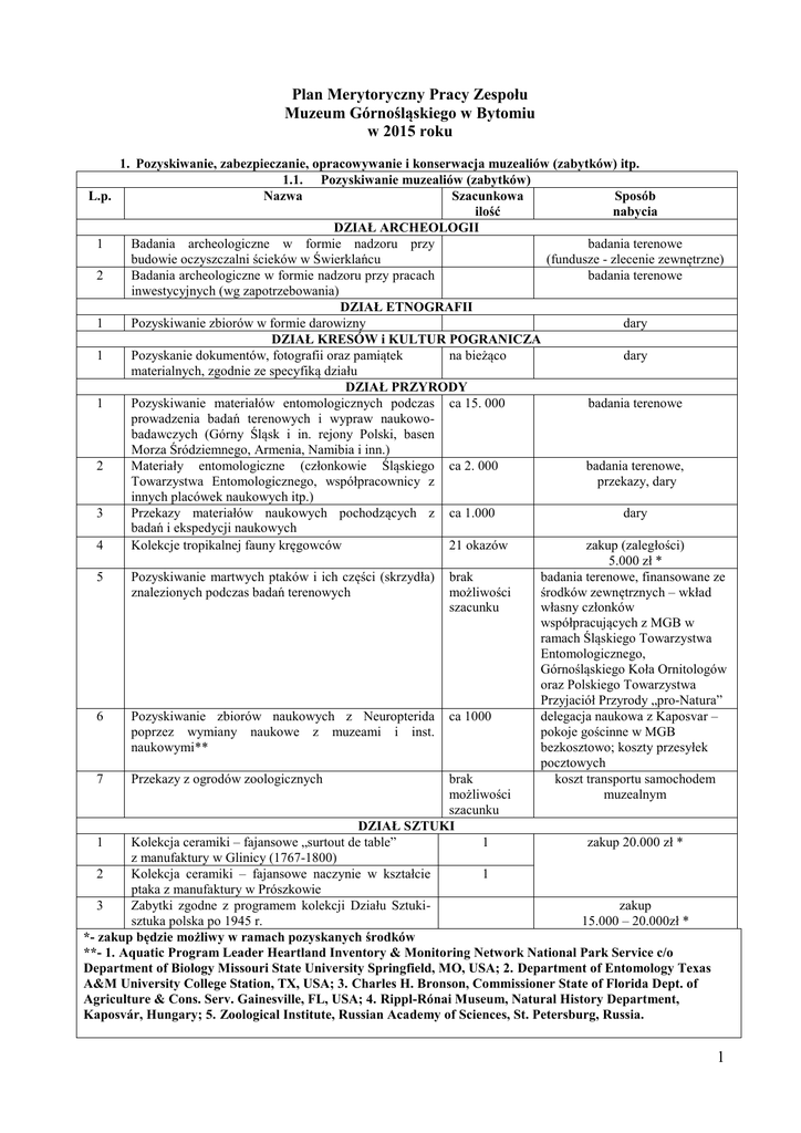 Plan Merytoryczny Pracy Zespołu Muzeum Górnośląskiego w Bytomiu w 2015 roku 1. Pozyskiwanie, zabezpieczanie, opracowywanie i konserwacja muzealiów (zabytków) itp. 1.1. Pozyskiwanie muzealiów (zabytków) L.p. Nazwa Szacunkowa Sposób ilość nabycia DZIAŁ ARCHEOLOGII 1 Badania archeologiczne w formie nadzoru przy badania terenowe budowie oczyszczalni ścieków w Świerklańcu (fundusze - zlecenie zewnętrzne) 2 Badania archeologiczne w formie nadzoru przy pracach badania terenowe inwestycyjnych (wg zapotrzebowania) DZIAŁ ETNOGRAFII 1 Pozyskiwanie zbiorów w formie darowizny dary DZIAŁ KRESÓW i KULTUR POGRANICZA 1 Pozyskanie dokumentów, fotografii oraz pamiątek na bieżąco dary materialnych, zgodnie ze specyfiką działu DZIAŁ PRZYRODY 1 Pozyskiwanie materiałów entomologicznych podczas ca 15. 000 badania terenowe prowadzenia badań terenowych i wypraw naukowobadawczych (Górny Śląsk i in. rejony Polski, basen Morza Śródziemnego, Armenia, Namibia i inn.) 2 Materiały entomologiczne (członkowie Śląskiego ca 2. 000 badania terenowe, Towarzystwa Entomologicznego, współpracownicy z przekazy, dary innych placówek naukowych itp.) 3 Przekazy materiałów naukowych pochodzących z ca 1.000 dary badań i ekspedycji naukowych 4 Kolekcje tropikalnej fauny kręgowców 21 okazów zakup (zaległości) 5.000 zł * 5 Pozyskiwanie martwych ptaków i ich części (skrzydła) brak badania terenowe, finansowane ze znalezionych podczas badań terenowych możliwości środków zewnętrznych – wkład szacunku własny członków współpracujących z MGB w ramach Śląskiego Towarzystwa Entomologicznego, Górnośląskiego Koła Ornitologów oraz Polskiego Towarzystwa Przyjaciół Przyrody „pro-Natura” 6 Pozyskiwanie zbiorów naukowych z Neuropterida ca 1000 delegacja naukowa z Kaposvar – poprzez wymiany naukowe z muzeami i inst. pokoje gościnne w MGB naukowymi** bezkosztowo; koszty przesyłek pocztowych 7 Przekazy z ogrodów zoologicznych brak koszt transportu samochodem możliwości muzealnym szacunku DZIAŁ SZTUKI 1 Kolekcja ceramiki – fajansowe „surtout de table” 1 zakup 20.000 zł * z manufaktury w Glinicy (1767-1800) 2 Kolekcja ceramiki – fajansowe naczynie w kształcie 1 ptaka z manufaktury w Prószkowie 3 Zabytki zgodne z programem kolekcji Działu Sztukizakup sztuka polska po 1945 r. 15.000 – 20.000zł * *- zakup będzie możliwy w ramach pozyskanych środków **- 1. Aquatic Program Leader Heartland Inventory & Monitoring Network National Park Service c/o Department of Biology Missouri State University Springfield, MO, USA; 2. Department of Entomology Texas A&M University College Station, TX, USA; 3. Charles H. Bronson, Commissioner State of Florida Dept. of Agriculture & Cons. Serv. Gainesville, FL, USA; 4. Rippl-Rónai Museum, Natural History Department, Kaposvár, Hungary; 5. Zoological Institute, Russian Academy of Sciences, St. Petersburg, Russia. 1 2. Katalogowanie i naukowe opracowanie zabytków L.p. Nazwa kolekcji/ zabytków/ obiektów 1 2 3 4 5 6 1 2 1 2 3 4 1 2 3 1 L.p. 1 2 2 Szacunkowa ilość DZIAŁ ARCHEOLOGII Materiały z cmentarzyska kultury łużyckiej w 720 Krzanowicach Materiały z cmentarzyska kultury łużyckiej w 410 Będzinie-Łagiszy Materiały z cmentarzyska kultury łużyckiej w 310 Przeczycach Materiały z cmentarzyska kultury łużyckiej w 400 Przeczycach Materiały zabytkowe ze stanowisk w Gliwicach236 Sobiszowicach Materiały zabytkowe z zamku w Siewierzu 360 DZIAŁ ETNOGRAFII Katalogowanie i naukowe opracowanie zbiorów w 2.160 systemie MUSNET (zgodnie z numeracją księgi inwentarzowej) Prace nad stworzeniem katalogu dokumentacji fotograficznej z badań terenowych, selekcja zdjęć, selekcja zdjęć bez praw autorskich oraz kopii, identyfikacja fotografii, przypisanie kliszy DZIAŁ KRESÓW i KULTUR POGRANICZA Katalogowanie i naukowe opracowanie zbiorów w ok. 2880 systemie Musnet Opracowanie przeprowadzonych wywiadów (nagrań filmowych/ fonicznych). Transkrypcja wywiadów i uzupełnianie tychże o dokumentację fotograficzną Sporządzenie dokumentacji (opisowofotograficznej) z badań terenowych inne według potrzeb Uwagi współpraca z pracownią fotograficzną zbiór plakatu, kolekcja fotografii kresowych Józefa Dańdy, kolekcja polskich i polonijnych odznak sokolskich koszta delegacji, odbitek fotografii ok. 300 zł przygotowanie dokumentacji opisowo-fotograficznej pomnika Ściana Pamięci na cmentarzu żydowskim w Bytomiu Opracowywanie i katalogowanie dokumentacji na bieżąco zastępczej (pkt. 1.3) DZIAŁ PRZYRODY Kolekcja kręgowców 700 Kolekcje entomologiczne 2.000 Kolekcje zielnikowe 3.000 DZIAŁ SZTUKI Katalogowanie i naukowe opracowanie zbiorów w 720 systemie Musnet (kolekcje: grafiki i rysunku polskiego, malarstwa polskiego, malarstwo obce z kolekcji generała Józefa Zająca) Biblioteka Cel Ilość Efekt Powiększanie księgozbioru 50 vol pozyskiwanie książek i czasopism drogą zakupu i prenumeraty: 700 vol -powiększanie księgozbioru nabytkami bezpłatnymi 10 vol (wymiana, dary, egzemplarze okazowe) 100 vol -uzupełnianie zbioru map i planów (zakup, dary, wymiana) -rozszerzenie i uzupełnienie katalogu nadbitek Szczegółowa ewidencja wpływów wszystkie -akcesja i inwentaryzacja nabytków rocznych nabytki -ustalanie szacunkowej wartości materiałów bezpłatnych roczne przez Komisję Kwalifikacji i Zakupu Muzealiów oraz Wyceny Darów 2.a. Digitalizacja L.p. Nazwa kolekcji/ zabytków/ obiektów DZIAŁ ARCHEOLOGII 1 Materiały z cmentarzyska kultury łużyckiej w Krzanowicach 2 Materiały z cmentarzyska kultury łużyckiej w Będzinie-Łagiszy 3 Materiały z cmentarzyska kultury łużyckiej w Przeczycach 4 Materiały z cmentarzyska kultury łużyckiej w Przeczycach 5 Materiały zabytkowe ze stanowisk w Gliwicach-Sobiszowicach 6 Materiały zabytkowe z zamku w Siewierzu Ilość 720 410 310 400 236 360 Razem 2436 DZIAŁ ETNOGRAFII 1 2 3 4 5 6 7 8 Srebra cieszyńskie, biżuteria śląska Hafty, koronki koniakowsk