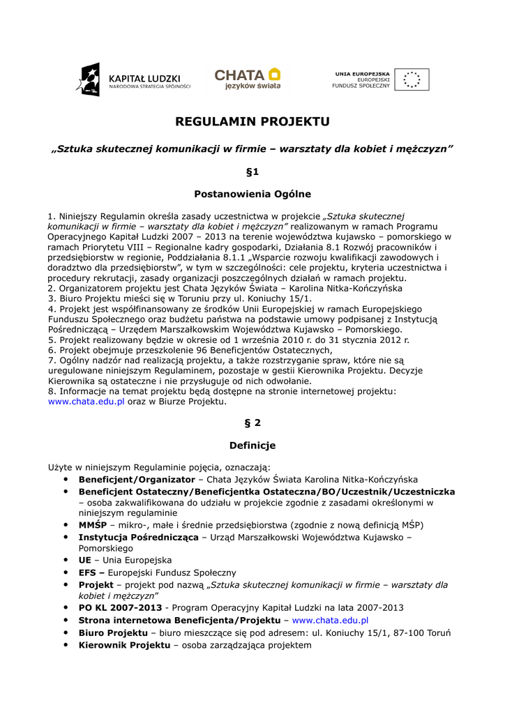 REGULAMIN PROJEKTU „Sztuka skutecznej komunikacji w firmie – warsztaty dla kobiet i mężczyzn” §1 Postanowienia Ogólne 1. Niniejszy Regulamin określa zasady uczestnictwa w projekcie „Sztuka skutecznej komunikacji w firmie – warsztaty dla kobiet i mężczyzn” realizowanym w ramach Programu Operacyjnego Kapitał Ludzki 2007 – 2013 na terenie województwa kujawsko – pomorskiego w ramach Priorytetu VIII – Regionalne kadry gospodarki, Działania 8.1 Rozwój pracowników i przedsiębiorstw w regionie, Poddziałania 8.1.1 „Wsparcie rozwoju kwalifikacji zawodowych i doradztwo dla przedsiębiorstw”, w tym w szczególności: cele projektu, kryteria uczestnictwa i procedury rekrutacji, zasady organizacji poszczególnych działań w ramach projektu. 2. Organizatorem projektu jest Chata Języków Świata – Karolina Nitka-Kończyńska 3. Biuro Projektu mieści się w Toruniu przy ul. Koniuchy 15/1. 4. Projekt jest współfinansowany ze środków Unii Europejskiej w ramach Europejskiego Funduszu Społecznego oraz budżetu państwa na podstawie umowy podpisanej z Instytucją Pośredniczącą – Urzędem Marszałkowskim Województwa Kujawsko – Pomorskiego. 5. Projekt realizowany będzie w okresie od 1 września 2010 r. do 31 stycznia 2012 r. 6. Projekt obejmuje przeszkolenie 96 Beneficjentów Ostatecznych, 7. Ogólny nadzór nad realizacją projektu, a także rozstrzyganie spraw, które nie są uregulowane niniejszym Regulaminem, pozostaje w gestii Kierownika Projektu. Decyzje Kierownika są ostateczne i nie przysługuje od nich odwołanie. 8. Informacje na temat projektu będą dostępne na stronie internetowej projektu: www.chata.edu.pl oraz w Biurze Projektu. §2 Definicje Użyte w niniejszym Regulaminie pojęcia, oznaczają: • Beneficjent/Organizator – Chata Języków Świata Karolina Nitka-Kończyńska • Beneficjent Ostateczny/Beneficjentka Ostateczna/BO/Uczestnik/Uczestniczka – osoba zakwalifikowana do udziału w projekcie zgodnie z zasadami określonymi w niniejszym regulaminie • MMŚP – mikro-, małe i średnie przedsiębiorstwa (zgodnie z nową definicją MŚP) • Instytucja Pośrednicząca – Urząd Marszałkowski Województwa Kujawsko – Pomorskiego • UE – Unia Europejska • EFS – Europejski Fundusz Społeczny • Projekt – projekt pod nazwą „Sztuka skutecznej komunikacji w firmie – warsztaty dla kobiet i mężczyzn” • PO KL 2007-2013 - Program Operacyjny Kapitał Ludzki na lata 2007-2013 • Strona internetowa Beneficjenta/Projektu – www.chata.edu.pl • Biuro Projektu – biuro mieszczące się pod adresem: ul. Koniuchy 15/1, 87-100 Toruń • Kierownik Projektu – osoba zarządzająca projektem §3 Cele Projektu Celem głównym projektu jest podniesienie do grudnia 2011 r kwalifikacji językowych i umiejętności społecznych oraz komunikacyjnych sprzyjających rozwojowi zawodowemu u 96 osób (w tym min. 39 osób z grupy 45+ i min. 60% kobiet) pracujących w MMŚP posiadających siedzibę lub oddział na terenie województwa kujawsko-pomorskiego Cele szczegółowe projektu to: 1. Zwiększenie dostępu do szkoleń wysokiej jakości prowadzonych w formie warsztatowej, 2. Podniesienie sprawności posługiwania się j. angielskim na swoim stanowisku pracy, 3. Podniesienie umiejętności społecznych, komunikacyjnych oraz organizacyjnych, w tym w szczególności: • świadome posługiwanie się osobistym kodem językowym oraz kontrolowanie związanych z nim zachowań • empiryczne poznanie i ugruntowanie własnych kompetencji komunikacyjnych i organizacyjnych • zwiększenie efektywności pracy, jakości prowadzonych spotkań indywidualnych, zebrań, dyskusji i prezentacji, a także rozmów oceniających i dyscyplinujących, • podwyższenie wydajności współpracy i organizacji czasu na realizację obowiązków i zadań 4. Przyczynienie się do zniesienia nierówności płci i zapobieganie dyskryminacji kobirt poprzez uświadomienie uczestnikom roli i atutów kobiet w strukturze firmy, 5. Wzrost satysfakcji z pracy zawodowej i pewności siebie. §4 Kryteria kwalifikacyjne 1. W projekcie mogą wziąć udział osoby, które jednocześnie: • są pracownikami lub kadrą zarządzającą mikro-, małych i średnich przedsiębiorstw posiadających oddział lub siedzibę na terenie województwa kujawsko-pomorskiego, z wyłączeniem osób fizycznych prowadzących działalność gospodarczą i pracowników wnioskodawcy, • są zamieszkałe na terenie województwa kujawsko-pomorskiego • ukończyły 18 rok życia i z własnej inicjatywy zainteresowane są podwyższeniem swoich kwalifikacji, poza godzinami pracy i miejscem zatrudnienia, • znają język angielski przynajmniej na poziomie podstawowym (około 500 słów i zwrotów) 2. Pracownicy zatrudnieni u jednego przedsiębiorcy nie mogą stanowić więcej niż 20% uczestników projektu. §5 Rekrutacja – zasady ogólne 1. Rekrutację do udziału w projekcie prowadzi Biuro Projektu. 2. Procedura rekrutacji obejmuje wypełnienie i osobiste dostarczenie do Biura Projektu formularza zgłoszeniowego wraz z załącznikami: a) zaświadczenie o zatrudnieniu od pracodawcy, b) kopia dowodu osobistego z potwierdzeniem jej zgodności z oryginałem. Powyższe dokumenty są dostępne na stronie www projektu oraz w Biurze Projektu. 3. Po złożeniu dokumentów Organizator zweryfikuje je i wpisze kandydata/kandydatkę na wstępną listę Beneficjentów Ostatecznych oraz poinformuje (telefonicznie) o wyznaczonym terminie rozmowy kwalifikacyjnej. 4. Podczas rekrutacji o kolejności zakwalifikowania na szkolenie będą decydowały następujące kryteria: a) wynik rozmowy rekrutacyjnej potwierdzającej przydatność projektu dla kandydata (0-3 punkty) b) ukończony 45 rok życia – dodatkowe 2 punkty c) płeć – dodatkowy 1 punkt d) poziom znajomości języka (ograniczona liczba miejsc w grupach) 5. Beneficjent Ostateczny, u którego pomyślnie przebiegł proces rekrutacji, zostanie poinformow