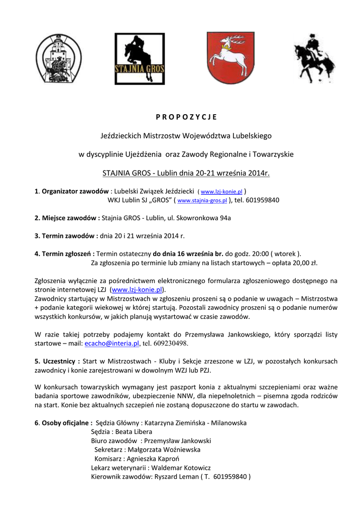 PROPOZYCJE Jeździeckich Mistrzostw Województwa Lubelskiego w dyscyplinie Ujeżdżenia oraz Zawody Regionalne i Towarzyskie STAJNIA GROS - Lublin dnia 20-21 września 2014r. 1. Organizator zawodów : Lubelski Związek Jeździecki ( www.lzj-konie.pl ) WKJ Lublin SJ „GROS” ( www.stajnia-gros.pl ), tel. 601959840 2. Miejsce zawodów : Stajnia GROS - Lublin, ul. Skowronkowa 94a 3. Termin zawodów : dnia 20 i 21 września 2014 r. 4. Termin zgłoszeń : Termin ostateczny do dnia 16 września br. do godz. 20:00 ( wtorek ). Za zgłoszenia po terminie lub zmiany na listach startowych – opłata 20,00 zł. Zgłoszenia wyłącznie za pośrednictwem elektronicznego formularza zgłoszeniowego dostępnego na stronie internetowej LZJ (www.lzj-konie.pl). Zawodnicy startujący w Mistrzostwach w zgłoszeniu proszeni są o podanie w uwagach – Mistrzostwa + podanie kategorii wiekowej w której startują. Pozostali zawodnicy proszeni są o podanie numerów wszystkich konkursów, w jakich planują wystartować w czasie zawodów. W razie takiej potrzeby podajemy kontakt do Przemysława Jankowskiego, który sporządzi listy startowe – mail: [email protected], tel. 609230498. 5. Uczestnicy : Start w Mistrzostwach - Kluby i Sekcje zrzeszone w LZJ, w pozostałych konkursach zawodnicy i konie zarejestrowani w dowolnym WZJ lub PZJ. W konkursach towarzyskich wymagany jest paszport konia z aktualnymi szczepieniami oraz ważne badania sportowe zawodników, ubezpieczenie NNW, dla niepełnoletnich – pisemna zgoda rodziców na start. Konie bez aktualnych szczepień nie zostaną dopuszczone do startu w zawodach. 6. Osoby oficjalne : Sędzia Główny : Katarzyna Ziemińska - Milanowska Sędzia : Beata Libera Biuro zawodów : Przemysław Jankowski Sekretarz : Małgorzata Woźniewska Komisarz : Agnieszka Kaproń Lekarz weterynarii : Waldemar Kotowicz Kierownik zawodów: Ryszard Leman ( T. 601959840 ) 2 7. Warunki ogólne: - Przepisy Ogólne PZJ (edycja 2014) - Regulamin Weterynaryjny PZJ (edycja 2014) - antydopingowe i kontroli leczenia koni PZJ (edycja 2013) - Przepisy Dyscypliny Ujeżdżenia (edycja 2014) - Regulamin Rozgrywania Krajowych Zawodów Jeździeckich w Ujeżdżeniu (edycja 2013) - Uchwała z dnia 06.12.2013 roku dotycząca zasad organizacji konkursów towarzyskich w jeździectwie. - Warunki Rozgrywania Mistrzostw Województwa Lubelskiego w Ujeżdżeniu - Kategorie wiekowe : Seniorzy Młodzi Jeźdźcy Wiek zawodnika 18+ 16 - 21 Juniorzy 14 - 18 Juniorzy Młodsi Młodzicy 12 – 15 9 -13 8. PROGRAM ZAWODÓW : Sobota 20 września 2014r. godz. 10.00 Konkurs nr 1 – L 2 – I półfinał młodzików + konkurs otwarty + towarzyski Konkurs nr 2 – L 3 – II półfinał młodzików + konkurs otwarty + towarzyski Konkurs nr 3 – P 1 – I półfinał juniorów młodszych + konkurs otwarty + towarzyski Konkurs nr 4 – P 4 – II półfinał juniorów młodszych + konkurs otwarty + towarzyski Konkurs nr 5 – N 6 – I półfinał juniorów + konkurs otwarty Konkurs nr 6 – N 7– II półfinał juniorów + konkurs otwarty Konkurs nr 7 – N 1 – I półfinał młodych jeźdźców + konkurs otwarty Konkurs nr 8 – N 2 – II półfinał młodych jeźdźców + konkurs otwarty Konkurs nr 9 – C 3 – I półfinał seniorów + konkurs otwarty Konkurs nr 10 – C 4 – II półfinał seniorów + konkurs otwarty Niedziela 21 września 2014r. godz. 10.00 Konkurs nr 11 – L 8 – Finał młodzików + konkurs otwarty + konkurs towarzyski Konkurs nr 12 – P 9 – Finał juniorów młodszych + konkurs otwarty + konkurs towarzyski Konkurs nr 13 – N 8 – Finał juniorów + konkurs otwarty Konkurs nr 14 – N 3 – Finał młodych jeźdźców + konkurs otwarty Konkurs nr 15 – C 5 – Finał seniorów + konkurs otwarty Konkurs nr 16 – CC4 – otwarty Konkurs nr 17 – CS1 - otwarty 3 Uwaga !!! Istnieje możliwość rozegrania innych konkursów w ramach zawodów regionalnych i towarzyskich ( prosimy je podać przy zgłoszeniu ). W przypadku małej liczby zgłoszeń zawody zostaną rozegrane tylko w niedzielę – 21.09.2014r. Klasyfikacja Mistrzostw zostanie ustalona na podstawie 2 startów (konkursu II półfinału + finałowego), czyli w niedzielę zostaną rozegrane konkursy z soboty – nr 2, 4, 6, 8, 10 oraz zaplanowane na niedzielę – nr 11-15, w przypadku zgłoszeń również konkursy otwarte nr 16-17. Listy startowe wraz z podaniem przybliżonych godzin rozpoczęcia startów będą dostępne na stronie internetowej : www.lzj-konie.pl ( w zakładce Kalendarz imprez ) od środy ( 17.09.2014r. g. 20 ). Zamieszczona też będzie informacja czy zawody są 2 - dniowe czy 1 – dniowe oraz podział nagród finansowych i rzeczowych za zajęcie poszczególnych miejsc. 9. Warunki techniczne: - Plac konkursowy 20m x 60m z podłożem piaszczystym z domieszką piasku kwarcowego i fizeliny - Arena przed startem - 2 konie ( ok. 10 – 12 minut ) 15m x 50m z podłożem piaszczystym z domieszką piasku kwarcowego i fizeliny (warunki identyczne jak podczas przejazdu) - Rozprężalnia: hala 22 m x 47 m z podłożem kwarcowym ( max. 4 konie jednocześnie ). 10. Opłaty : - Wpisowe - 100,00 zł od konia - dotyczy startu w Mistrzostwach, zawodach regionalnych i towarzyskich ( zgłoszenia w terminie i nie wycofane do 16.09.2014r. g. 20 jest jednoznaczne z przyjęciem zobowiązania do zapłaty – mail: [email protected] ). - W konkursach otwartych i towarzyskich opłata startowa po 15 zł od startu ( zebrana kwota w całości będzie przeznaczona na nagrody w tych konkursach dla najlepszych zawodników i podwyższy pulę nagród ). - Koszty organizacyjne Mistrzostw realizowane będą przy pomocy finansowej Województwa Lubelskiego reprezentowanego przez Departament Kultury, Edukacji i Sportu Urzędu Marszałkowskiego w Lublinie. 11. Boksy: - Organizator informuje, że dysponuje ograniczoną liczbą boksów. Boksy w stajni murowanej w cenie 60 zł/dzień, w boksach zewnętrznych – niezadaszonych 40 zł/dzień ( w przypad