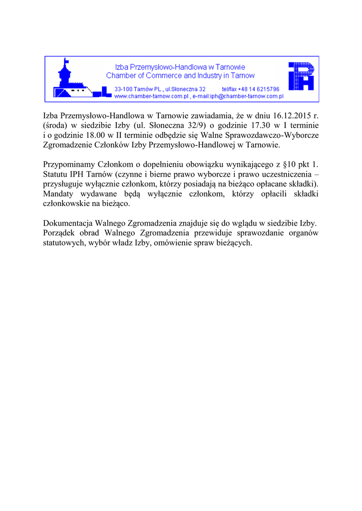 Izba Przemysłowo-Handlowa w Tarnowie zawiadamia, że w dniu 16.12.2015 r. (środa) w siedzibie Izby (ul. Słoneczna 32/9) o godzinie 17.30 w I terminie i o godzinie 18.00 w II terminie odbędzie się Walne Sprawozdawczo-Wyborcze Zgromadzenie Członków Izby Przemysłowo-Handlowej w Tarnowie. Przypominamy Członkom o dopełnieniu obowiązku wynikającego z §10 pkt 1. Statutu IPH Tarnów (czynne i bierne prawo wyborcze i prawo uczestniczenia – przysługuje wyłącznie członkom, którzy posiadają na bieżąco opłacane składki). Mandaty wydawane będą wyłącznie członkom, którzy opłacili składki członkowskie na bieżąco. Dokumentacja Walnego Zgromadzenia znajduje się do wglądu w siedzibie Izby. Porządek obrad Walnego Zgromadzenia przewiduje sprawozdanie organów statutowych, wybór władz Izby, omówienie spraw bieżących.