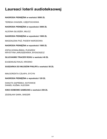 Laureaci loterii audioteksowej NAGRODA PIENIĘŻNA w wartości 5000 ZŁ TERESA CHUDZIK, CZĘSTOCHOWA NAGRODA PIENIĘŻNA w wysokości 3000 ZŁ ALDONA GŁUSZEK, MILICZ NAGRODA PIENIĘŻNA w wysokości 1000 ZŁ MAGDALENA PAŹ, PADEW NARODOWA NAGRODA PIENIĘŻNA w wysokości 1000 ZŁ ZOFIA KOWALIŃSKA, PLESZEW KRYSTYNA JARUSZEWSKA, BYDGOSZCZ SŁUCHAWKI TRACER ROHU o wartości 40 ZŁ EUGENIUSZ RAUS, KROSNO SUSZARKA DO WŁOSÓW PHILIPS o wartości 50 ZŁ MAŁGORZATA CZŁAPA, SYCYN NAGRODA PIENIĘŻNA o wysokości 120 ZŁ DANUTA GAPIŃSKA, KATOWICE DANIEL KUŹMA, KLEOSIN KINO DOMOWE SAMSUNG o wartości 250 ZŁ ZDZISŁAW GARA, SKIDZIŃ 1/1
