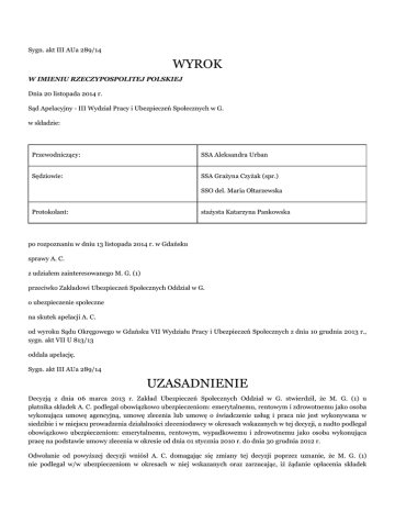 Sygn. akt III AUa 289/14 WYROK W IMIENIU RZECZYPOSPOLITEJ POLSKIEJ Dnia 20 listopada 2014 r. Sąd Apelacyjny - III Wydział Pracy i Ubezpieczeń Społecznych w G. w składzie: Przewodniczący: SSA Aleksandra Urban Sędziowie: SSA Grażyna Czyżak (spr.) SSO del. Maria Ołtarzewska Protokolant: stażysta Katarzyna Pankowska po rozpoznaniu w dniu 13 listopada 2014 r. w Gdańsku sprawy A. C. z udziałem zainteresowanego M. G. (1) przeciwko Zakładowi Ubezpieczeń Społecznych Oddział w G. o ubezpieczenie społeczne na skutek apelacji A. C. od wyroku Sądu Okręgowego w Gdańsku VII Wydziału Pracy i Ubezpieczeń Społecznych z dnia 10 grudnia 2013 r., sygn. akt VII U 813/13 oddala apelację. Sygn. akt III AUa 289/14 UZASADNIENIE Decyzją z dnia 06 marca 2013 r. Zakład Ubezpieczeń Społecznych Oddział w G. stwierdził, że M. G. (1) u płatnika składek A. C. podlegał obowiązkowo ubezpieczeniom: emerytalnemu, rentowym i zdrowotnemu jako osoba wykonująca umowę agencyjną, umowę zlecenia lub umowę o świadczenie usług i praca nie jest wykonywana w siedzibie i w miejscu prowadzenia działalności zleceniodawcy w okresach wskazanych w tej decyzji, a nadto podlegał obowiązkowo ubezpieczeniom: emerytalnemu, rentowym, wypadkowemu i zdrowotnemu jako osoba wykonująca pracę na podstawie umowy zlecenia w okresie od dnia 01 stycznia 2010 r. do dnia 30 grudnia 2012 r. Odwołanie od powyższej decyzji wniósł A. C. domagając się zmiany tej decyzji poprzez uznanie, że M. G. (1) nie podlegał w/w ubezpieczeniom w okresach w niej wskazanych oraz zarzucając, iż żądanie opłacenia składek emerytalnych i rentowych za ubezpieczonego w okresach przypadających po dniu 31 października 2000 r. jest nieuzasadnione, bez podstawy prawnej i wbrew woli stron umowy zlecenia. W uzasadnieniu płatnik podniósł, że M. G. (1) był zatrudniony w Agencji przed dniem wejścia w życie ustawy z dnia 13 października 1998 r. o systemie ubezpieczeń społecznych. Zgodnie zaś z obowiązującymi przepisami osoba mająca ustalone prawo do renty lub emerytury, która zawarła umowę zlecenia w okresie do dnia 13 stycznia 2000 r., z tytułu wykonywania pracy na podstawie umowy zlecenia podlega dobrowolnie ubezpieczeniom emerytalnemu i rentowemu. Jeżeli ta osoba przystąpiła do wymienionych ubezpieczeń była obejmowana również ubezpieczeniem wypadkowym, o ile praca ta była wykonywana w siedzibie lub miejscu prowadzenia działalności zleceniodawcy. Zdaniem odwołującego działa tu zasada ochrony praw nabytych przez osoby, które zawarły umowy zlecenia w okresie przed dniem 13 stycznia 2000 r. Ponieważ zainteresowany umowę zlecenia zawarł przed tym dniem i nie przystąpił do dobrowolnego dodatkowego ubezpieczenia rentowego i emerytalnego, a zatem płatnik składek nie miał obowiązku odprowadzenia składek za wyżej wymienionego od dnia 01 listopada 2000 r., kiedy zakończył pracę w Urzędzie Gminy w K.. Ponadto wnioskodawca zarzucił, że roszczenia organu rentowego uległy częściowemu przedawnieniu. W odpowiedzi na odwołanie organ rentowy wniósł o jego oddalenie, wezwanie do udziału w sprawie w charakterze zainteresowanego M. G. (1) oraz o zasądzenie od skarżącego płatnika na rzecz tego organu kosztów postępowania, w tym kosztów zastępstwa procesowego według norm przepisanych. W uzasadnieniu ZUS/Oddział w G. wskazał, że do dnia 30 października 2000 r. M. G. (1) podlegał obowiązkowym ubezpieczeniom społecznym z tytułu umowy o pracę w Urzędzie Gminy w K., w związku z czym do tej daty z tytułu umowy zlecenia podlegał jedynie ubezpieczeniu zdrowotnemu, jednakże od dnia 01 listopada 2000 r. nie posiadając innego tytułu ubezpieczeń winien być zgłoszony do ubezpieczeń społecznych z tytułu umowy zlecenia. Od dnia 09 sierpnia 2004 r. M. G. (1) nabył prawo do emerytury, a w odniesieniu do osoby mającej ustalone prawo do emerytury lub renty art. 9 ust. 4 lit. a ustawy o systemie ubezpieczeń społecznych przewiduje (od dnia 30 grudnia 1999 roku) obowiązek ubezpieczeń emerytalnego i rentowych z tytułu wykonywania pracy na podstawie umowy zlecenia, jeżeli osoba ta równocześnie nie pozostaje w stosunku pracy (dla której jest to jedyny tytuł do podlegania ubezpieczeniom). W odniesieniu do zarzutu nie uwzględnienia przedawnienia roszczeń pozwany podał, że zaskarżona decyzja nie jest decyzją wymiarową, lecz decyzją rozstrzygająca o obowiązku podlegania ubezpieczeniom społecznym, która dopiero po uprawomocnieniu się da organowi prawo do określenia wysokości zobowiązania. Postanowieniem z dnia 11 kwietnia 2013 r. w sprawie VII U 813/13, ma mocy art. 477 (11) § 1 i 2 k.p.c., Sąd Okręgowy w Gdańsku VII Wydział Pracy i Ubezpieczeń Społecznych wezwał do udziału w sprawie w charakterze zainteresowanego M. G. (1). Wyrokiem z dnia 10 grudnia 2013 r. w sprawie VII U 813/13 Sąd Okręgowy w Gdańsku VII Wydział Pracy i Ubezpieczeń Społecznych oddalił odwołanie. Podstawę tego rozstrzygnięcia stanowiły następujące ustalenia i rozważania Sądu I instancji: M. G. (1) w okresie od dnia 16 października 1989 r. do dnia 31 października 2000 r. był zatrudniony w urzędzie Gminy K. w pełnym wymiarze czasu pracy. Zainteresowany w okresie od dnia 05 listopada 1992 r. do dnia 31 grudnia 2012 r., w tym w okresach: - od dnia 01 listopada 2000 r. do dnia 01 kwietnia 2002 r., - od dnia 11 kwietnia 2002 r. do dnia 20 czerwca 2002 r., - od dnia 28 czerwca 2002 r. do dnia 01 sierpnia 2002 r., - od dnia 10 sierpnia 2002 r. do dnia 22 sierpnia 2002 r., - od dnia 29 sierpnia 2002 r. do dnia 21 października 2002 r., - od dnia 30 października 2002 r. do dnia 01 grudnia 2002 r., - od dnia 11 grudnia 2002 r. do dnia 01 kwietnia 2003 r., - od dnia 11 kwietnia 2003 r. do dnia 10 czerwca 2003 r., - od dnia 21 czerwca 2003 r. do dnia 01 sierpnia 2003 r., - od dnia 10 sierpnia 2003 r. do dnia 01 października 2003 r., - od dnia 10 października 2003 r. do dnia 10 c
