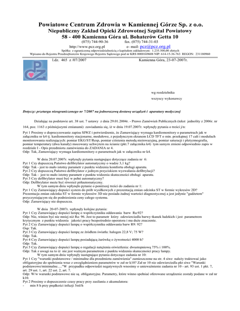 Powiatowe Centrum Zdrowia w Kamiennej Górze Sp. z o.o. Niepubliczny Zakład Opieki Zdrowotnej Szpital Powiatowy 58 - 400 Kamienna Góra ul. Bohaterów Getta 10 (075) 744-90-36 http://www.pcz.org.pl fax. (075) 744-31-03 e- mail: [email protected] Spółka z ograniczoną odpowiedzialnością z kapitałem zakładowym: 1.235.500,00 złotych Wpisano do Rejestru Przedsiębiorców Krajowego Rejestru Sądowego pod nr KRS 0000169608 NIP: 614-15-36-763 REGON: 231180960 l.dz. 465 z /07/2007 Kamienna Góra, 23-07-2007r. wg rozdzielnika wszyscy wykonawcy Dotyczy: przetargu nieograniczonego nr 7/2007 na jednorazową dostawę urządzeń i aparatury medycznej Działając na podstawie art. 38 ust. 7 ustawy z dnia 29.01.2004r. - Prawo Zamówień Publicznych (tekst jednolity z 2006r. nr 164, poz. 1163 z późniejszymi zmianami) zawiadamia się, iŜ w dniu 19.07.2007r. wpłynęły pytania o treści j/n: Pyt 1 Prosimy o doprecyzowanie zapisu SIWZ i potwierdzenie, Ŝe Zamawiający wymaga kardiomonitory o parametrach jak w załączniku nr k4 tj. kardiomonitory stacjonarne, modułowe, z pojedynczym ekranem LCD TFT o min. przekątnej 17 cali i modułach monitorowania realizujących: pomiar EKG/ST/Resp, pomiar ciśnienia metodą nieinwazyjną, pomiar saturacji i pletyzmografia, pomiar temperatury (dwa kanały) mocowany uchwytem na ścianie (pkt.7 załącznika k4) tym samym zmieni odpowiednio zapis w rozdziale I - Opis przedmiotu zamówienia do ZADANIA nr 4. Odp: Tak, Zamawiający wymaga kardiomonitory o parametrach jak w załączniku nr k4. W dniu 20.07.2007r. wpłynęły pytania następujące dotyczące zadania nr 6: Pyt 1 Czy dopuszczą Państwo defibrylator automatyczny o wadze 3,1 kg? Odp: Tak - jest to mało istotny parametr z punktu widzenia komfortu obsługi aparatu. Pyt 2 Czy dopuszczą Państwo defibrylator z jednym przyciskiem wyzwalania defibrylacji? Odp: Tak - jest to mało istotny parametr z punktu widzenia skuteczności obsługi aparatu. Pyt 3 Czy defibrylator musi być w pełni automatyczny? Odp: Defibrylator moŜe być równieŜ półautomatyczny. W tym samym dniu wpłynęło pytanie o poniŜszej treści do zadania nr 1: Pyt 1 Czy Zamawiający dopuści system do prób wysiłkowych z prezentacją zmian odcinka ST w formie wykresów 2D? Prezentacja zmian odcinka ST w formie wykresów 3D nie posiada Ŝadnej wartości diagnostycznej a jest jedynie "gadŜetem" przyczyniającym się do podniesienia ceny całego systemu. Odp: Zamawiający nie dopuszcza. W dniu 20-07-2007r. wpłynęły kolejne pytania: Pyt 1 Czy Zamawiający dopuści lampę o współczynniku oddawania barw Ra:92? Odp: Nie, winien być nie mniej niŜ Ra: 96. Jest to parametr który odzwierciedla barwy tkanek ludzkich i jest parametrem krytycznym z punktu widzenia jakości pracy bezpośrednio operatora i ma duŜe znaczenie. Pyt 2 Czy Zamawiający dopuści lampę o współczynniku oddawania barw R9: 92? Osp: Tak. Pyt 3 Czy Zamawiający dopuści lampę ze źródłem światła: halogen 22,8 V; 75 W? Odp: Tak. Pyt 4 Czy Zamawiający dopuści lampę posiadającą Ŝarówkę o Ŝywotności 4000 h? Odp: Tak. Pyt 5 Czy Zamawiający dopuści lampę o regulacji natęŜenia oświetlenia: dwustopniową 75% i 100%. Odp: Tak z uwagi na to iŜ nie jest waŜnym parametrem z punktu widzenia skuteczności pracy lampy. W tym samym dniu wpłynęły następujące pytania dotyczące zadania nr 10: Pyt 1 Czy "warunki podstawowe / minimalne dla przedmiotu zamówienia" zamieszczone na str. 4 siwz naleŜy traktować jako obligatoryjne do spełnienia wraz z uwzględnieniem parametrów w zał nr k10? Zał nr 10 nie odzwierciedla pkt siwz "Warunki podstawowe/minimalne....."W przypadku odpowiedzi negatywnych wnosimy o uniewaŜnienie zadania nr 10 - art. 93 ust. 1 pkt. 7, art. 29 ust. 1, art. 22 ust. 2, art. 7. Odp: W/w warunki podstawowe nie są obligatoryjne. Parametry, które winno spełniać oferowane urządzenie zostały podane w zał nr k10. Pyt 2 Prosimy o dopuszczenie czasy pracy przy zasilaniu z akumulatora: min 8 h przy prędkości infuzji 5ml/h - min 3 h przy prędkości 100 ml/h Dostępne na rynku polskim pompy infuzyjne - producentów innych niŜ Kwapisz osiągają maksymalną szybkość podawania płynów 0,1-1500/2000ml/h i praca z akumulatora na obu torach przez min 3 h jest niemoŜliwa pomimo zastosowania akumulatorów o podwyŜszonej trwałości. Odp: Zamawiający nie wymaga parametrów określonych przez pytającego ale dopuszcza równieŜ powyŜsze parametry. Pyt 3 Czy Zamawiający dopuści pompę pracującą w trzech trybach - prędkość, prędkość i objętość oraz objętość i czas? Wnosimy o zmianę treści specyfikacji, tak aby umoŜliwić udział w niniejszym postępowaniu takŜe innym wykonawcom, na zasadach uczciwej konkurencji. Odp: Zamawiający nie wymaga parametrów określonych j/w natomiast dopuszcza takie rozwiązanie. W dniu 20-07.2007r. wpłynęły pytania o poniŜszej treści: Pytanie 1 Czy Zamawiający dopuści inny sprzęt medyczny niŜ aparat Fabius Tiro z monitorem Delta, który na terenie Polski dystrybuuje firma Draeger Polska Sp. z o.o.? Odp: Tak. Pytanie 2 Czy Zamawiający dopuści aparat z moŜliwością awaryjnego zasilania z butli wyłącznie w tlen medyczny ? Odp: Tak. Pytanie 3 Czy Zamawiający dopuści ssak próŜniowy ? Odp: Tak. Pytanie 4 Czy Zamawiający dopuści równie precyzyjne rotametry mechaniczne dwururowe, które podobnie, jak przepływomierze elektroniczne w aparacie Fabius Tiro umoŜliwiają znieczulenia z niskimi i minimalnymi przepływami świeŜych gazów poniŜej 500ml/min a dodatkowo są mniej awaryjne ? Odp: Tak. Pytanie 5 Czy Zamawiający dopuści aparat bez moŜliwości eksportu parametrów przepływu do komputera PC ? Opcja ta, występująca w aparatach firmy Draeger między innymi w Fabius Tiro, nie jest w praktyce uŜywana (poza nielicznymi ośrodkami naukowymi w Polsce, które posiadają takie potrzeby), a niewątpliwie wpływa na ponoszone koszty zakupu ? Odp: Tak. Pytanie 6 Czy Zamawiają