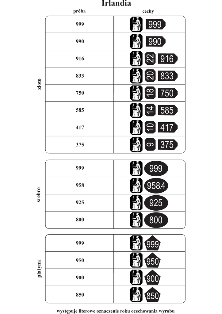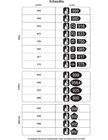 Irlandia próba 990 990 z³oto 833 750 585 417 srebro 375 10 14 18 20 22 999 916 9 999 916 platyna cechy 375 833 750 585 417 999 999 958 958.4 925 925 800 800 999 999 950 950 900 900 850 850 wystêpuje literowe oznaczenie roku ocechowania wyrobu