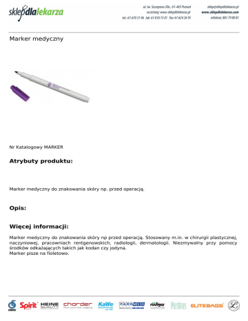 Marker medyczny Nr Katalogowy MARKER Atrybuty produktu: Marker medyczny do znakowania skóry np. przed operacją. Opis: Więcej informacji: Marker medyczny do znakowania skóry np przed operacją. Stosowany m.in. w chirurgii plastycznej, naczyniowej, pracowniach rentgenowskich, radiologii, dermatologii. Niezmywalny przy pomocy środków odkażających takich jak kodan czy jodyna. Marker pisze na fioletowo. Powered by TCPDF (www.tcpdf.org)