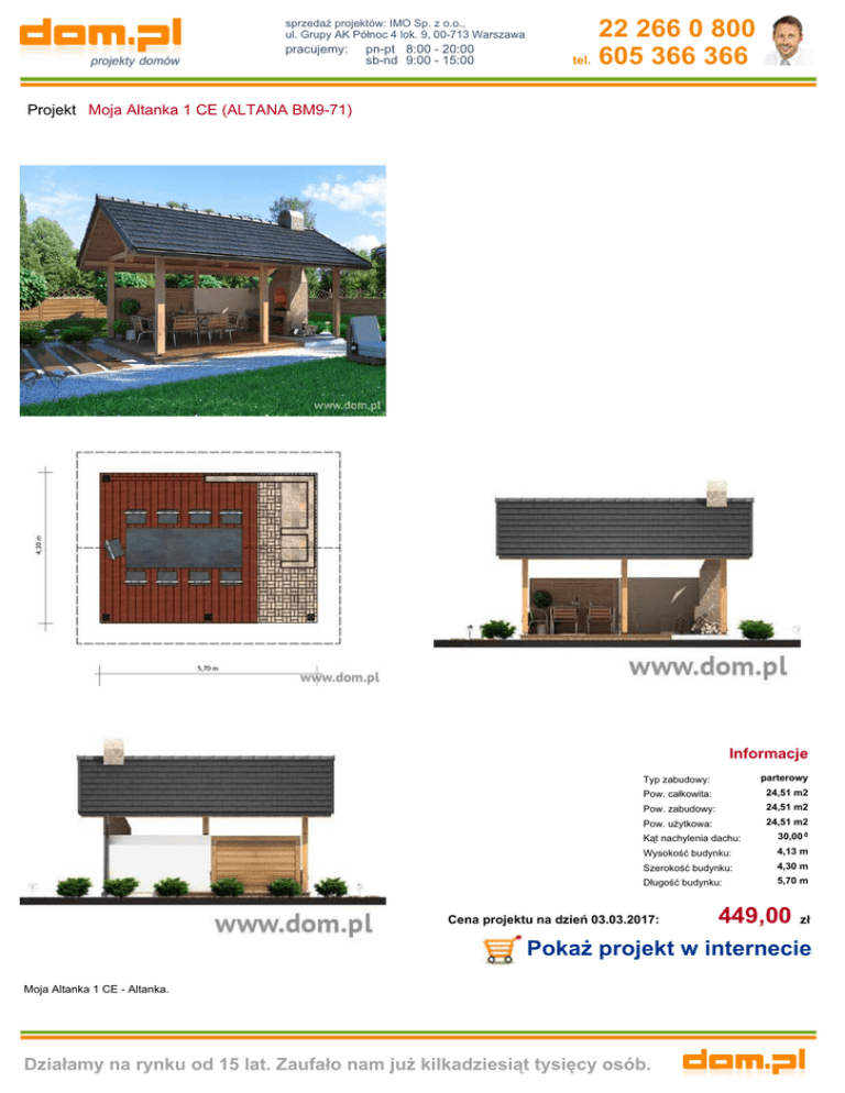 sprzedaż projektów: IMO Sp. z o.o., ul. Grupy AK Północ 4 lok. 9, 00-713 Warszawa pracujemy: pn-pt 8:00 - 20:00 sb-nd 9:00 - 15:00 22 266 0 800 tel. 605 366 366 Projekt Moja Altanka 1 CE (ALTANA BM9-71) Informacje Typ zabudowy: parterowy Pow. całkowita: 24,51 m2 Pow. zabudowy: 24,51 m2 Pow. użytkowa: 24,51 m2 Kąt nachylenia dachu: 30,00 0 Wysokość budynku: 4,13 m Szerokość budynku: 4,30 m Długość budynku: 5,70 m Cena projektu na dzień 03.03.2017: 449,00 zł Pokaż projekt w internecie Moja Altanka 1 CE - Altanka. Działamy na rynku od 15 lat. Zaufało nam już kilkadziesiąt tysięcy osób.