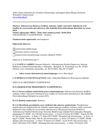 Adres strony internetowej, na której Zamawiający udostępnia Specyfikację Istotnych Warunków Zamówienia: www.ihar.edu.pl Olsztyn: Sukcesywna dostawa środków ochrony roślin i nawozów dolistnych oraz środka do czyszczenia opryskiwaczy dla Zakładu Doświadczalnego Bartążek na sezon 2016 Numer ogłoszenia: 98524 - 2016; data zamieszczenia: 20.04.2016 OGŁOSZENIE O ZAMÓWIENIU - dostawy Zamieszczanie ogłoszenia: obowiązkowe. Ogłoszenie dotyczy: V zamówienia publicznego zawarcia umowy ramowej ustanowienia dynamicznego systemu zakupów (DSZ) SEKCJA I: ZAMAWIAJĄCY I. 1) NAZWA I ADRES: Instytut Hodowli i Aklimatyzacji Roślin Państwowy Instytut Badawczy Zakład Doświadczalny w Bartążku , Bartążek, ul. Warmiński Las 46, 10-687 Olsztyn, woj. warmińsko-mazurskie, tel. 89 5418663, faks 89 5118407. Adres strony internetowej zamawiającego: www.ihar.edu.pl I. 2) RODZAJ ZAMAWIAJĄCEGO: Inny: Jednostka Badawczo-Rozwojowa (zakład). SEKCJA II: PRZEDMIOT ZAMÓWIENIA II.1) OKREŚLENIE PRZEDMIOTU ZAMÓWIENIA II.1.1) Nazwa nadana zamówieniu przez zamawiającego: Sukcesywna dostawa środków ochrony roślin i nawozów dolistnych oraz środka do czyszczenia opryskiwaczy dla Zakładu Doświadczalnego Bartążek na sezon 2016. II.1.2) Rodzaj zamówienia: dostawy. II.1.4) Określenie przedmiotu oraz wielkości lub zakresu zamówienia: Przedmiotem zamówienia jest dostarczenie do siedziby zamawiającego środków ochrony roślin, nawozów dolistnych oraz środka do czyszczenia opryskiwaczy dla potrzeb Instytutu Hodowli i Aklimatyzacji Roślin Państwowego Instytutu Badawczego Zakład Doświadczalny Bartążek, obejmujące:I CZĘŚĆ: Jay 250 lub równoważny - w ilości 44 litrów;II CZĘŚĆ: Topsin M 500 SC lub równoważny - w ilości 171 litrów;III CZĘŚĆ: Mospilan lub równoważny - w ilości 12 kg;IV CZĘŚĆ: Boom Efekt 360 SL lub równoważny - w ilości 218 litrów;V CZĘŚĆ: Brafil sklejacz lub równoważny - w ilości 70 litrów;VI CZĘŚĆ: Axial 50 EC lub równoważny - w ilości 108 litrów;VII CZĘŚĆ: Mustang forte lub równoważny - w ilości 194 litrów;VIII CZĘŚĆ: Tilt Turbo 575 EC lub równoważny - w ilości 70 litrów;IX CZĘŚĆ: Moddus 250 EC lub równoważny - w ilości 31 litrów;X CZĘŚĆ: Nawóz dolistny wieloskładnikowy do stosowania w zbożach i w rzepaku, minimalna zawartość składników mineralnych: Zn 4 %, Cu 3 %, B 1,1 %, Fe 0,7 %, Mn 5 %, Mo 0,2 % - w ilości 204 kilogramy;XI CZĘŚĆ: Nawóz dolistny wieloskładnikowy do stosowania w zbożach i w rzepaku, minimalna zawartość składników mineralnych: N 18 %, P 18 %, K 18 %, S 2,8 %, Zn 0,1 %, Cu 0,1 %, B 0,1 %, Fe 0,15 %, Mn 0,15 %, Mg 1,4 %, Mo 0,01 % - w ilości 424 kilogramy;XII CZĘŚĆ: Eps-Top siarczan magnezu lub równoważny - w ilości 1777 kilogramów;XIII CZĘŚĆ: Danadim lub Markiz lub równoważny - w ilości 93 litrów;XIV CZĘŚĆ: Starpro 430 lub równoważny - w ilości 30 litrów;XV CZĘŚĆ: Duett ultra lub równoważny - w ilości 65 litrów;XVI CZĘŚĆ: Afalon Dyspersyjny 450 SC lub równoważny - w ilości 8 kilogramów;XVII CZĘŚĆ: Fusilade Forte 150 EC lub równoważny - w ilości 8 litrów;XVIII CZĘŚĆ: Lontrel 300 SL lub równoważny - w ilości 5 litrów;XIX CZĘŚĆ: Lintur 70 WG lub równoważny - w ilości 2 kilogramy;XX CZĘŚĆ: CCC lub Stabilan - w ilości 228 litrów;XXI CZĘŚĆ: Aminopielik Super lub równoważny - w ilości 48 litrów;XXII CZĘŚĆ: Starane 250 EC lub rów-noważny w ilości 13 litrów;XXIII CZĘŚĆ: Pyrifos 480 EC lub rów-noważny - w ilości 86 litrów;XXIV CZĘŚĆ: Safir 125 S.C. lub Rubric 125 S.C. lub równoważny - w ilości 163 litry;XXV CZĘŚĆ: Galera 334 SL lub równoważny - w ilości 34 litry;XXVI CZĘŚĆ: Leopard Extra 05 EC lub równoważny - w ilości 116 litrów;XXVII CZĘŚĆ: Helm-Lambda 100 CS lub równoważny - w ilości 30 litrów;XXVIII CZĘŚĆ: Brasifun 250 EC lub równoważny - w ilości 28 litrów;XXIX CZĘŚĆ: Bor 15 % - w ilości 192 kilogramów;XXX CZĘŚĆ: Mangan nawóz dolistny, minimalna zawartość manganu 9 % - w ilości 96 litrów;XXXI CZĘŚĆ: Biostymulator na bazie alg morskich, minimalna zawartość wyciągu z alg 15 % - w ilości 299 litrów;XXXII CZĘŚĆ: Cyperkill Max 500 EC lub równoważny - w ilości 5 litrów;XXXIII CZĘŚĆ: Adiuwant lub równoważny - w ilości 31 litrów;XXXIV CZĘŚĆ: Clean speed środek do czyszczenia opryskiwaczy lub równoważny - w ilości 10 litrów;XXXV CZĘŚĆ: Lotus 750 SC lub równoważny - w ilości 32 litrów; Zamawiający podkreśla, iż nazwy własne podane przez zamawiającego w opisie przedmiotu zamówienia są nazwami przykładowymi i winny być interpretowane jako definicje standardów, a nie jako nazwy konkretnych rozwiązań do zastosowania. Zamawiający dopuszcza możliwość oferowania przez wykonawcę produktu równoważnego w stosunku do określonego przez zamawiającego.Przez produkt równoważny zamawiający rozumie towar o takim samym składzie, sposobie działania oraz zastosowaniu co produkt określony przez zamawiającego oraz o takich samych lub lepszych parametrach jakościowych w stosunku do produktu wymaganego przez zamawiającego. Produkt równoważny powinien pochodzić od renomowanego na rynku producenta środków ochrony roślin oraz nawozów dolistnych.Ciężar udowodnienia równoważności produktu spoczywa na wykonawcy. Wykonawca dowiedzie równoważności produktu podając w formularzu ofertowym stanowiącym załącznik nr 1 do SIWZ nazwę produktu równoważnego i dołączając do niego dokumenty potwierdzające tę równoważność. We wskazanych dokumentach wykonawca dokona porównania produktów równoważnego i zamienianego z uwzględnieniem wskazań określonych w 3.1.2.1.1. SIWZ. Produkt równoważny zaoferowany przez wykonawcę musi być dopuszczony do stosowania i obrotu handlowego na terenie Polski zgodnie z obowiązującymi przepisami.Wykonawca udzieli zamawiającemu na dostarczone nawozy dolistne, środ